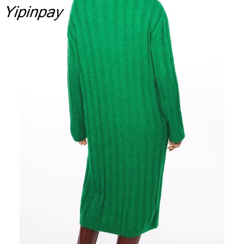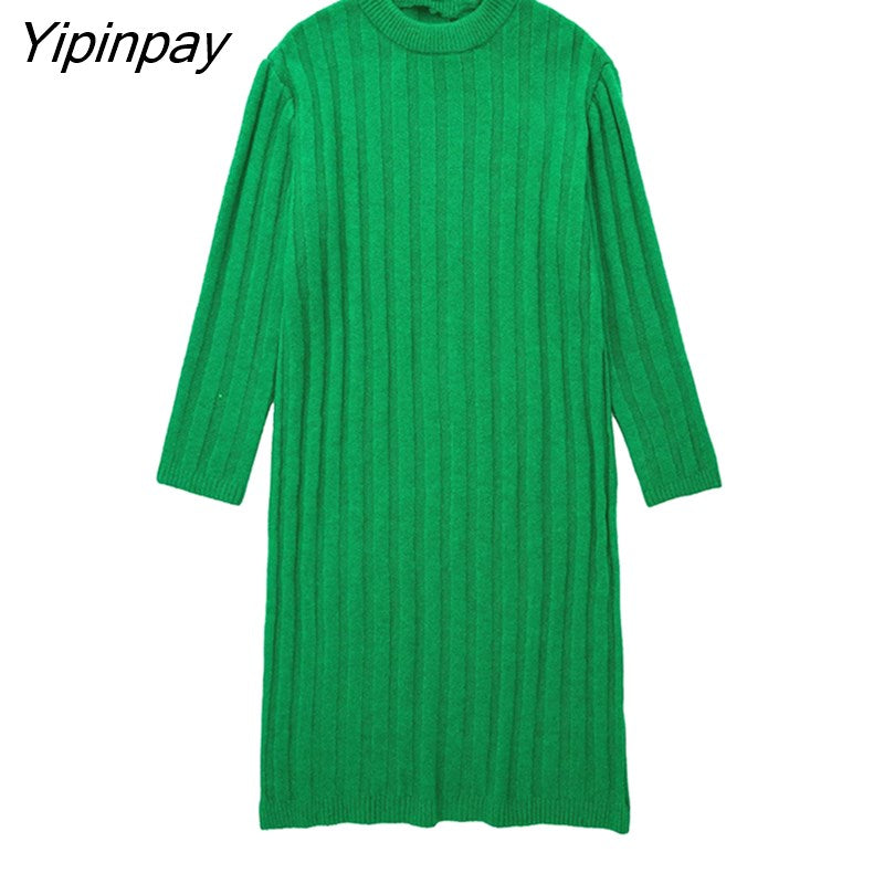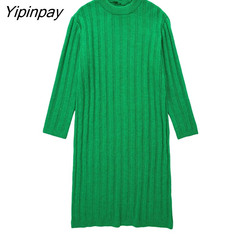 Yipinpay Warm Women Green Mid-Calf Kintted Dresses 2023 Autumn Elegant O-neck Dresses Vintage Simple Long Sleeve Vestidos