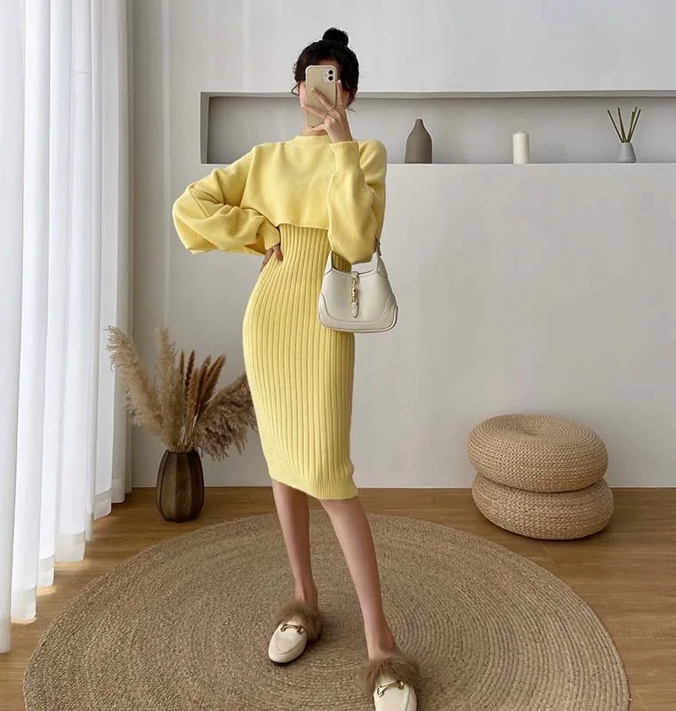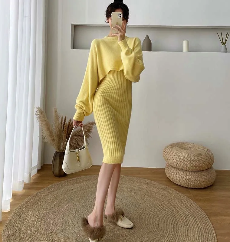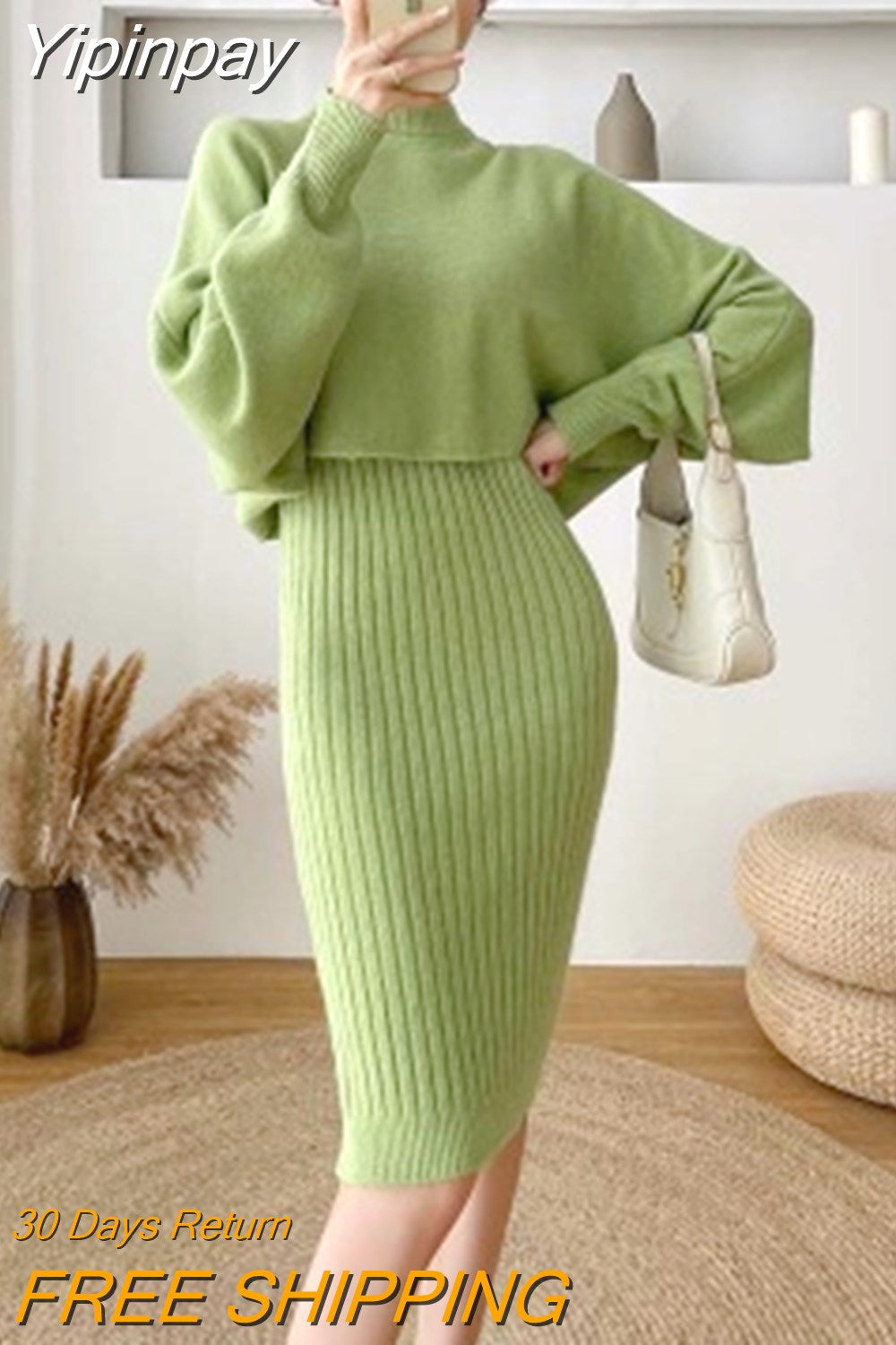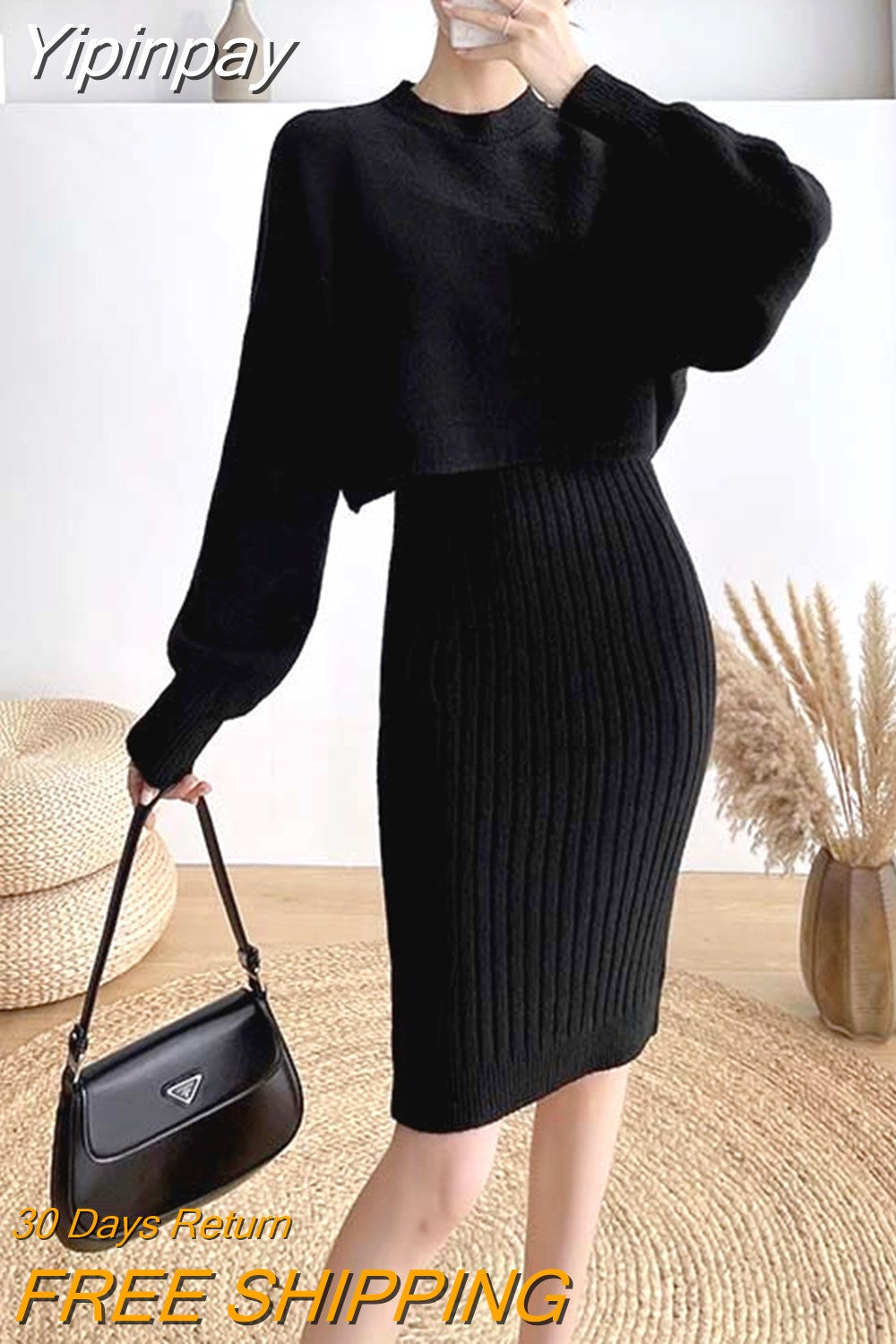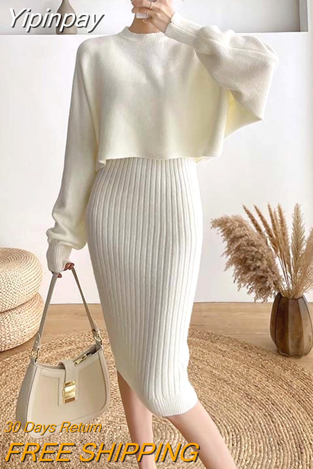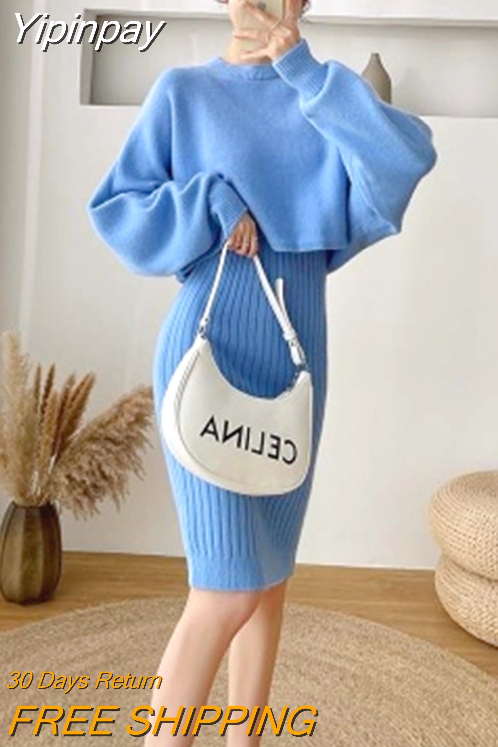 Yipinpay Winter Sweater Dress Two Piece Women Fashion New Office Ladies Sets Knitted Pullover Sweater + Vest Dress