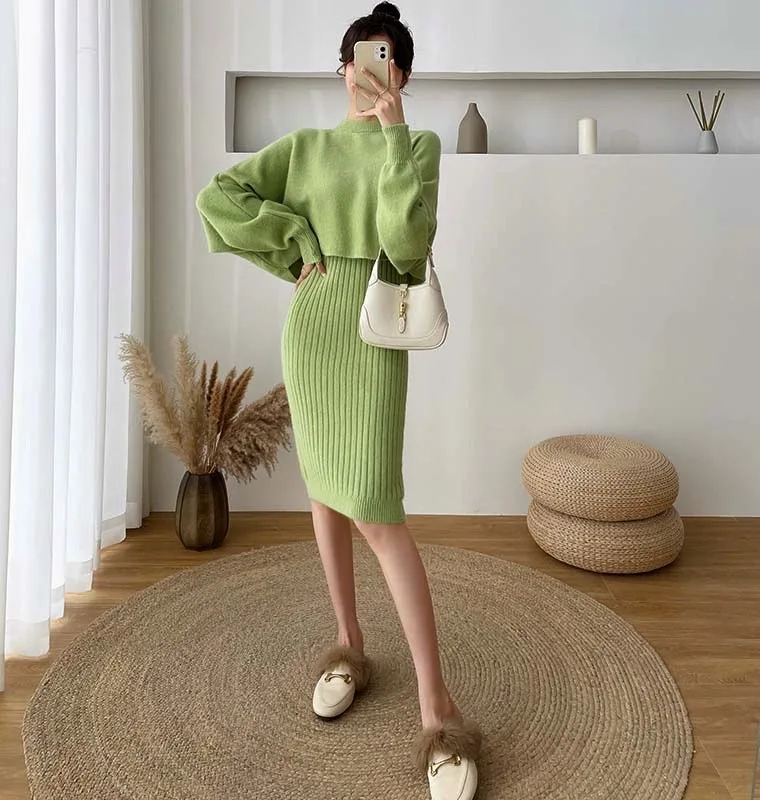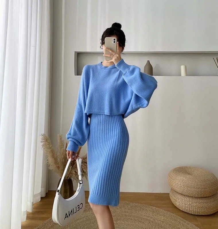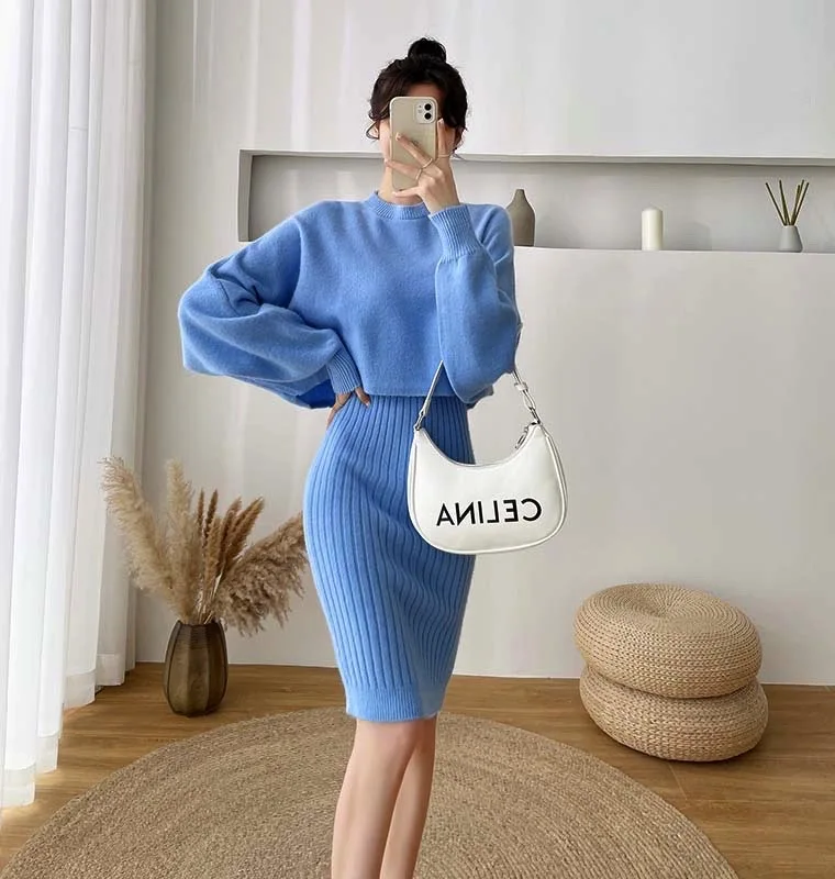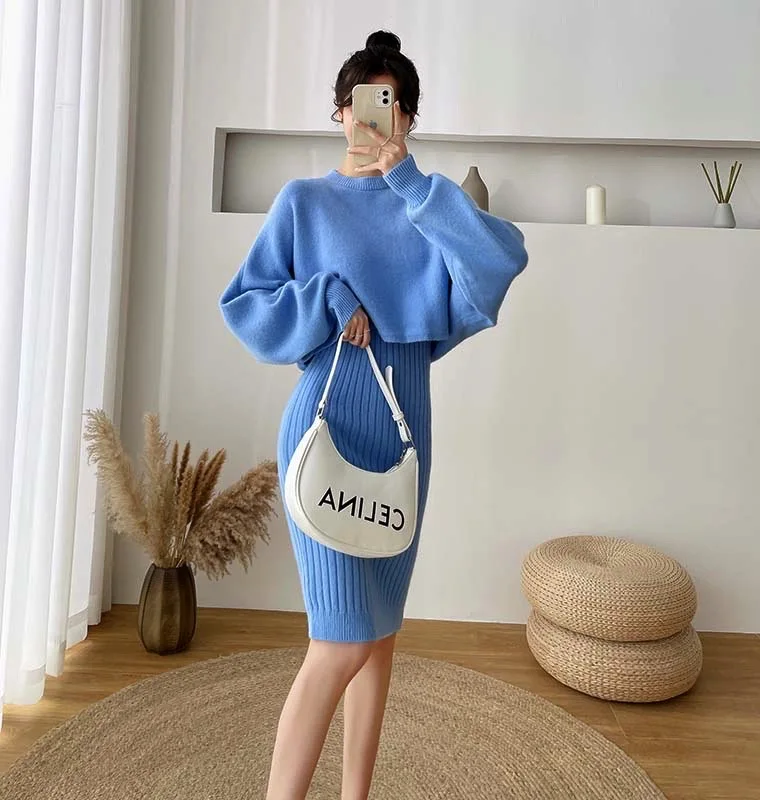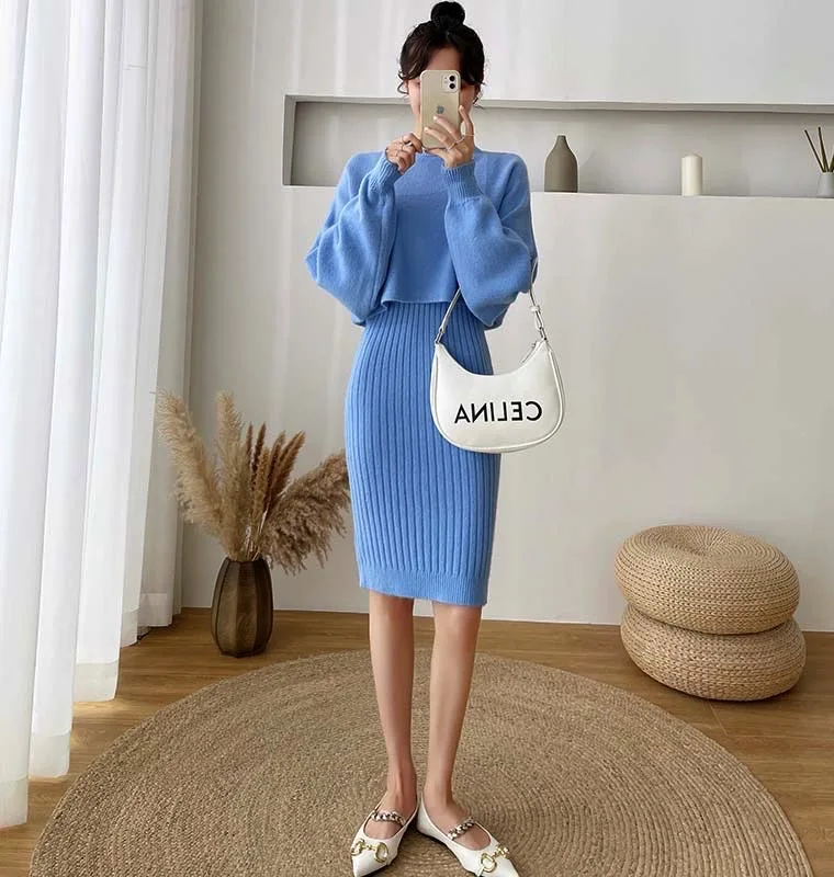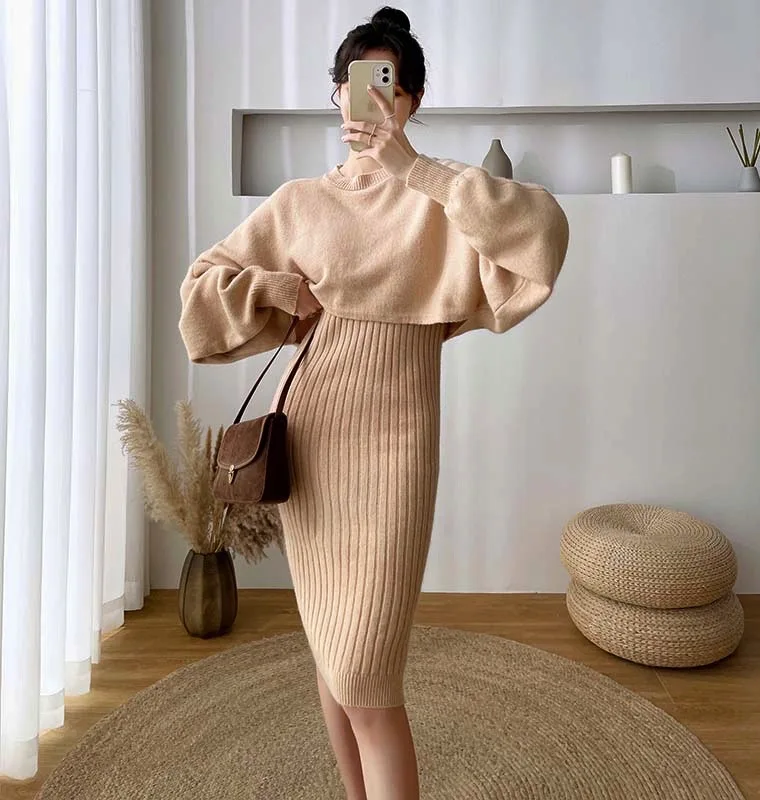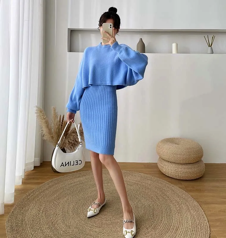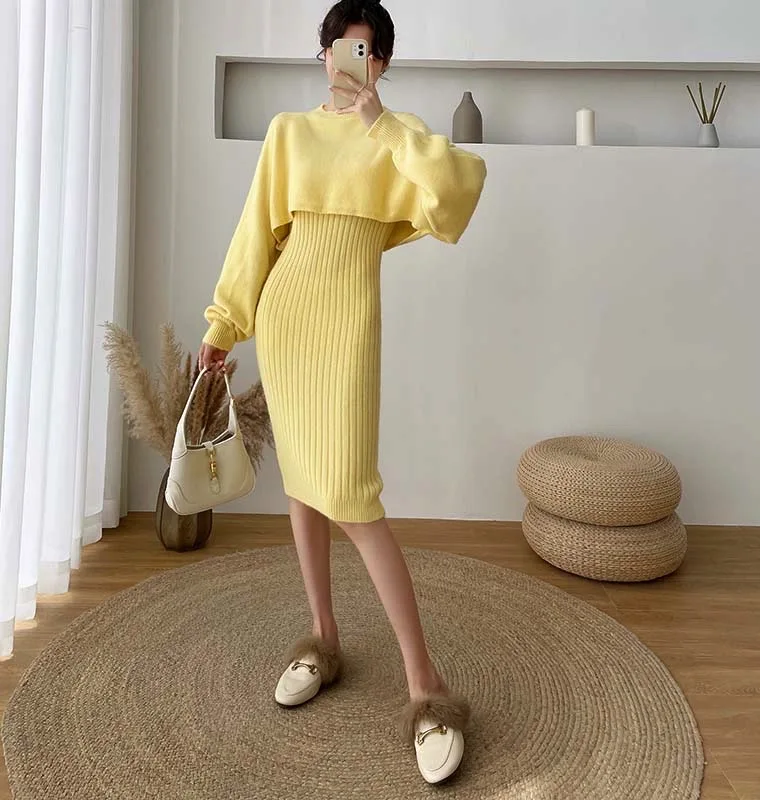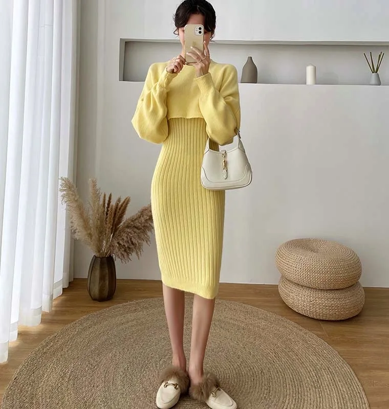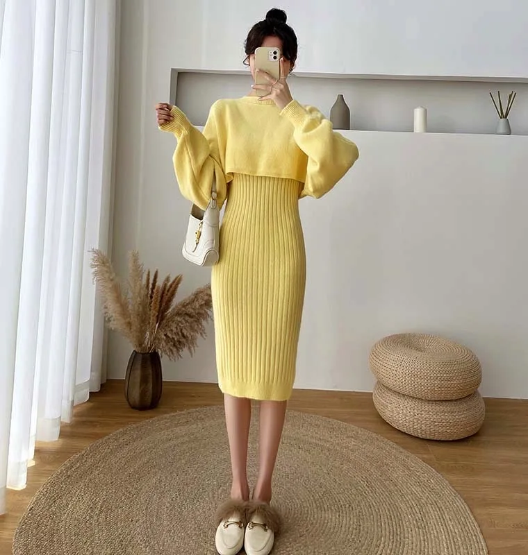 Yipinpay Winter Sweater Dress Two Piece Women Fashion New Office Ladies Sets Knitted Pullover Sweater + Vest Dress