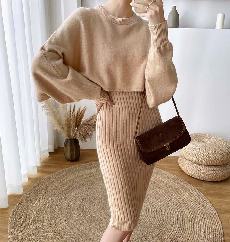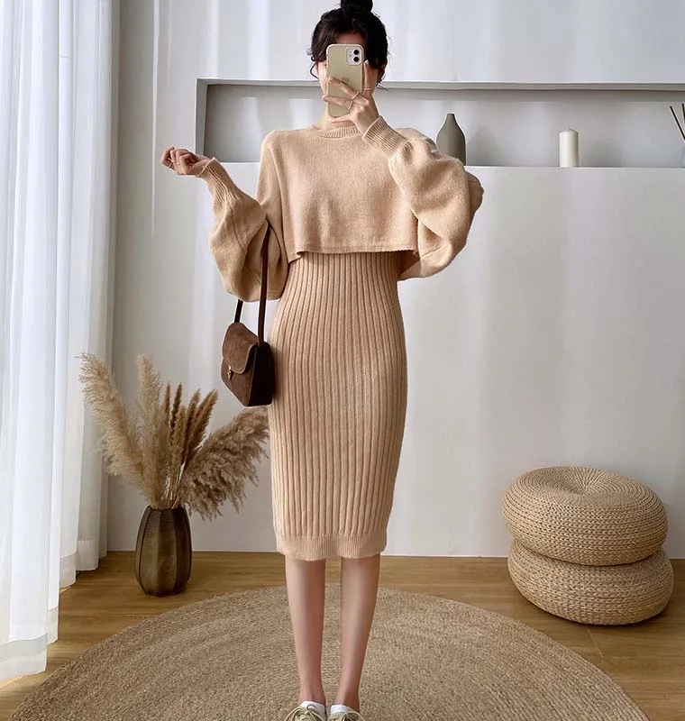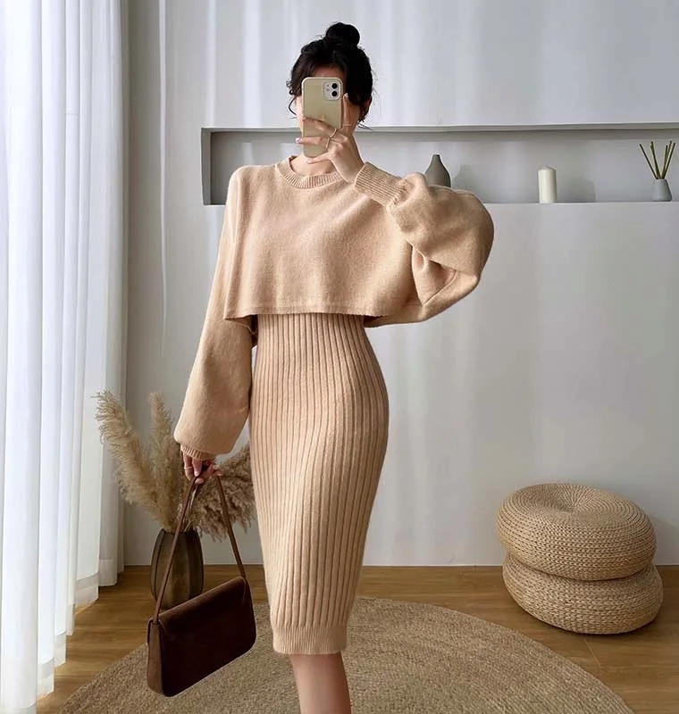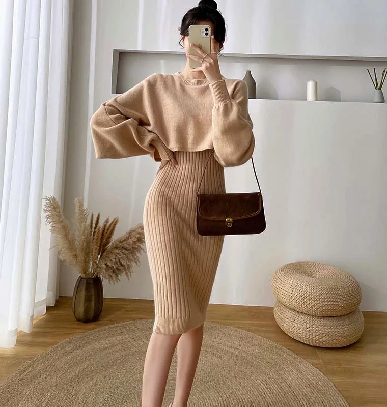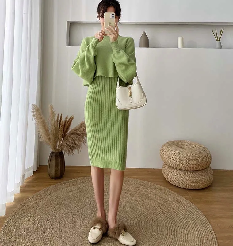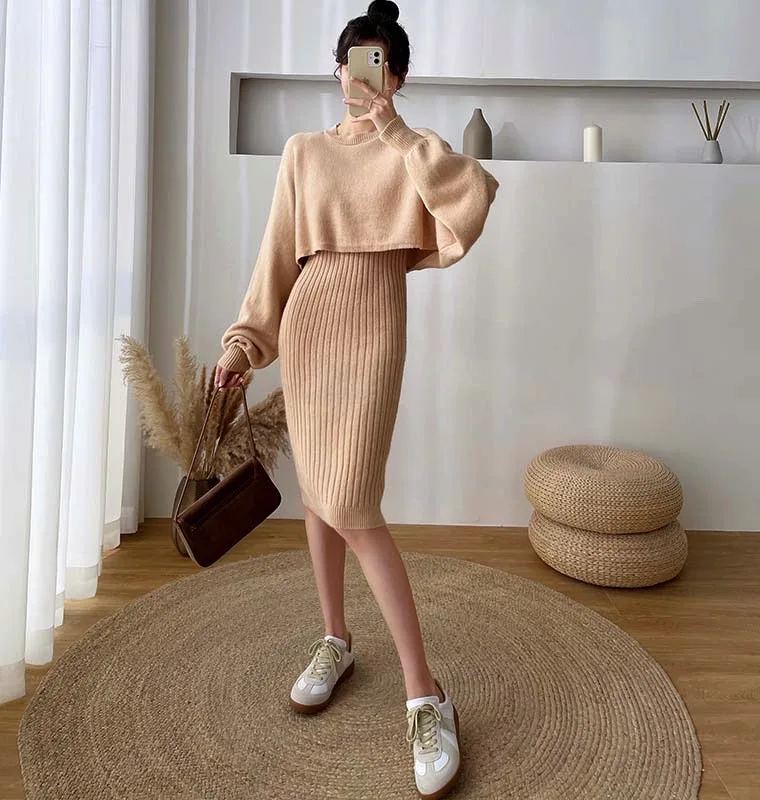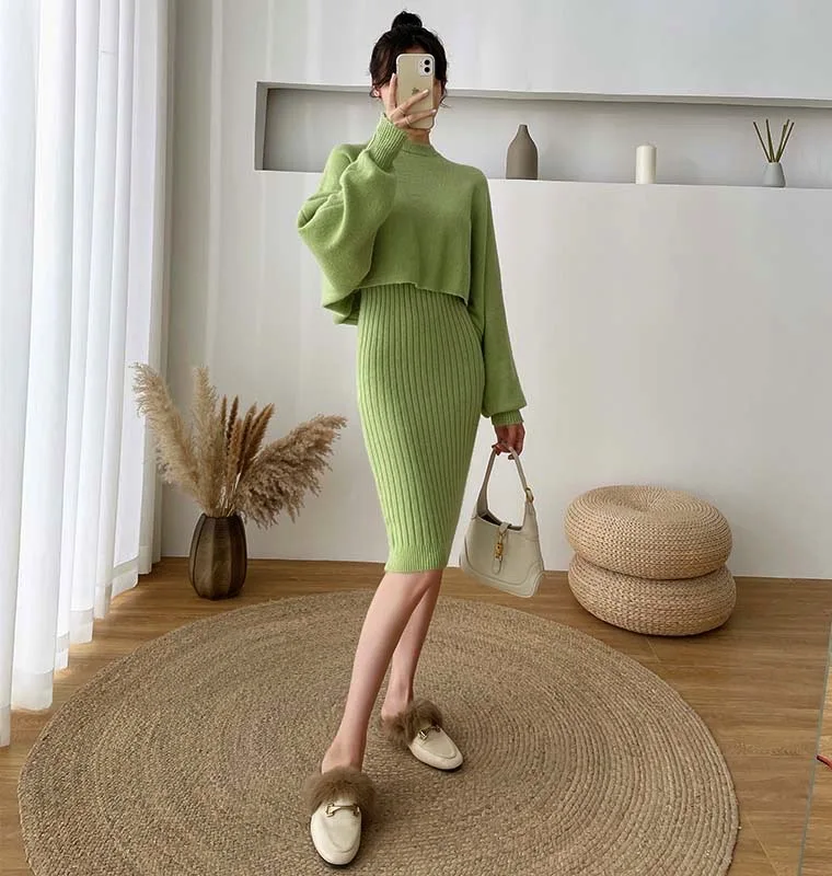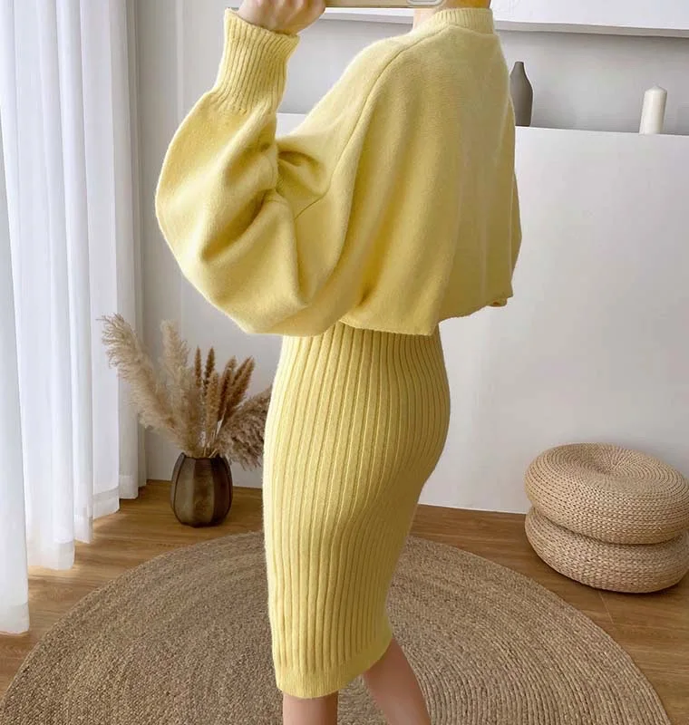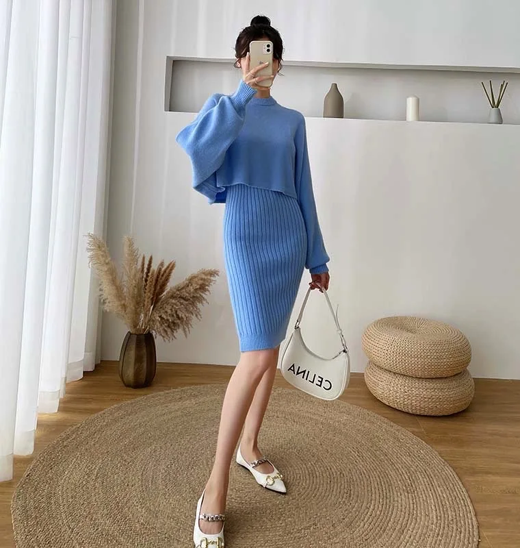 Yipinpay Winter Sweater Dress Two Piece Women Fashion New Office Ladies Sets Knitted Pullover Sweater + Vest Dress