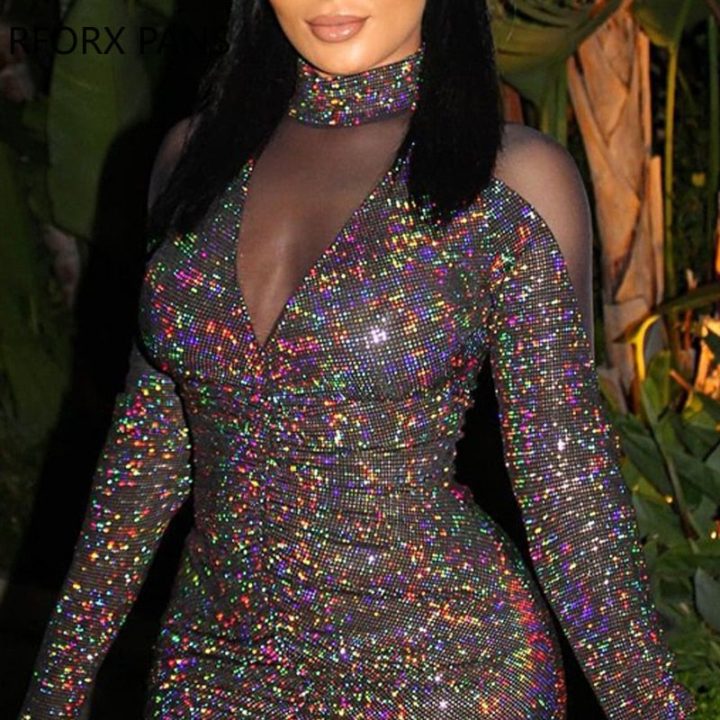 Yipinpay Women Chic Long Sleeves Turtleneck Sequins Patchwork Mesh Bodycon Sexy Mini Party Dress