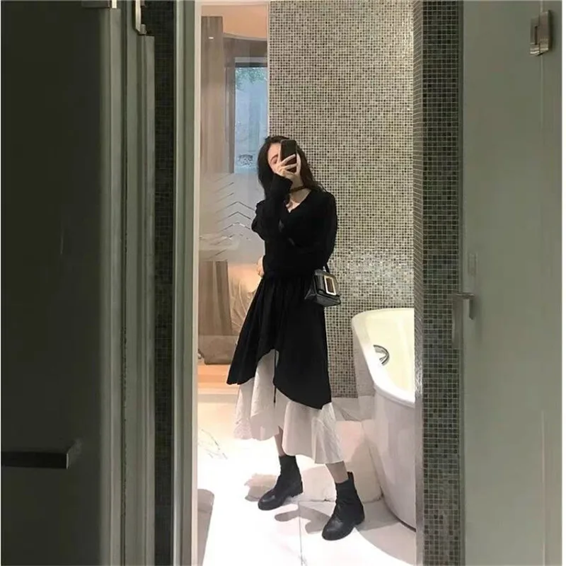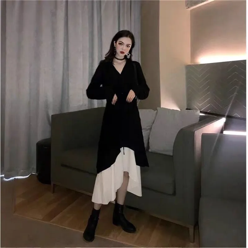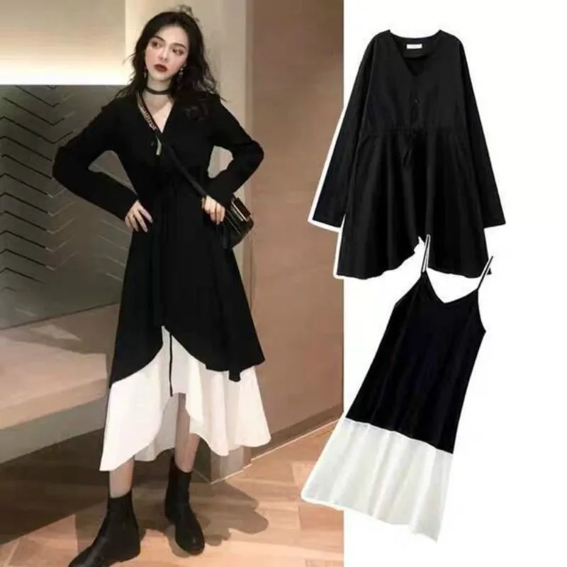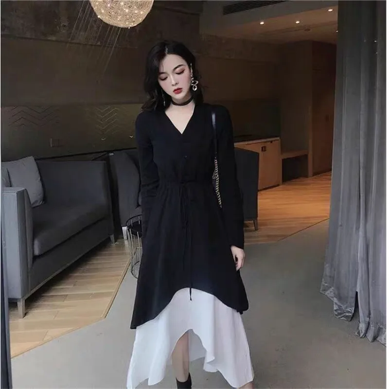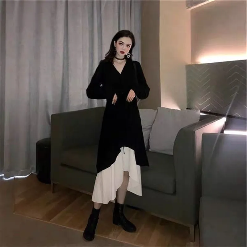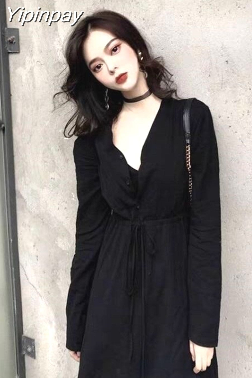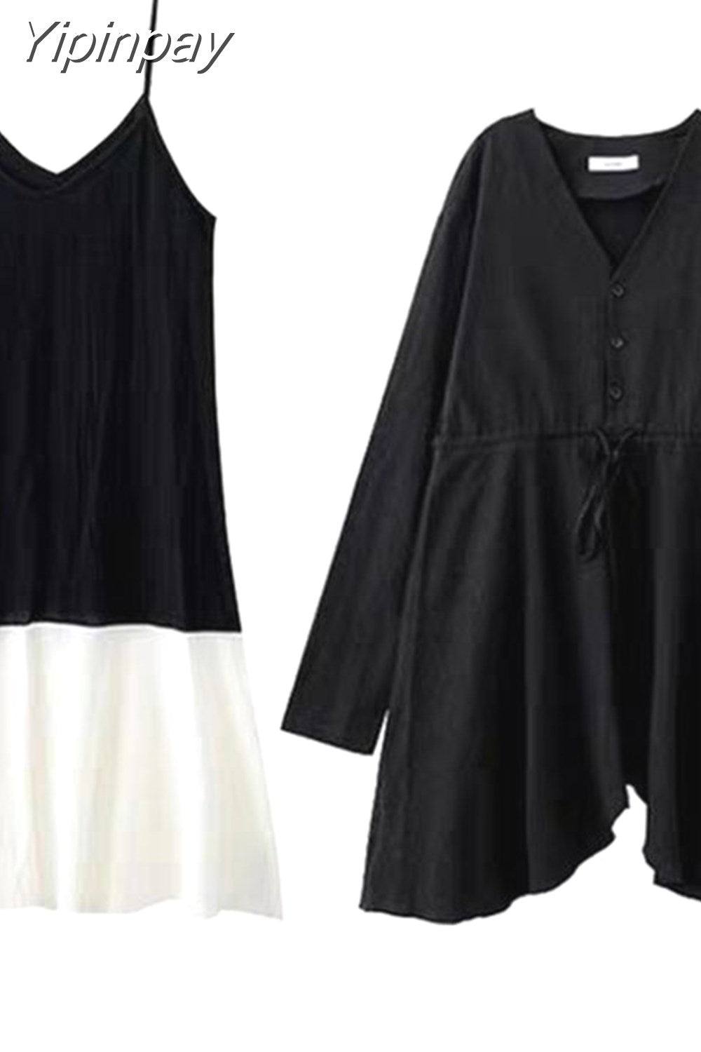 Yipinpay Women dress Oversize Two piece set Korean style Fashion Long female bing Patchwork Long sleeve Black dress 2023 HOT