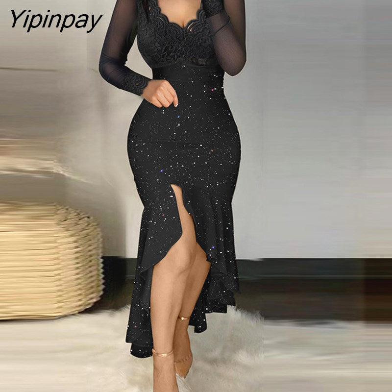 Yipinpay Women Glitter V Neck Lace Patch Asymmetrical Mermaid Bodycon Formal Party Sexy Midi Dress
