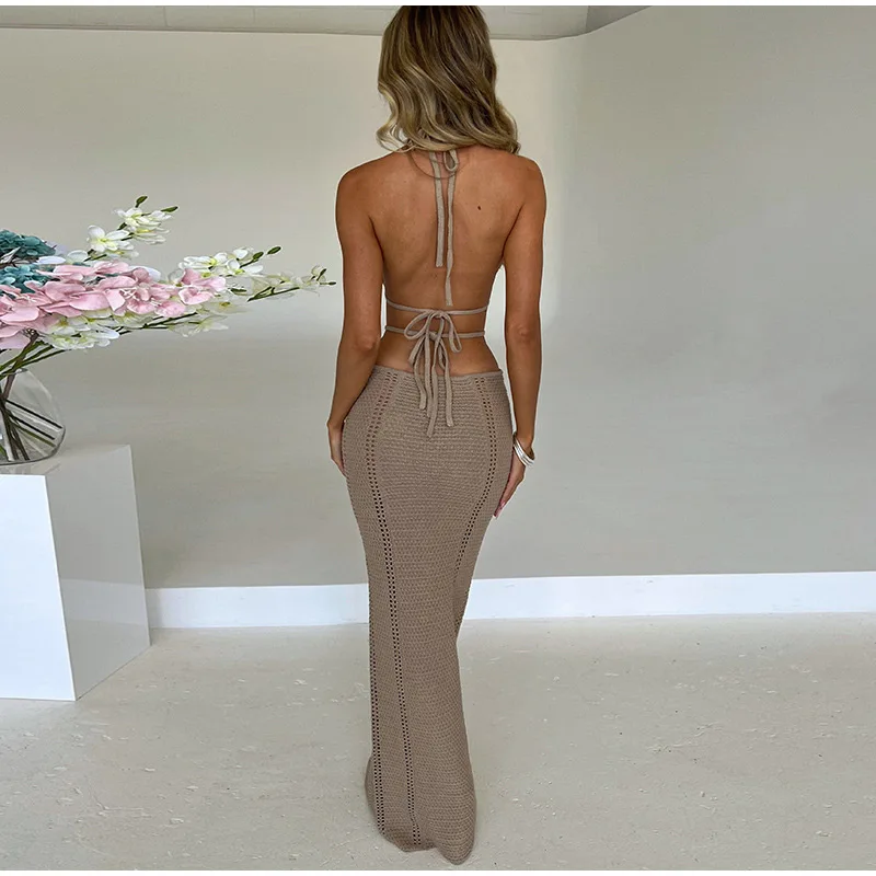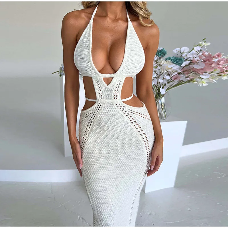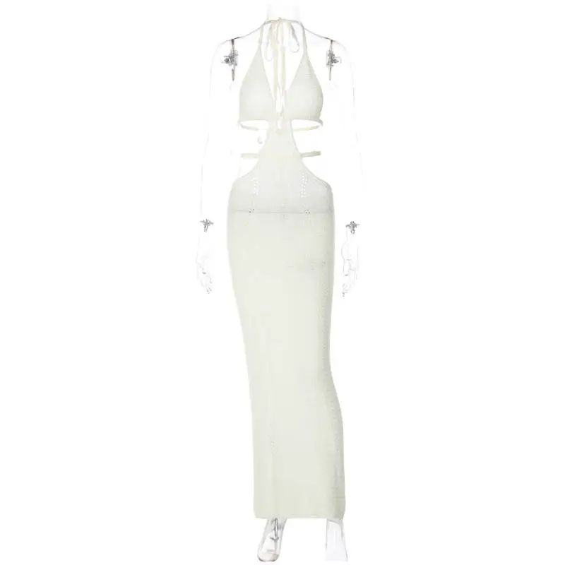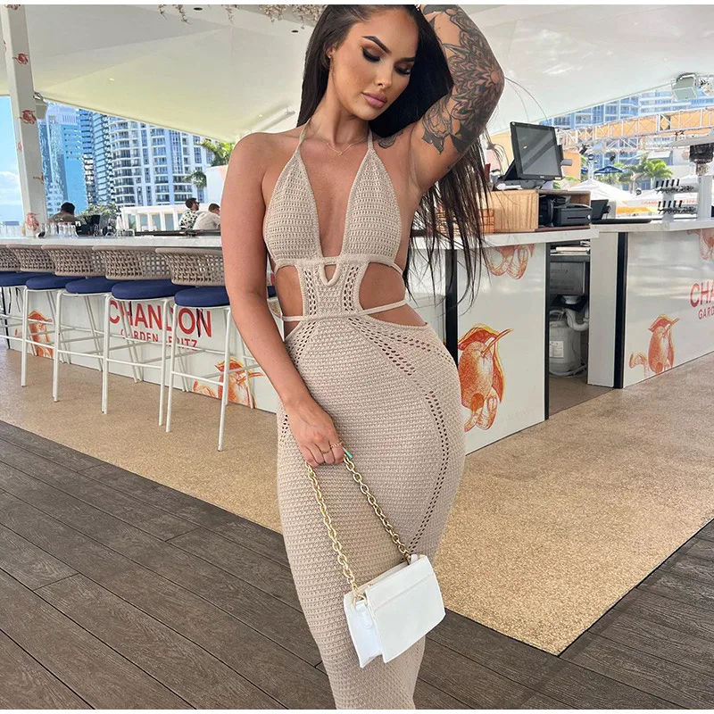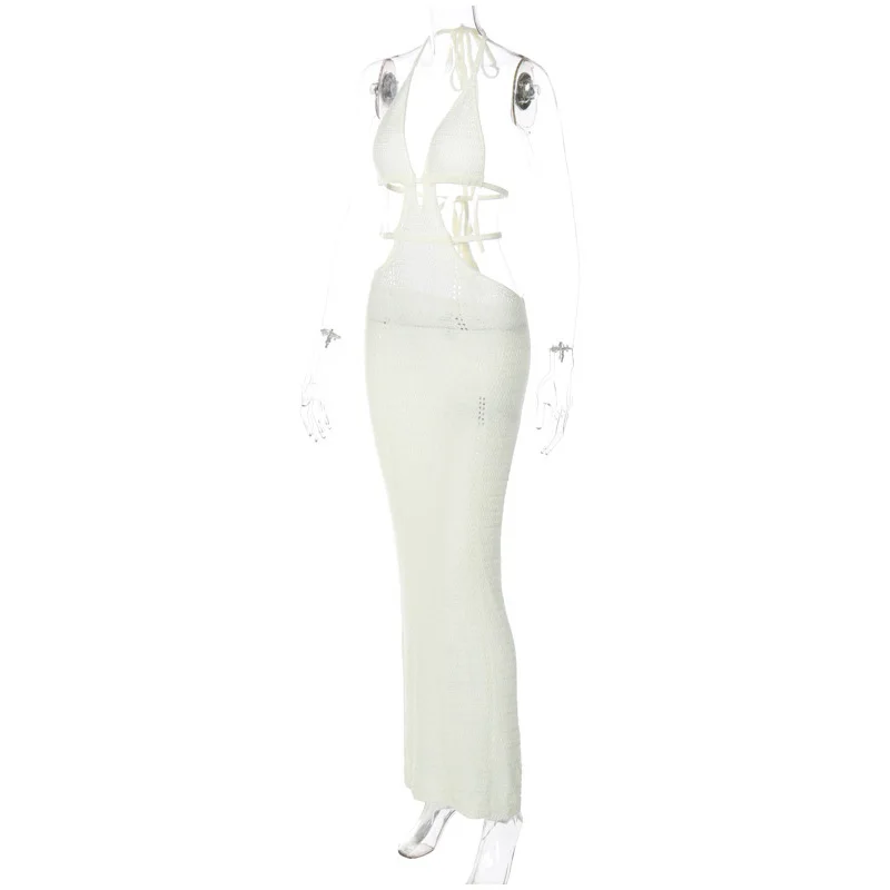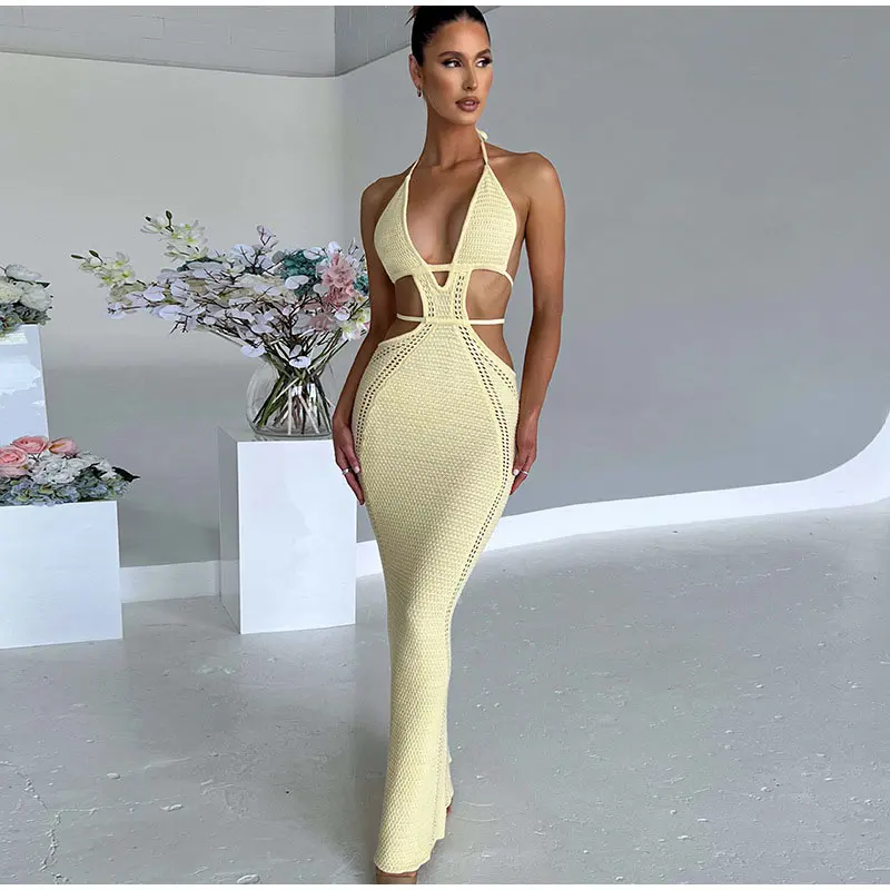Yipinpay Women Knitting Backless Halter Maxi Dress 2023 New Bodycon Hollow Out Lace Up Hips Dresses Elegant Beach Backless Vestidos