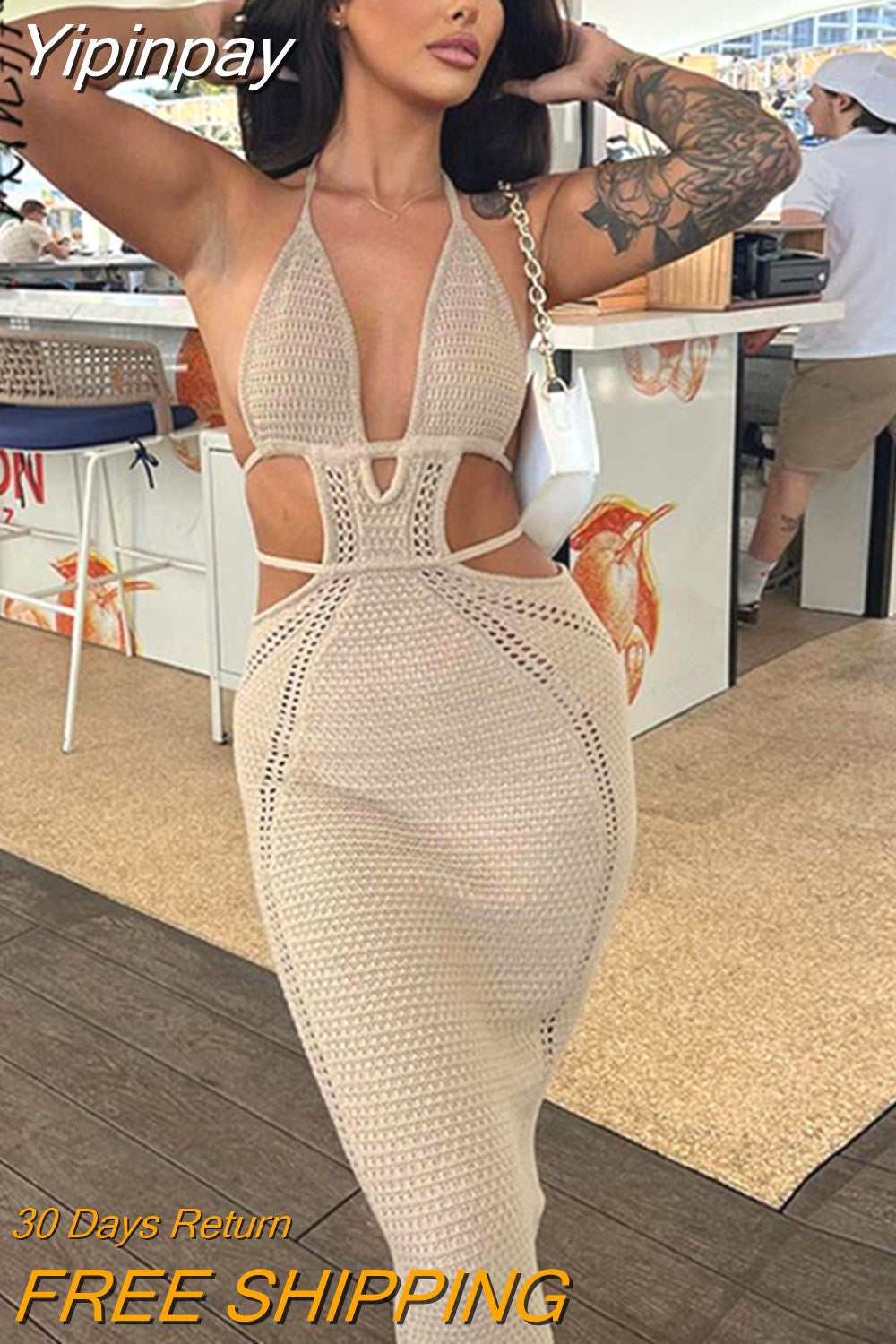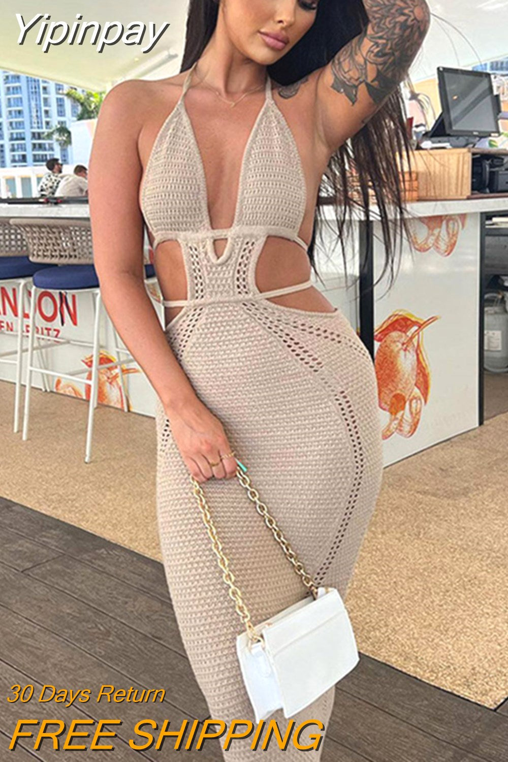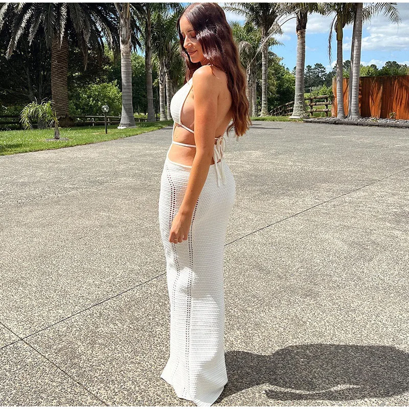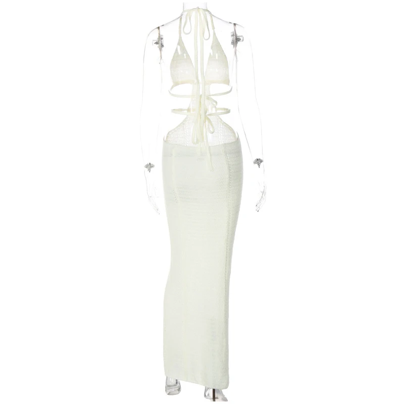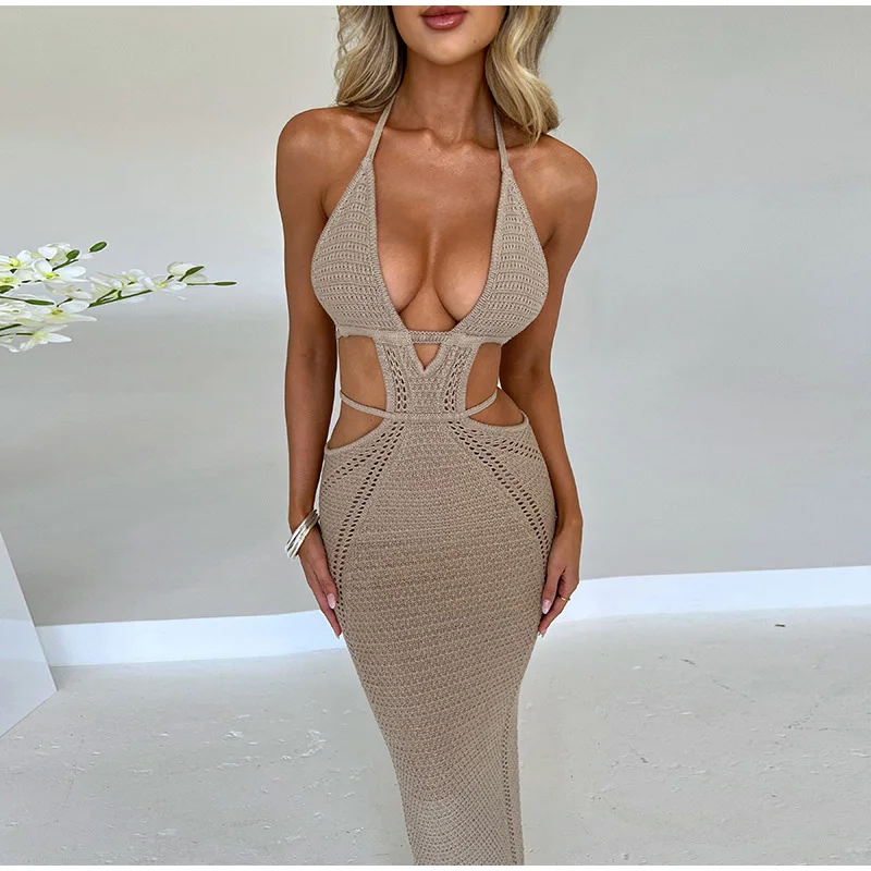 Yipinpay Women Knitting Backless Halter Maxi Dress 2023 New Bodycon Hollow Out Lace Up Hips Dresses Elegant Beach Backless Vestidos