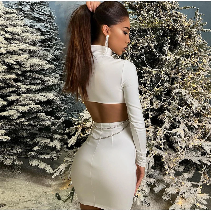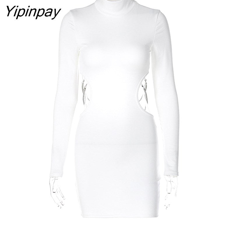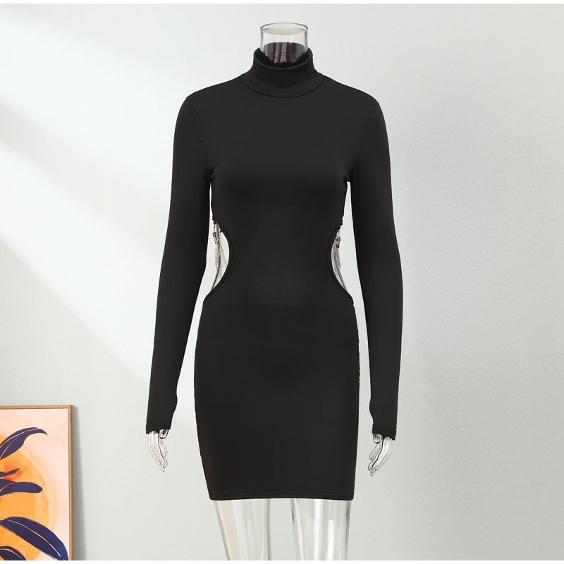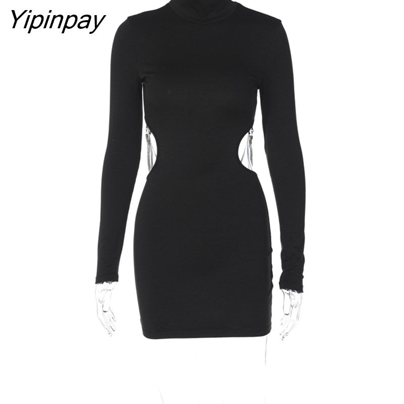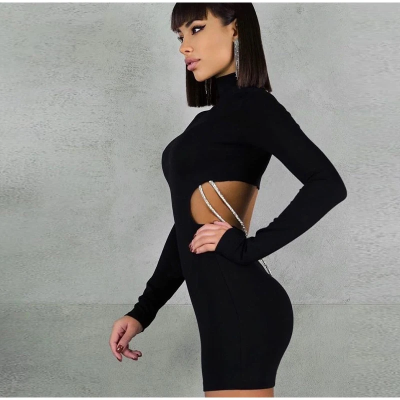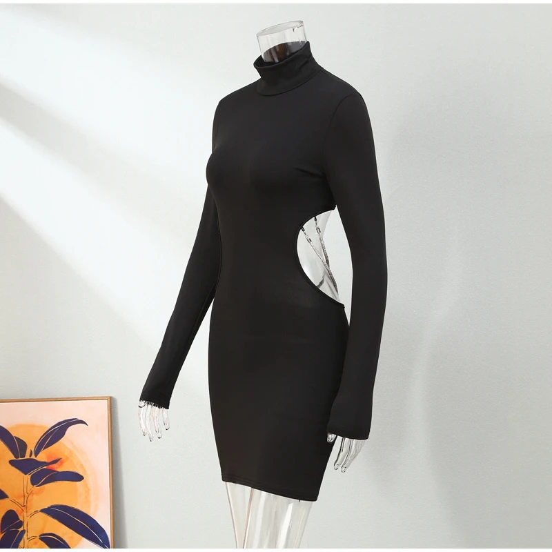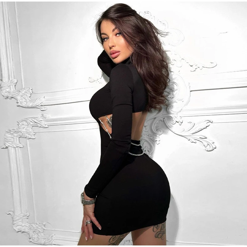 Yipinpay Women Long Sleeve Bodycon Hollow Out Mini Dress Solid Sexy Backless Slim High Neck Dress 2023 Autumn Party Club Christmas Dress