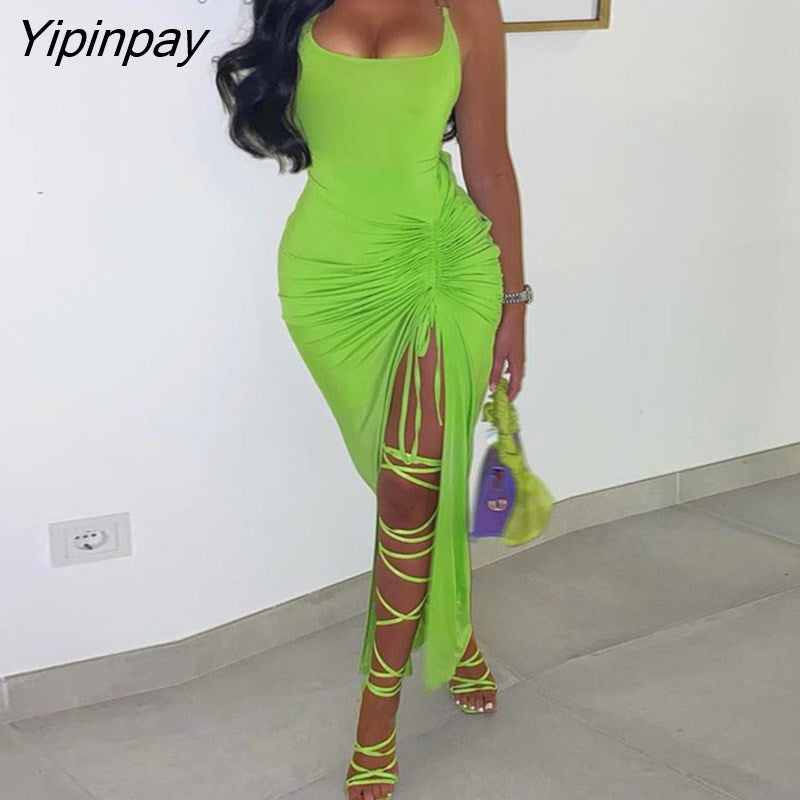 Yipinpay Women Solid Skinny Chain Halter Ruched High Silt Party Sexy Dress