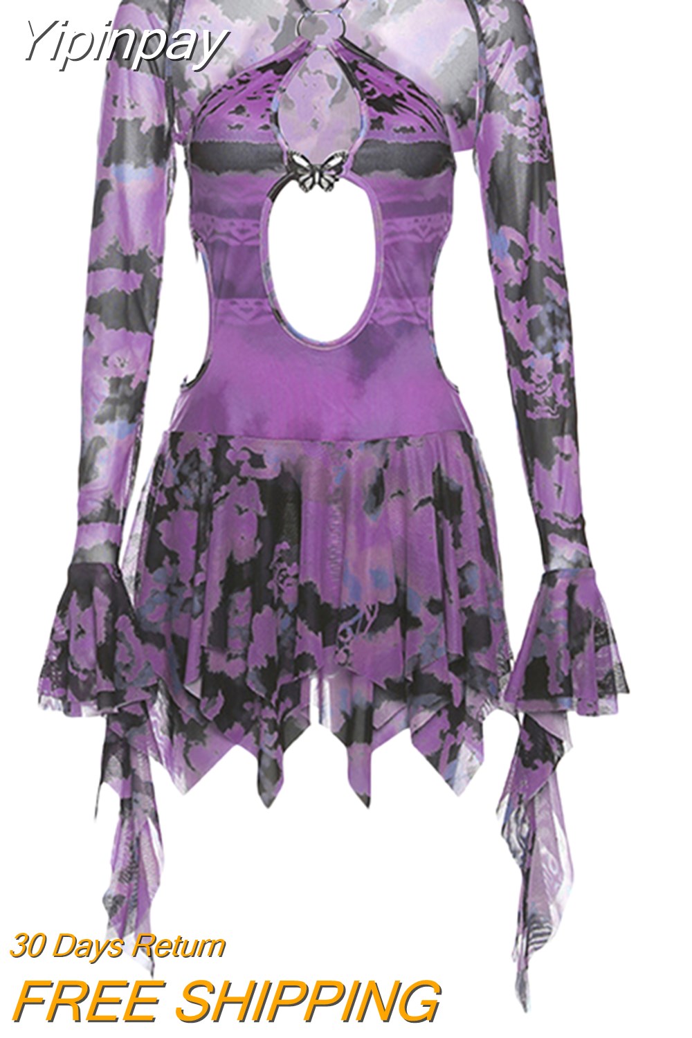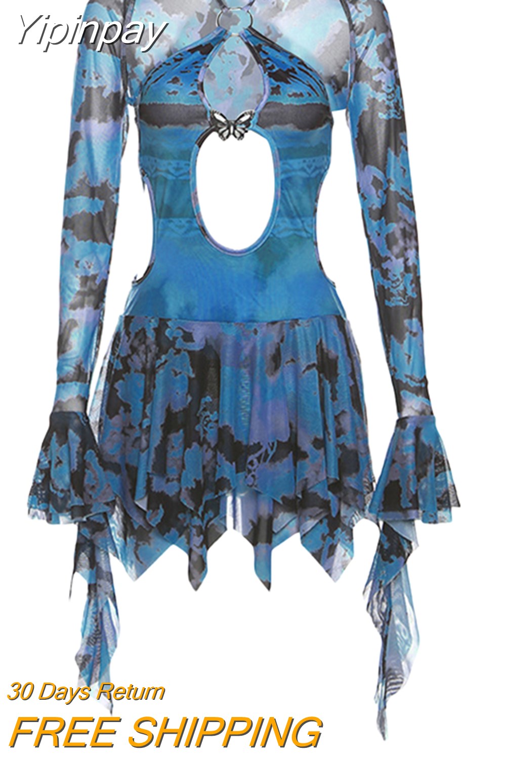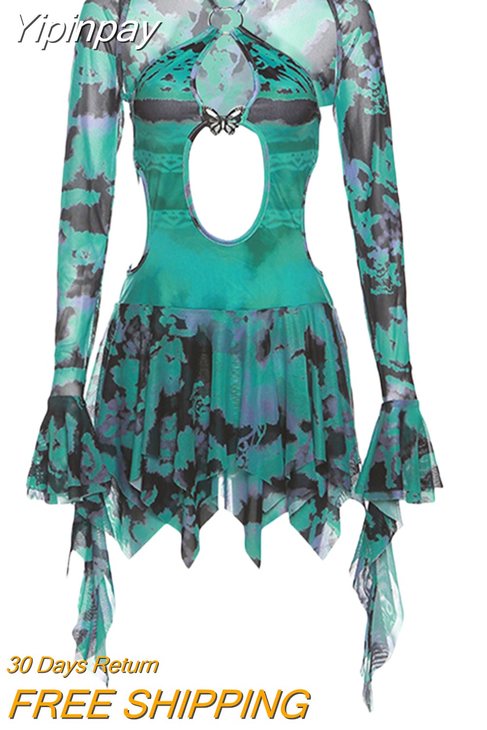 Yipinpay Women Summer Y2K 2Pcs Sleeveless Tie-Dye Print Cutout Backless Ruffled Party Mini Dress + Long Flare Sleeve Shrug Set
