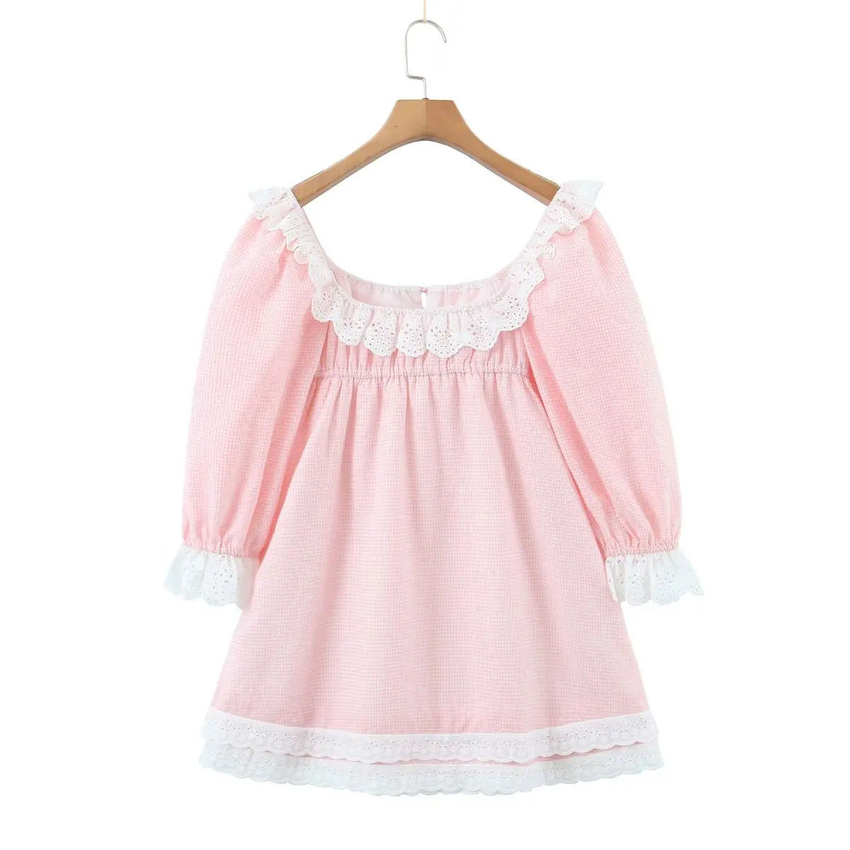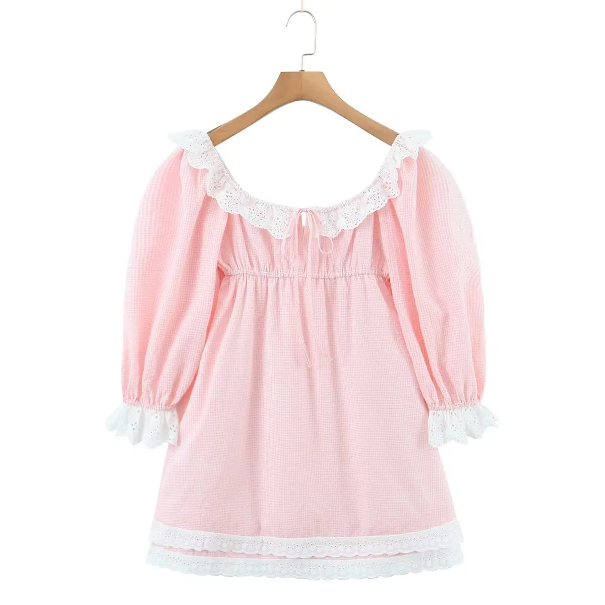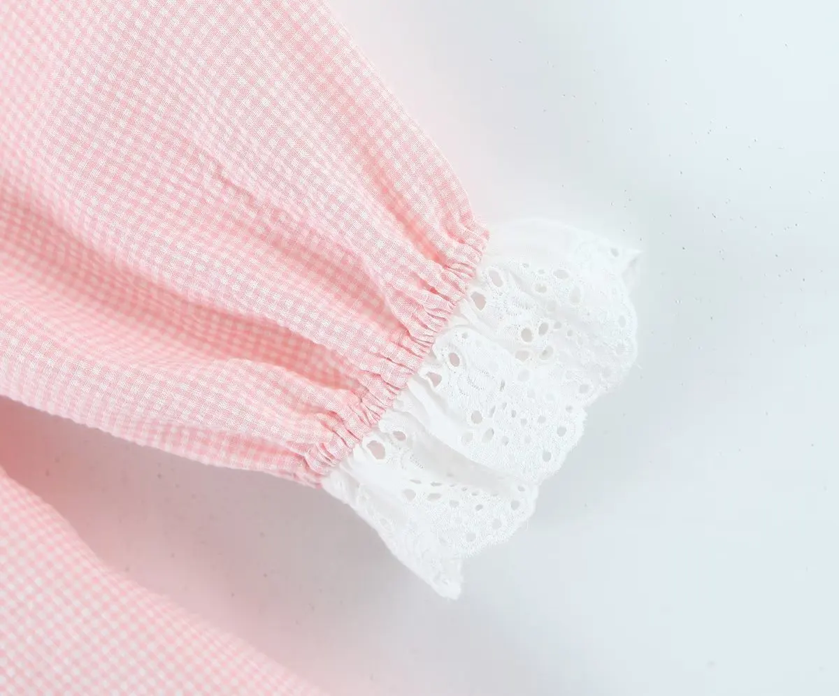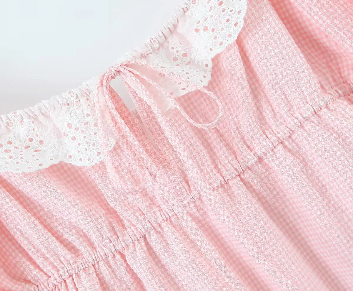 Yipinpay Women Sweet Lace Trim Plaid Dress Vintage Lantern Sleeve Sexy Collar Female Casual Holiday Mini Dress