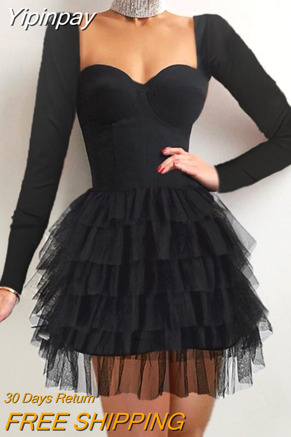 Yipinpay Women's Mesh Dress Elegant Long Sleeve/Off-Shoulder High Waist Tulle Tutu A-Line Dress Formal Party Ladies Solid Color Vestido 920