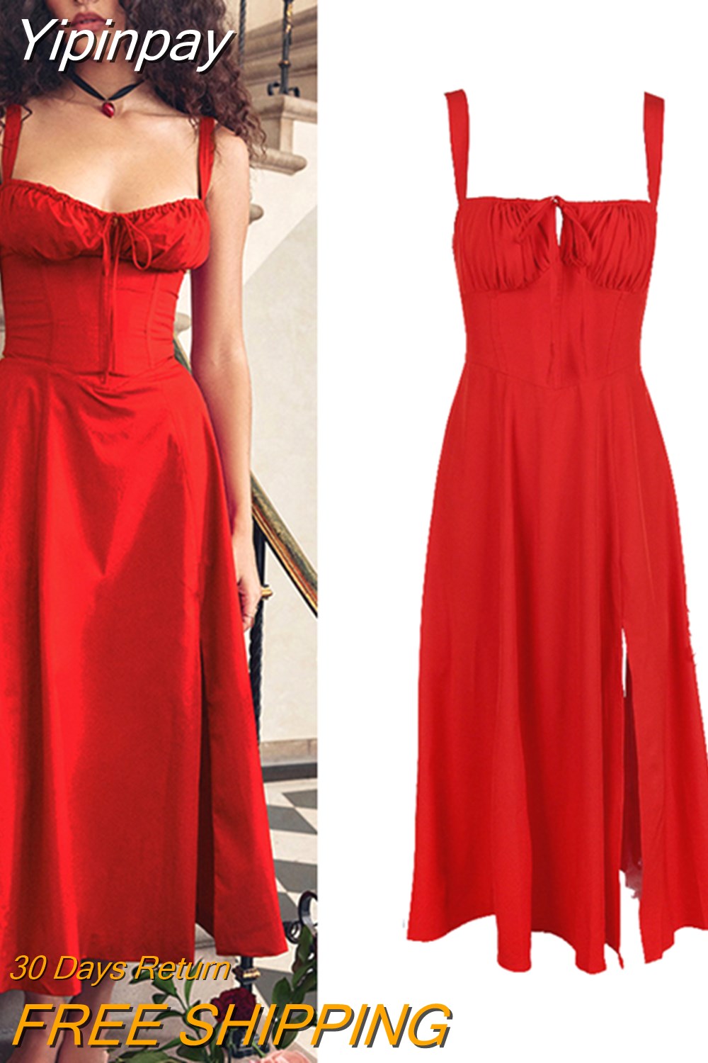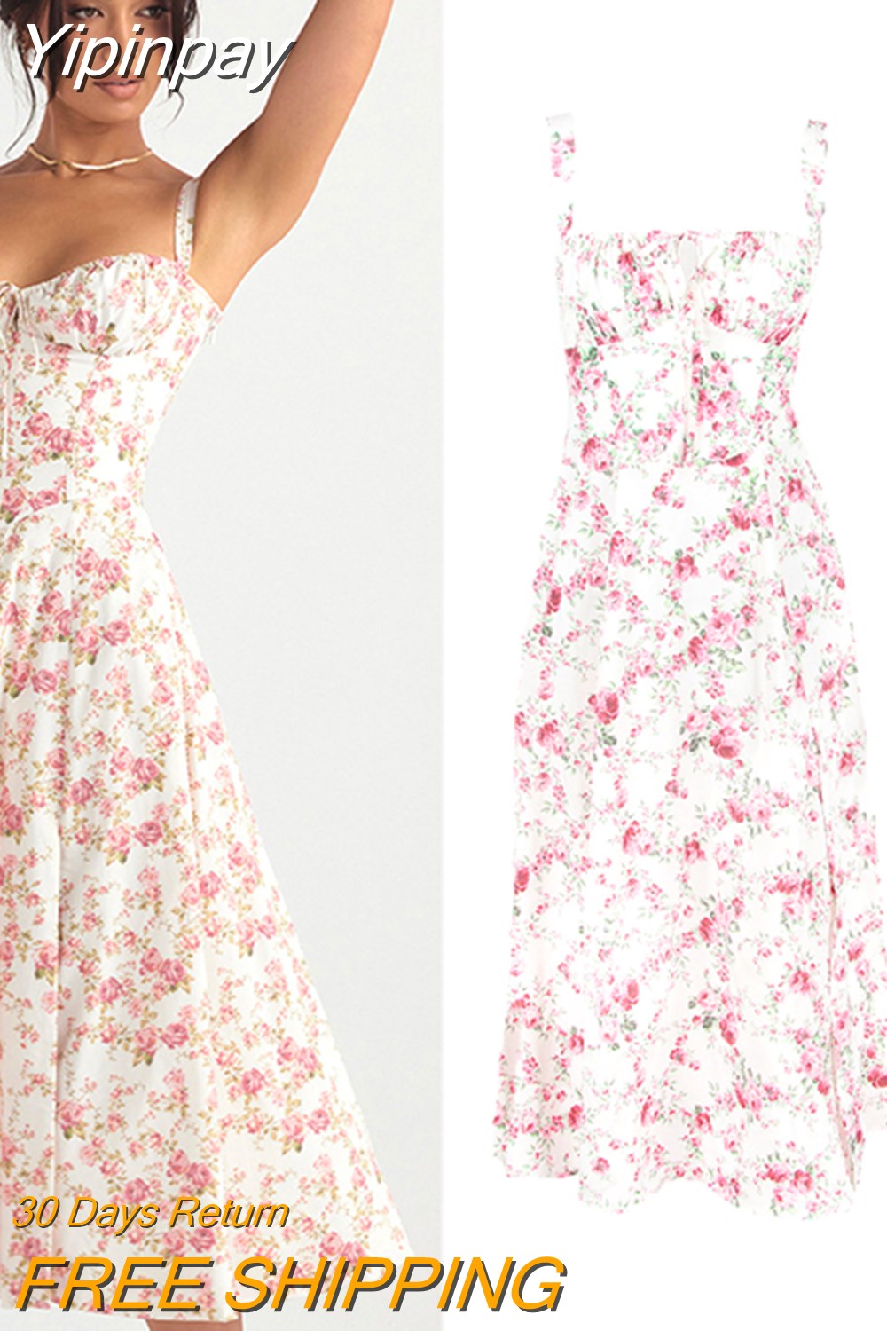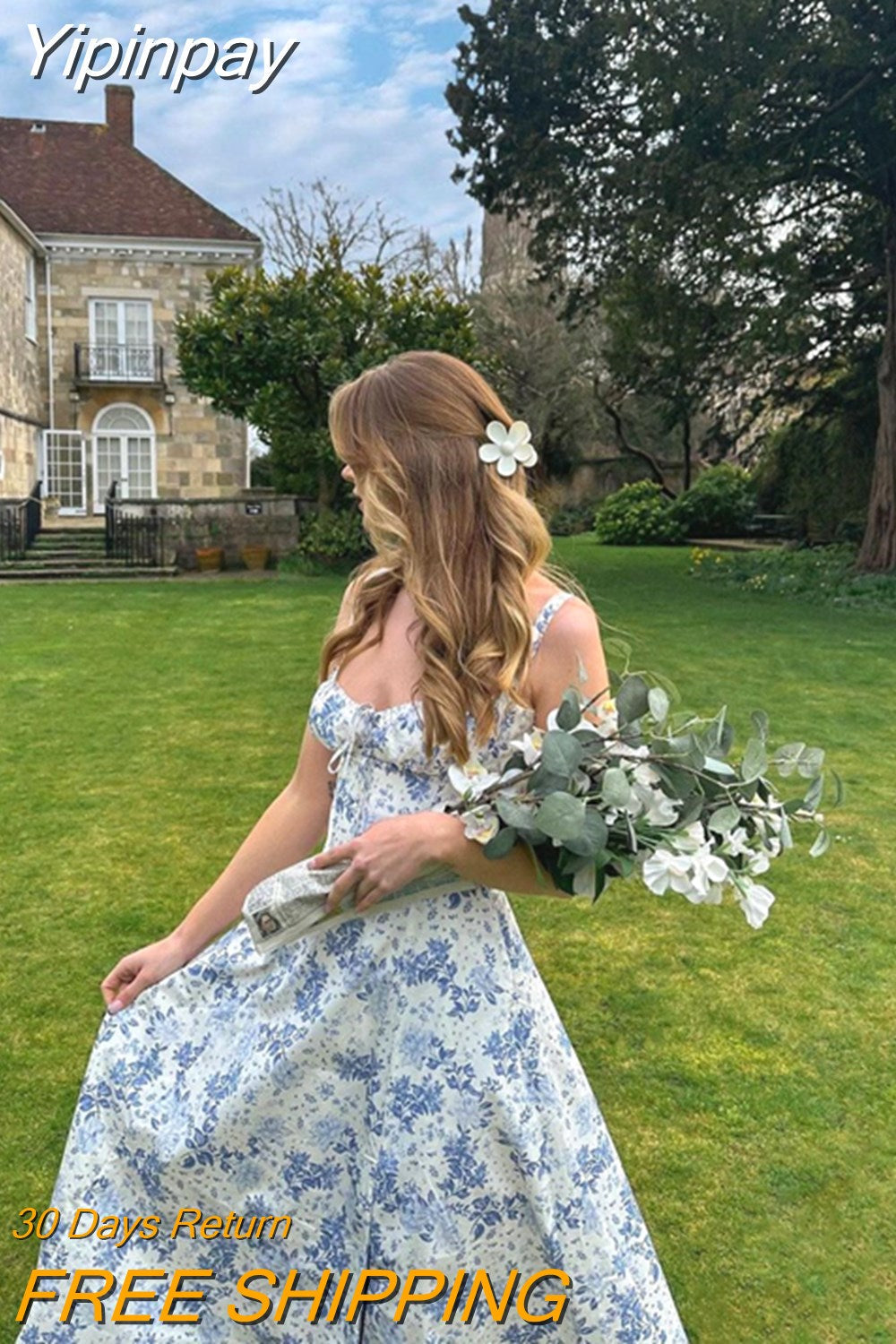 Yipinpay Women's Summer Floral Print Dresses Sweet Elegant Midi Holiday Dress Casual Slit Blue Lace Up Dresses 2023