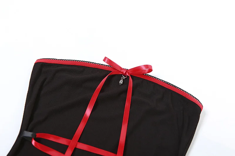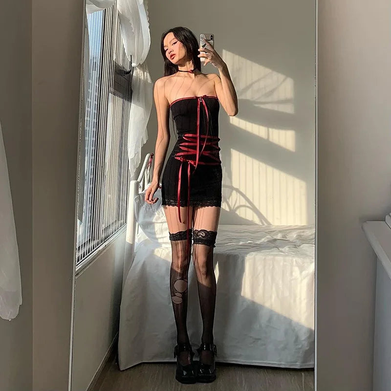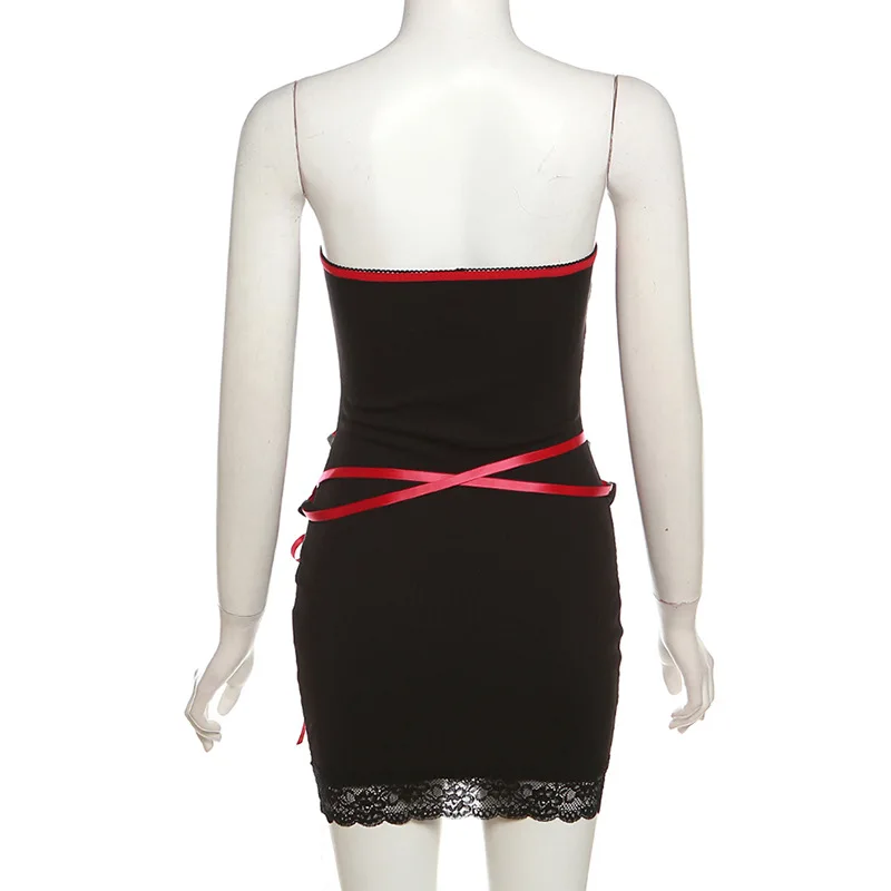 Yipinpay Women's Y2K Gothic Straps Cross Tie-Up Lace Trim Boat Neck Strapless Summer Backless Mini Bodycon Short Tube Dress