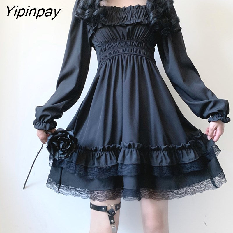 Yipinpay 2023 Sweet Summer Dress Women Gothic Black Lace Patchwork Black Dress High Waist Female Dresses