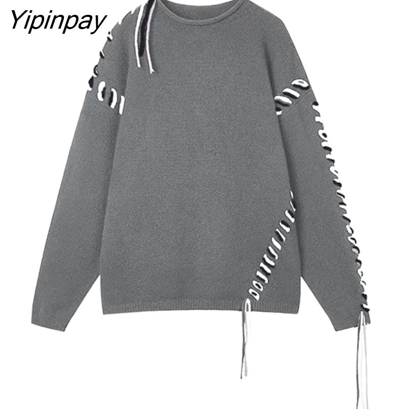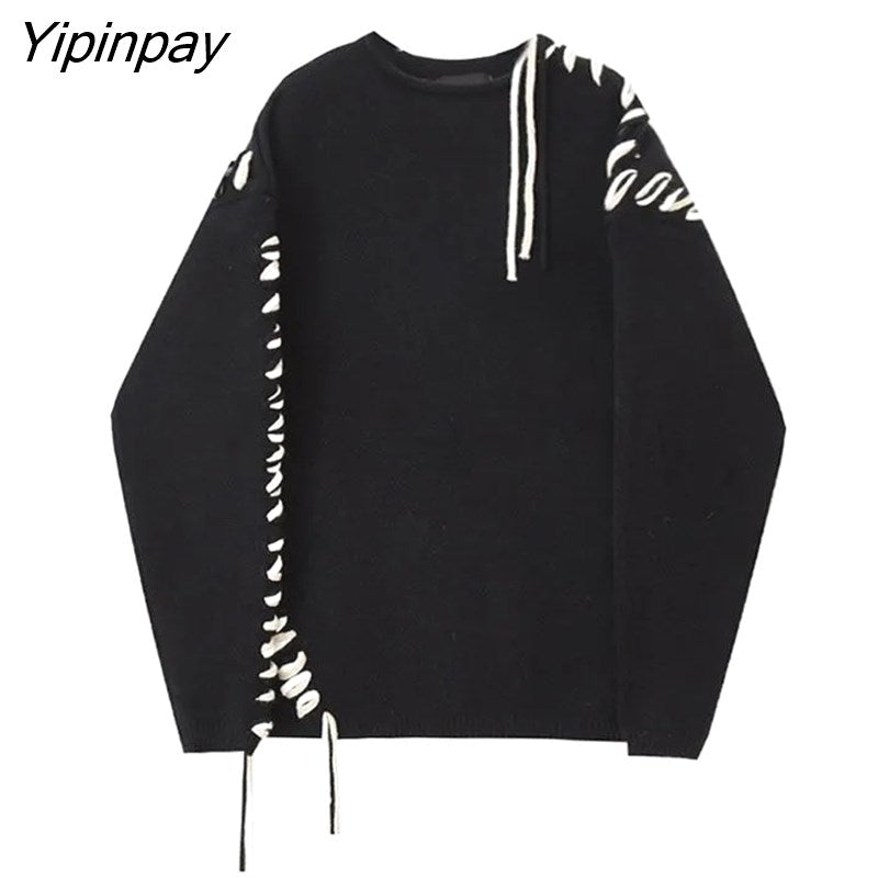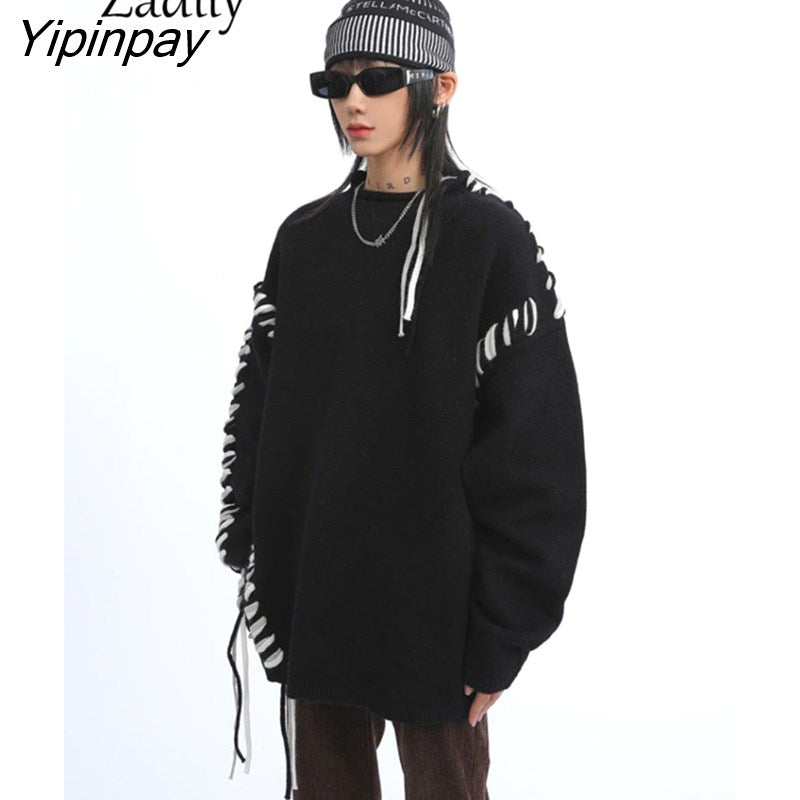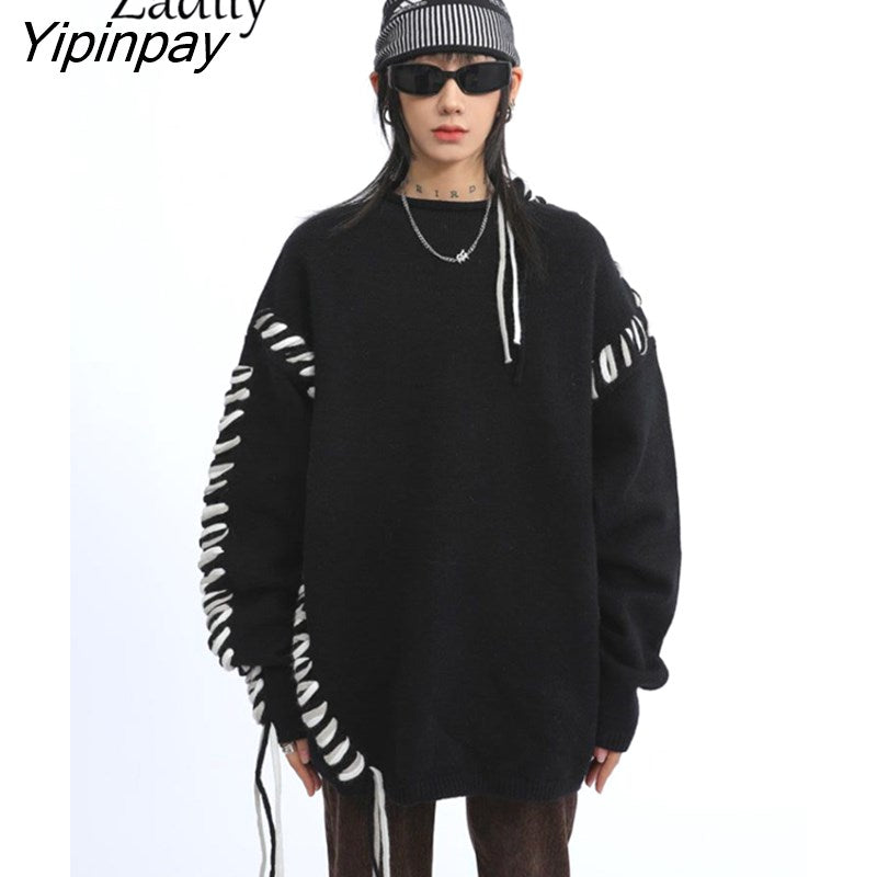 Yipinpay 2023 Winter Korean Style Long Sleeve Black Knit Sweater Women Streetwear O Neck Bandage Ladies Pullover Female Clothing