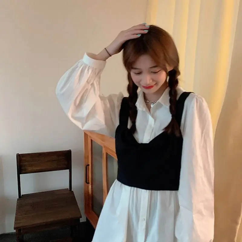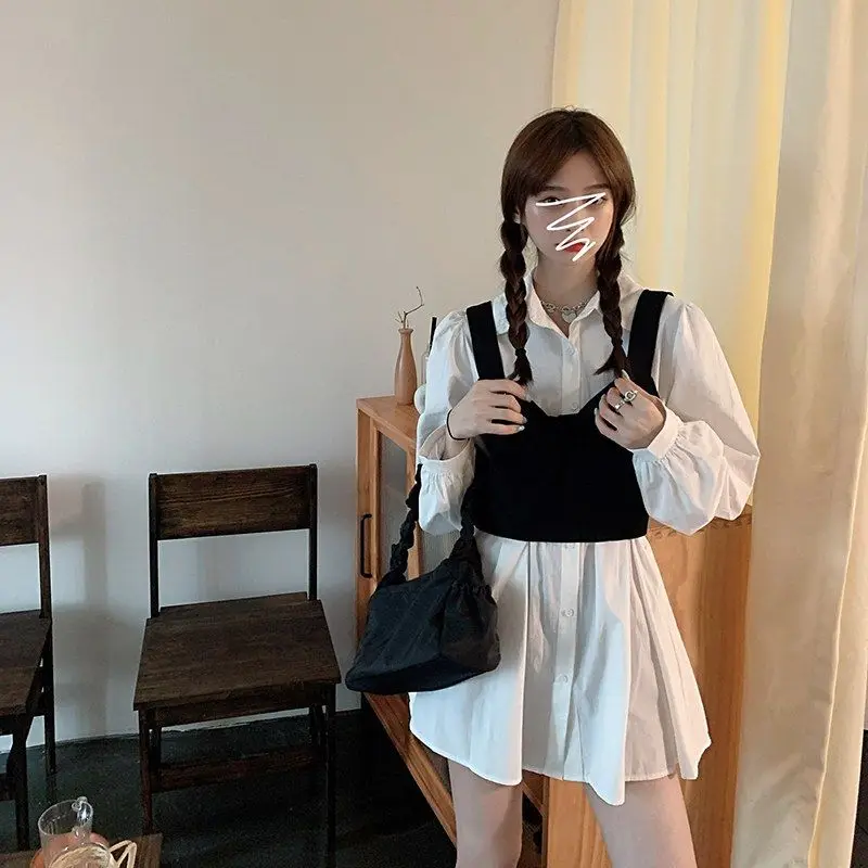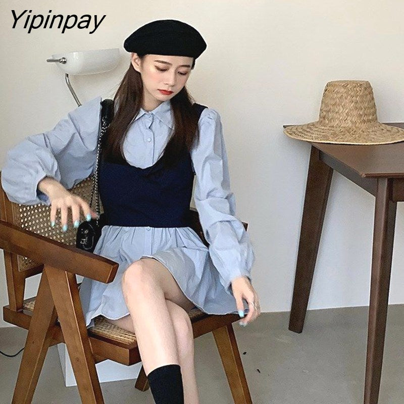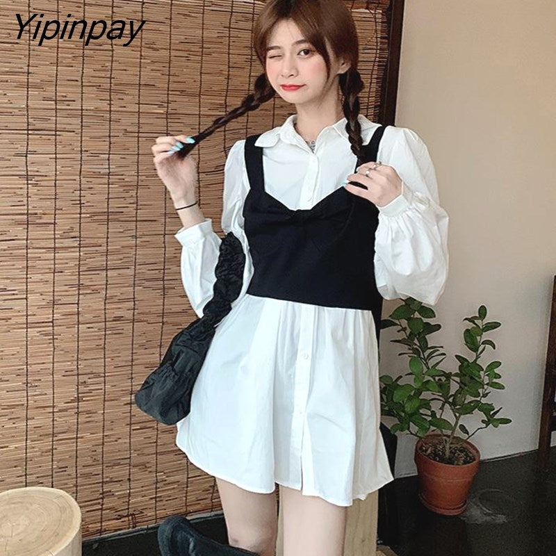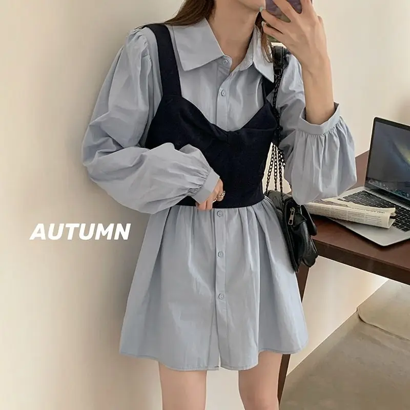 Yipinpay Autumn Women Clothing Solid Cute Dress Sets 2 Pieces Tunic Camisole + Dress Sweet Puff Sleeve for Girl