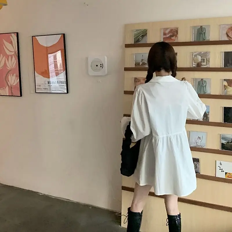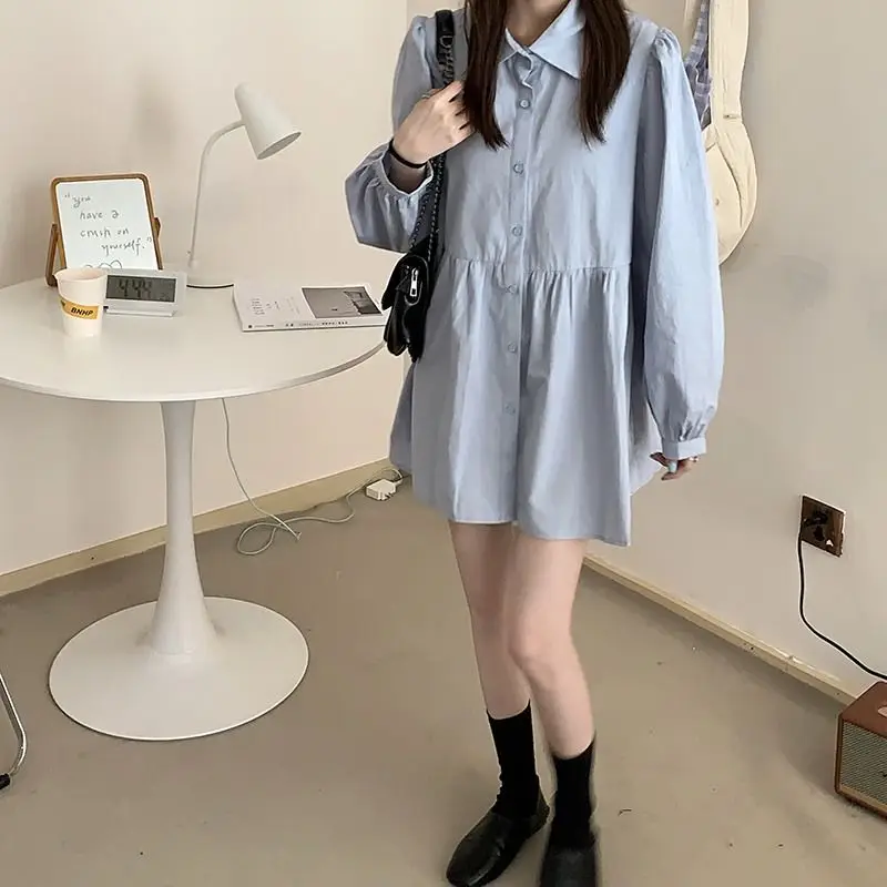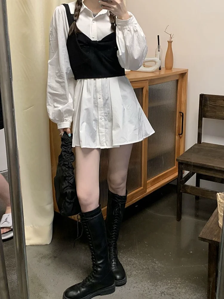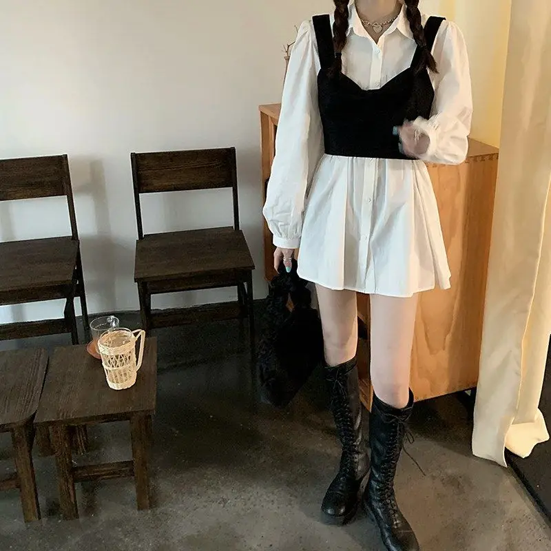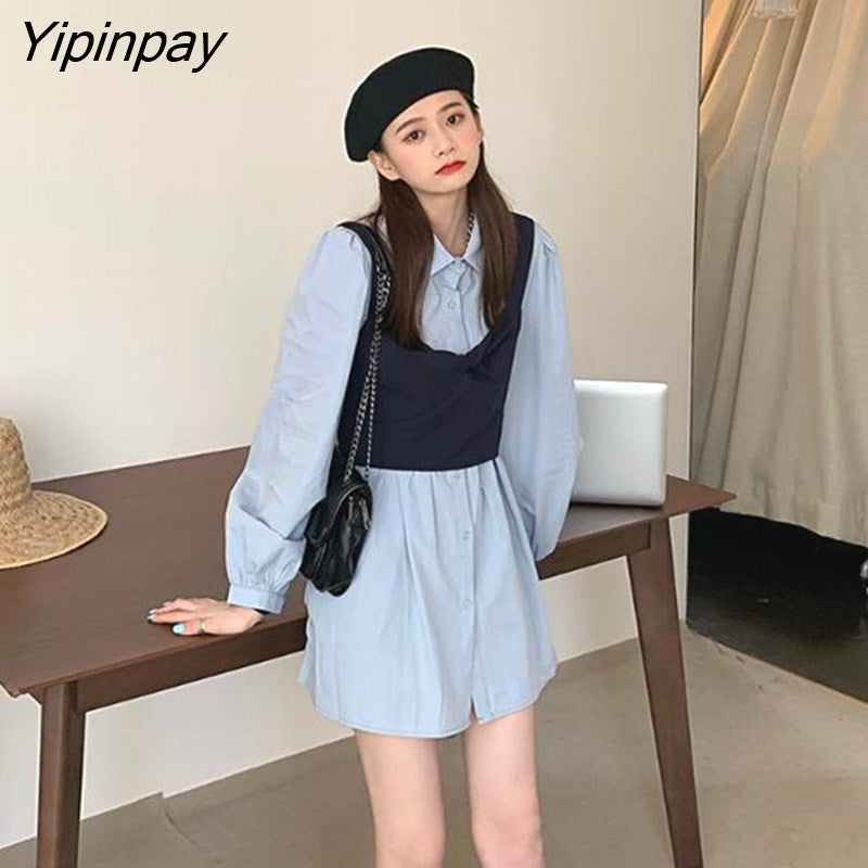 Yipinpay Autumn Women Clothing Solid Cute Dress Sets 2 Pieces Tunic Camisole + Dress Sweet Puff Sleeve for Girl