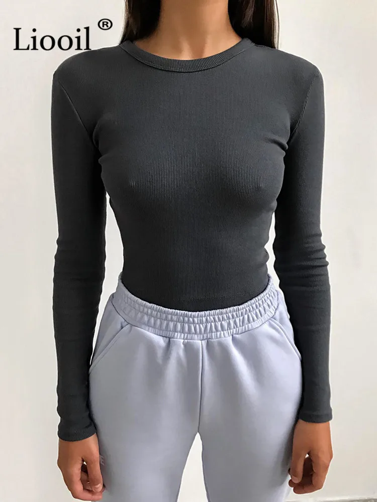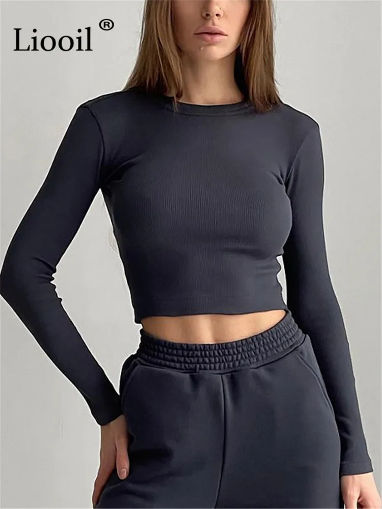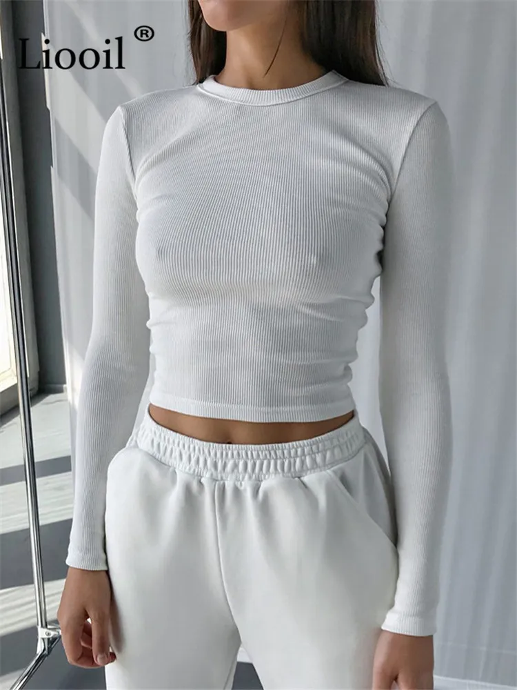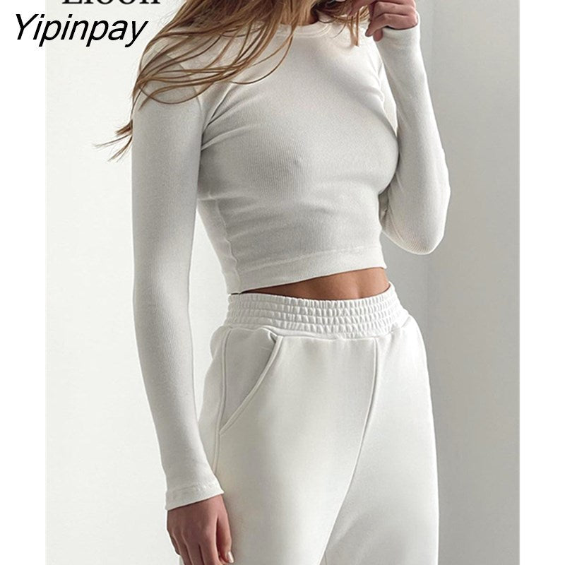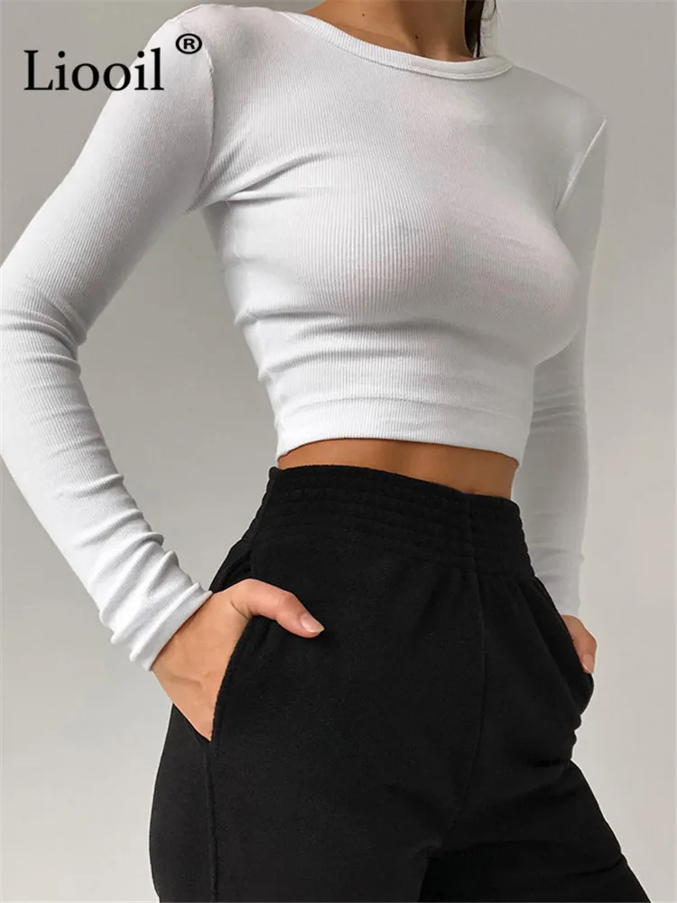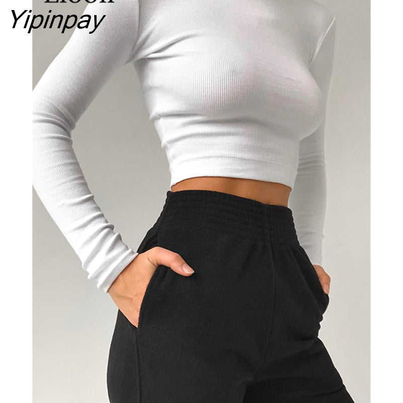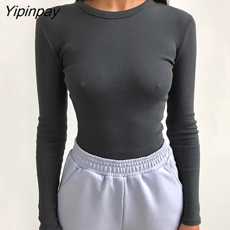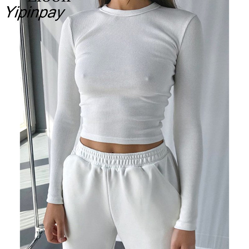 Yipinpay Black White Knit T Shirt Women Ribbed Crop Top Long Sleeve O Neck Basic Tees Short Tshirt Streetwear Sexy Bodycon Tops
