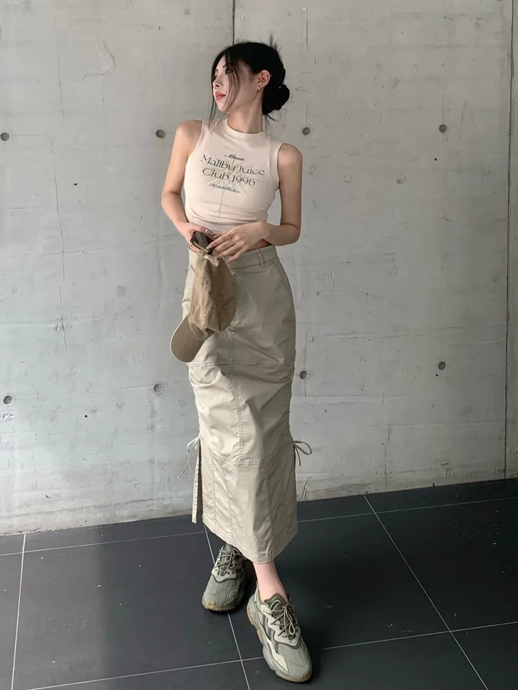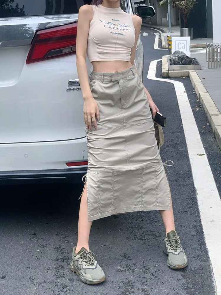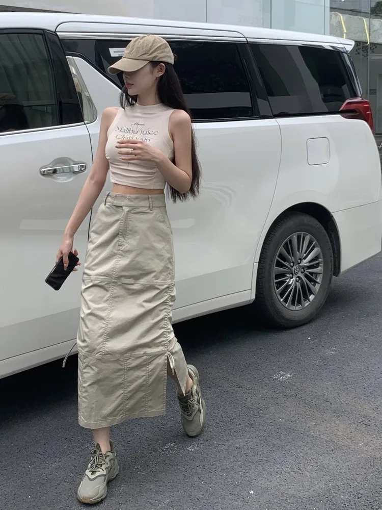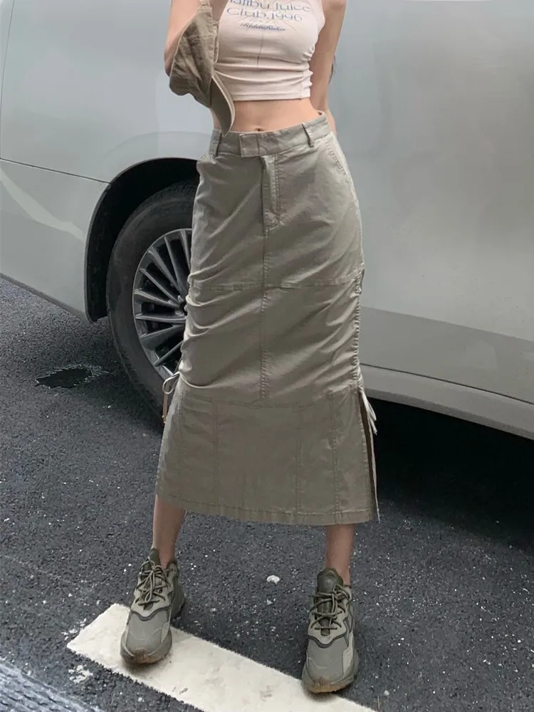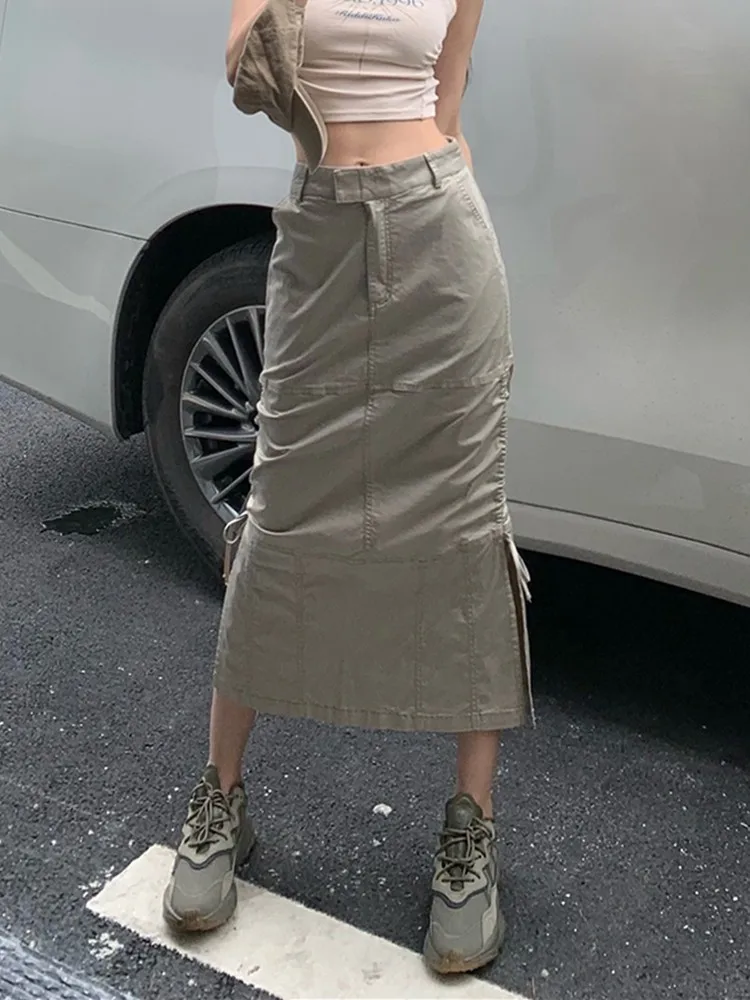 Yipinpay Casual Splitr Cargo Women Skirts Streetwear Solid Vintage High Waist Midi Skirt