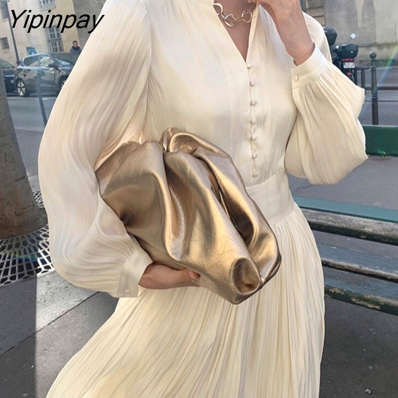 Yipinpay Elegant V-neck Satin Dresses For Women Long Sleeve Bandage Pleated Dress Ladies Korean Fashion Autumn Black