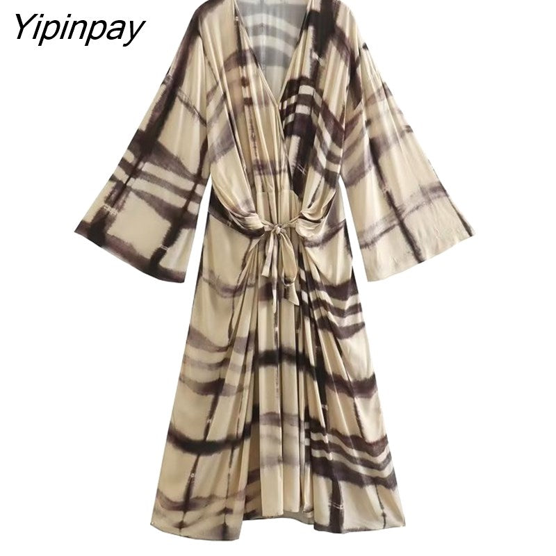 Yipinpay Elegant Women Printed Mid-Calf Dresses With Lace 2023 Spring Summer V-neck Dresses A-line Flare Sleeve Vestidos