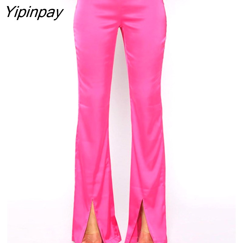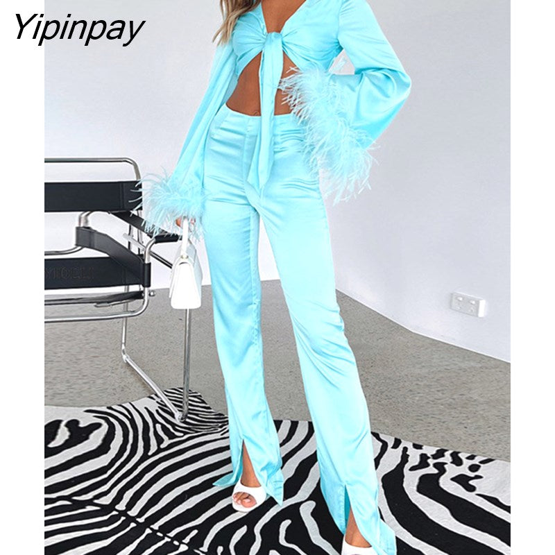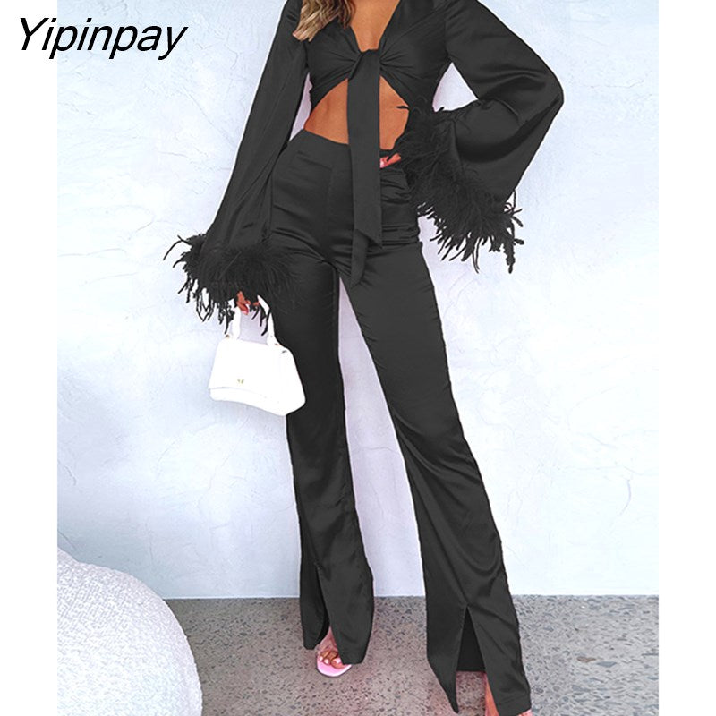 Yipinpay Feather Crop Tops And Split Trousers Two Piece Sets Women Fashion Flare Long Sleeve Tie Up Blouse High Waist Pants Suits