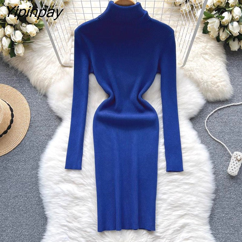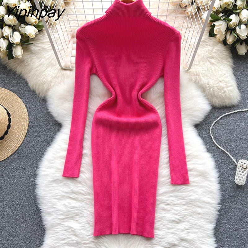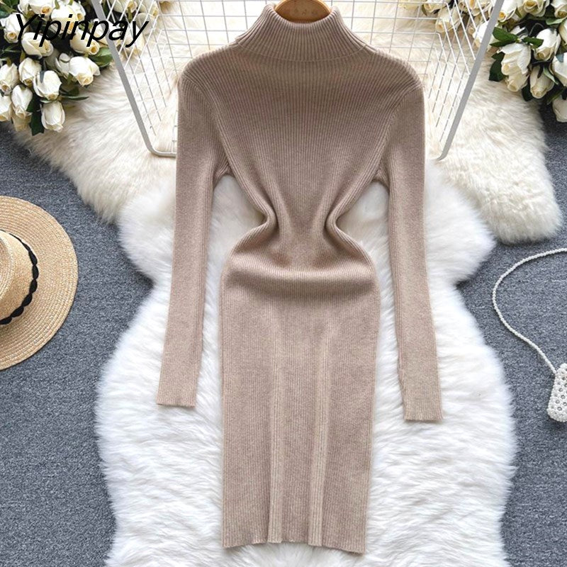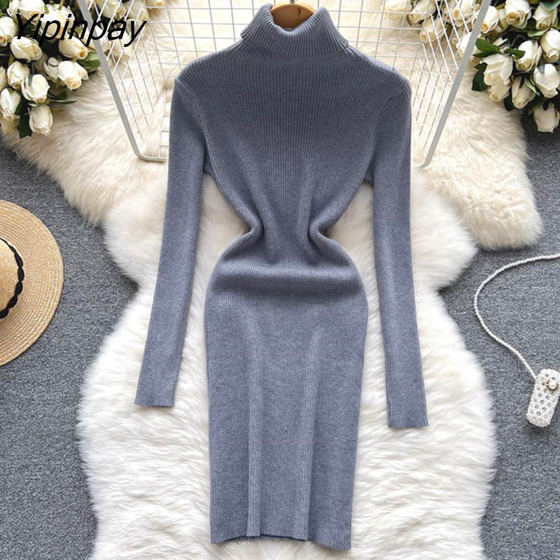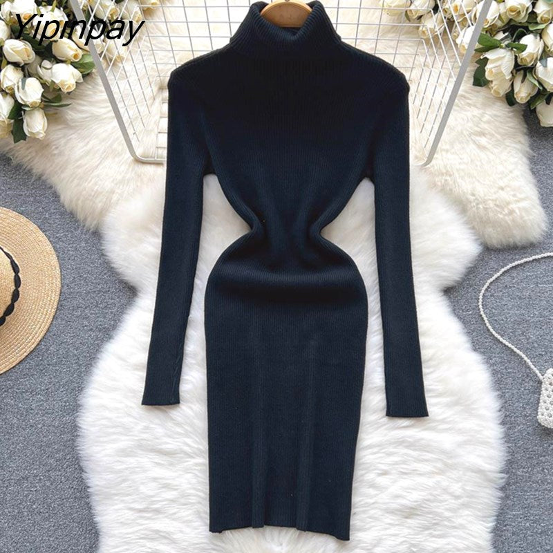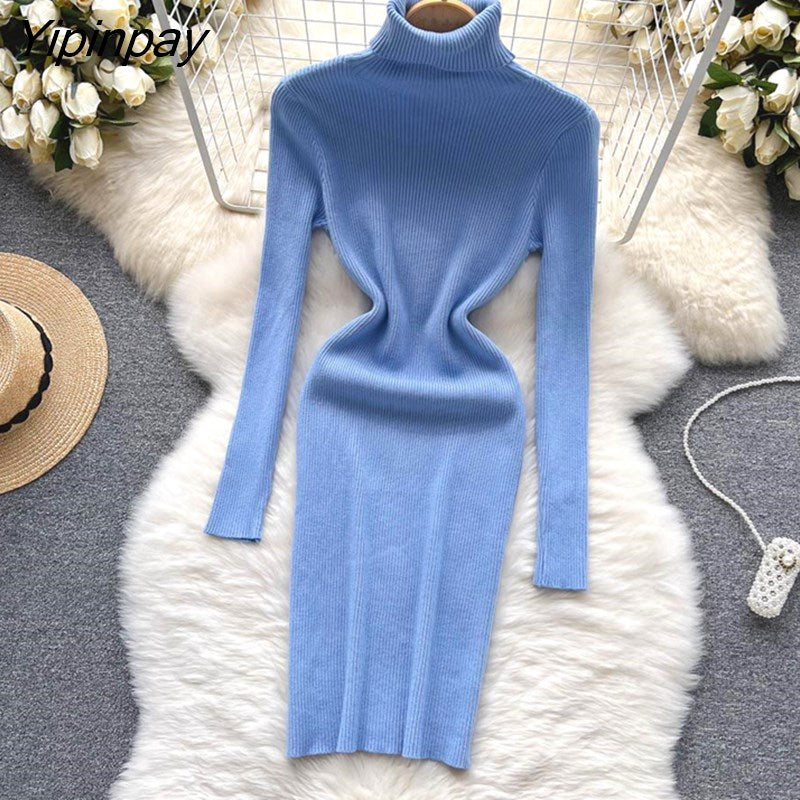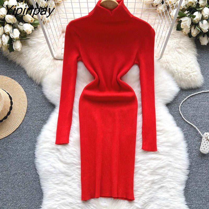 Yipinpay Full Sleeve Slim Knitted Pencil Dress Female Casual Pullover Turtleneck Sweater Bodycon Dress Ladies Autumn Winter