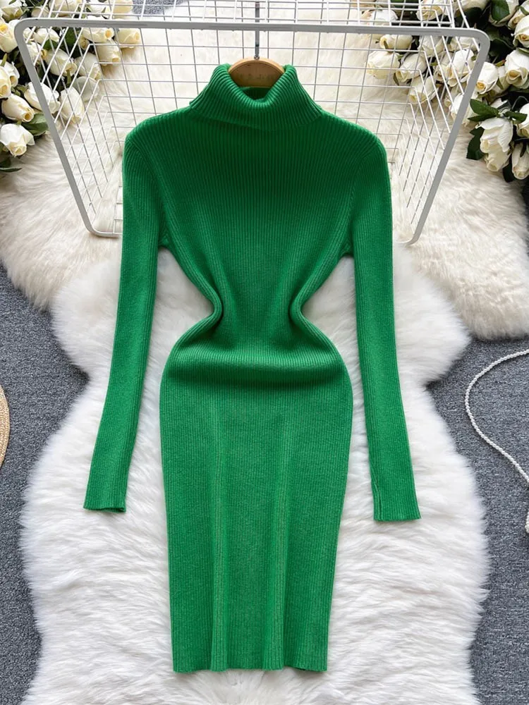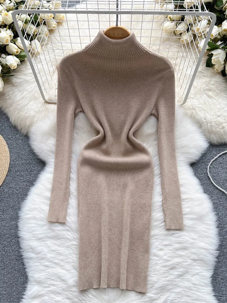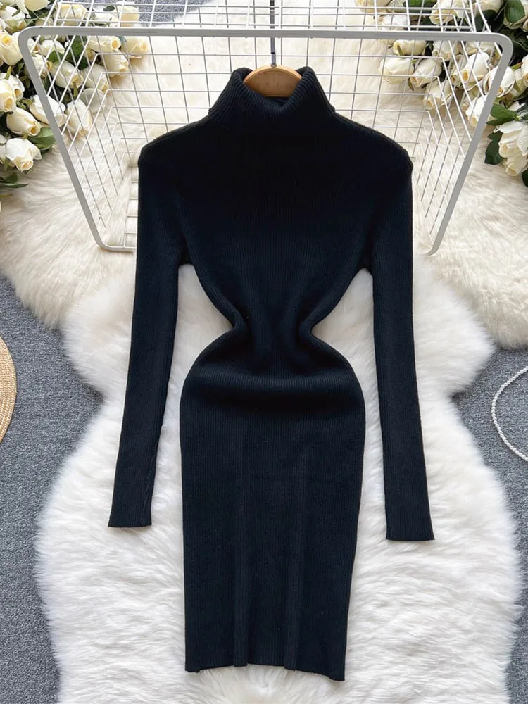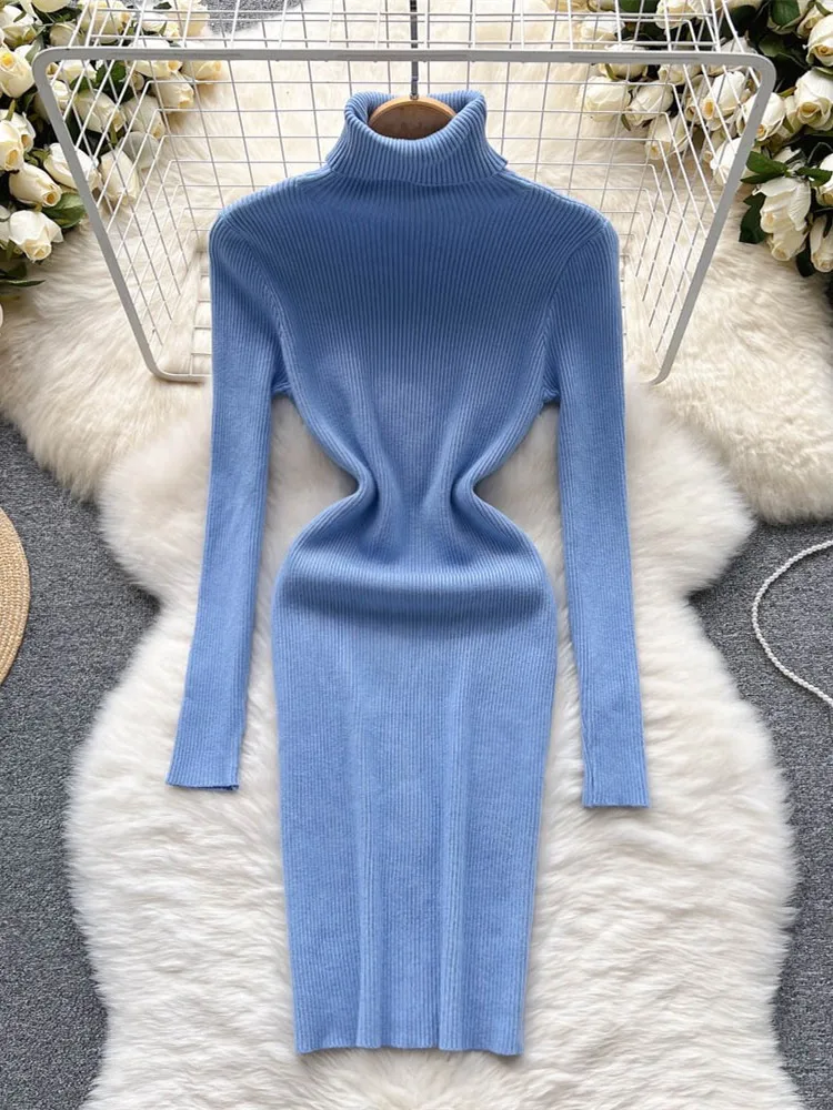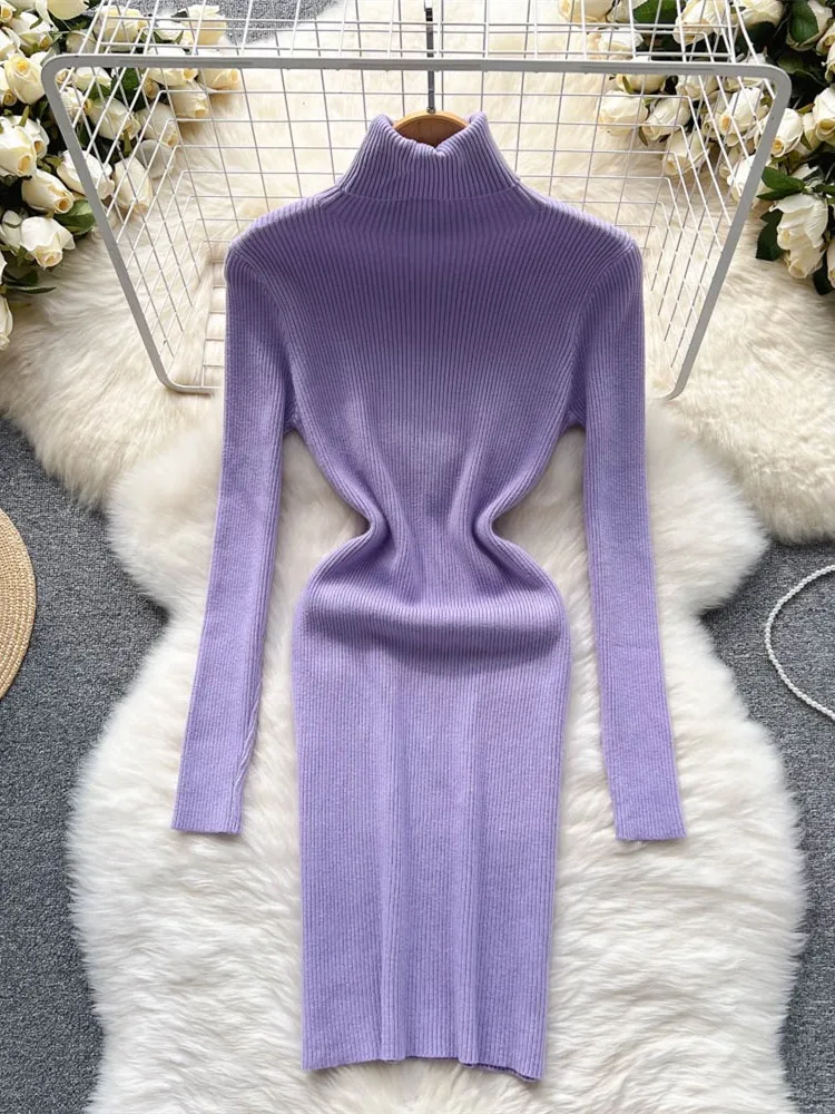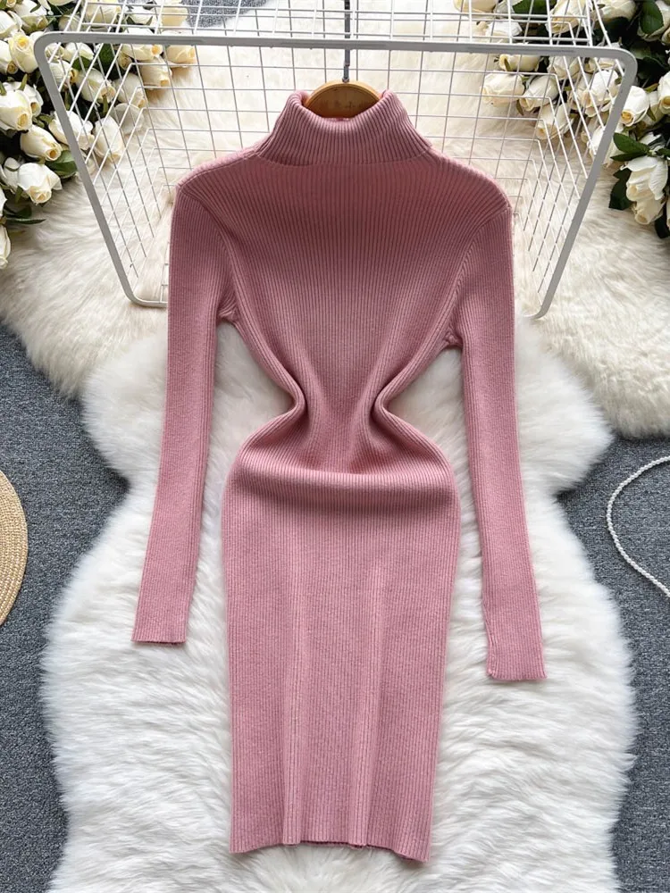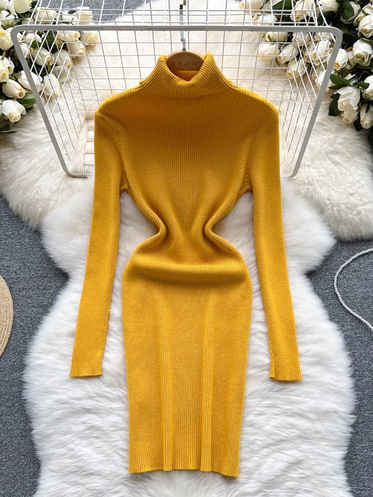 Yipinpay Full Sleeve Slim Knitted Pencil Dress Female Casual Pullover Turtleneck Sweater Bodycon Dress Ladies Autumn Winter