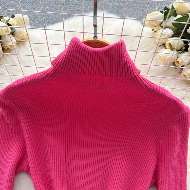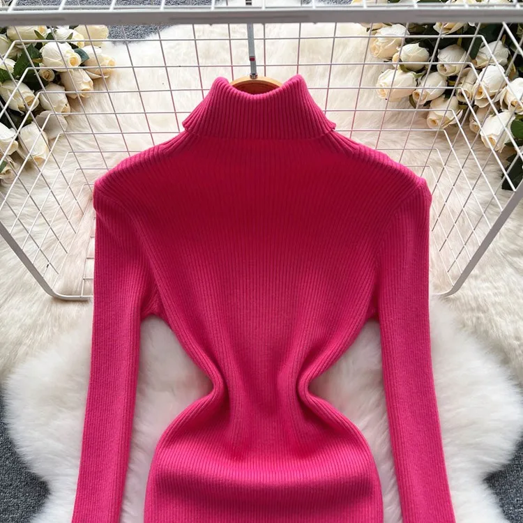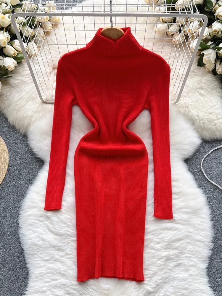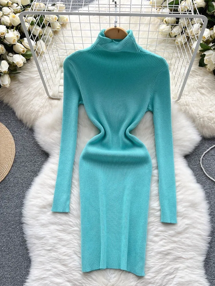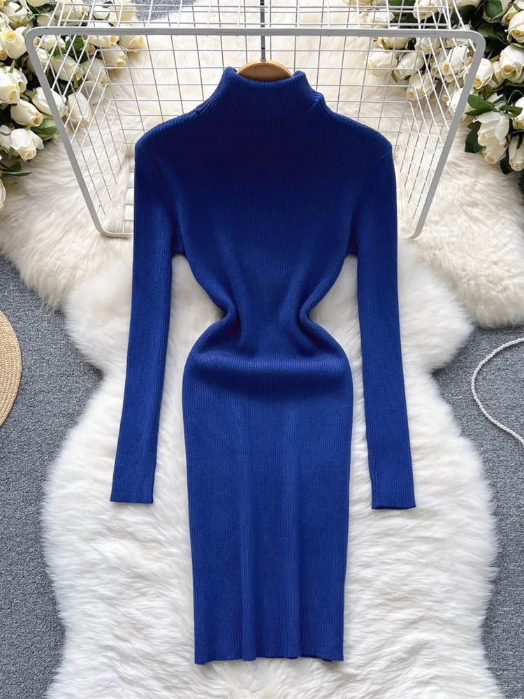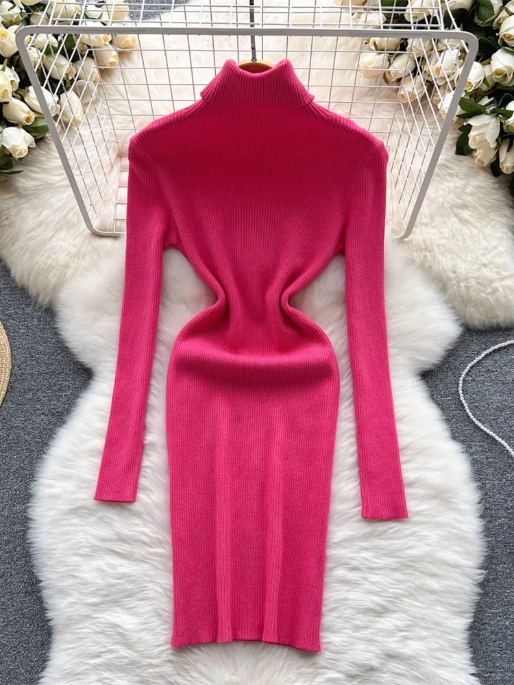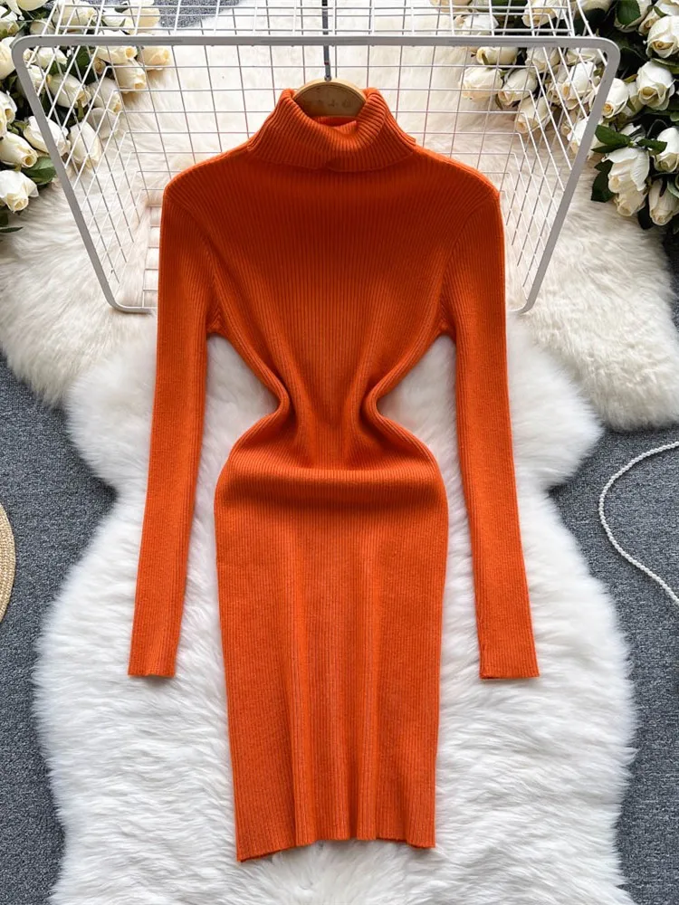 Yipinpay Full Sleeve Slim Knitted Pencil Dress Female Casual Pullover Turtleneck Sweater Bodycon Dress Ladies Autumn Winter