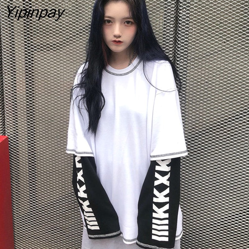 Yipinpay Harajuku Patchwork T Shirts Fake Two Pieces punk product Striped Long Sleeve Casual T-shirt O-neck Women size Top Tees