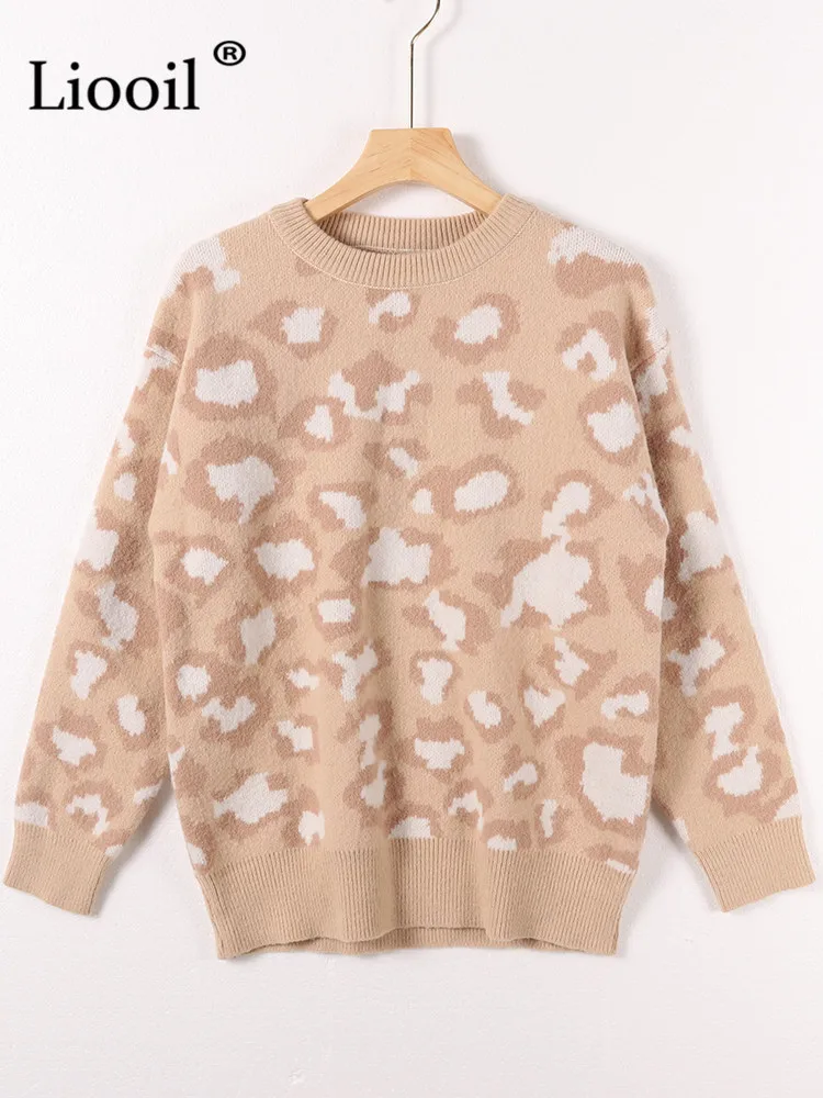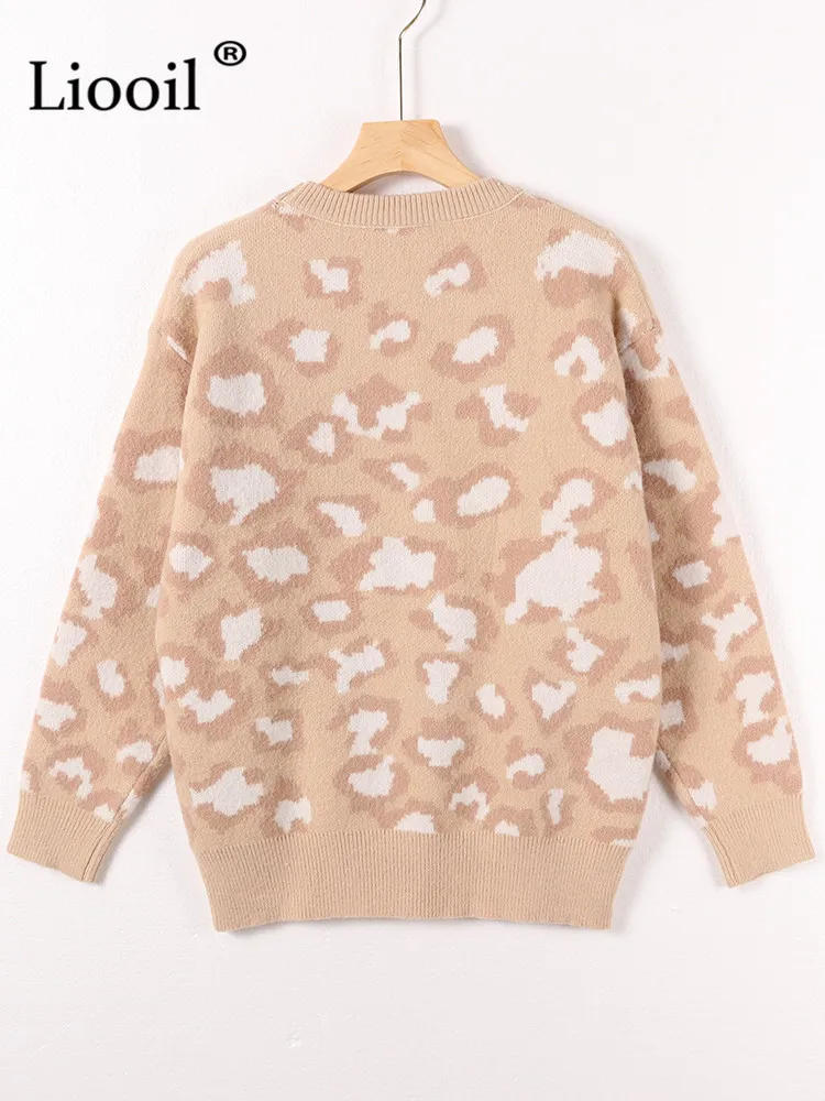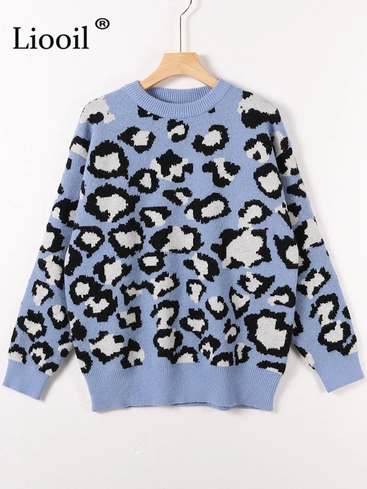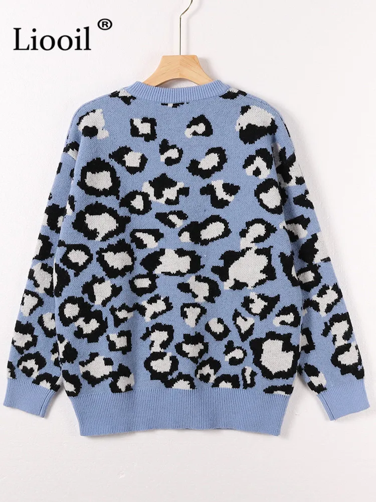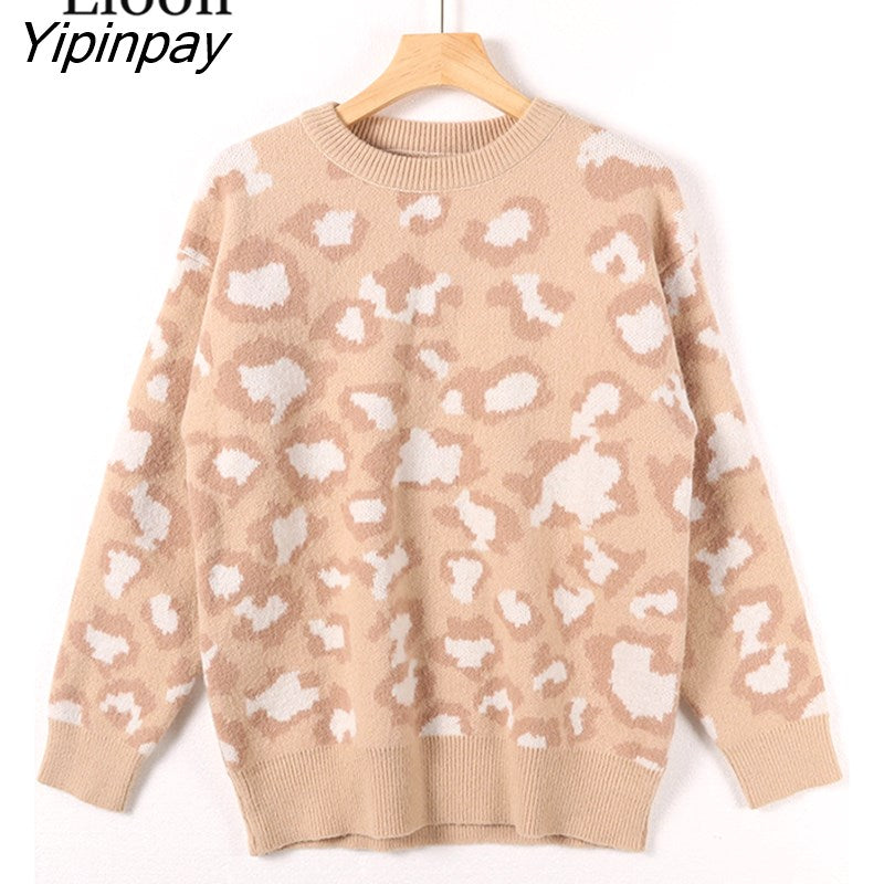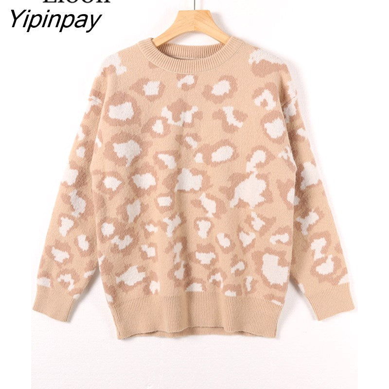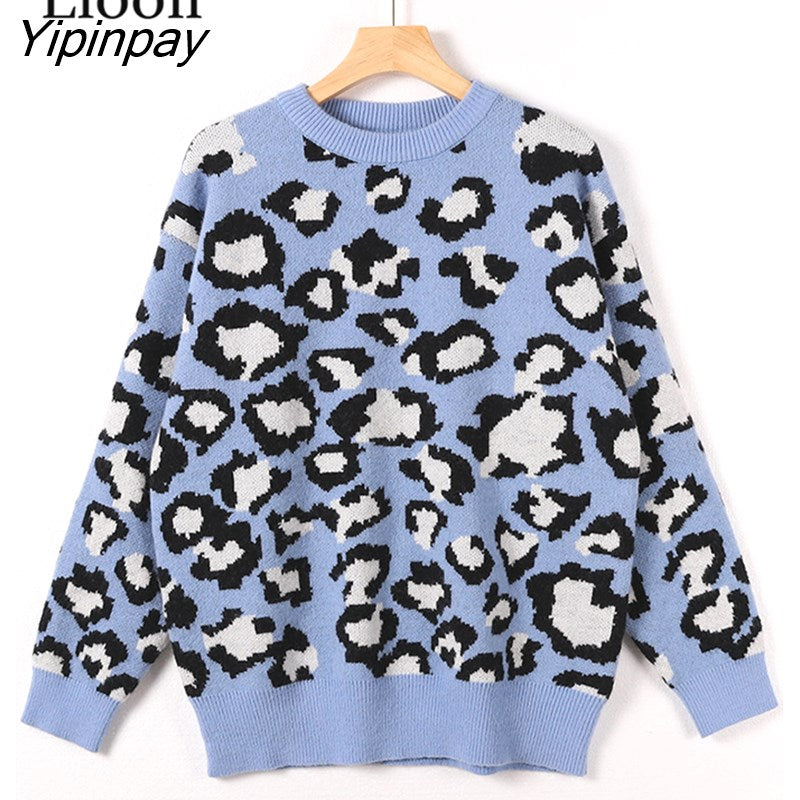 Yipinpay Leopard Print Knit Sweater Female Jumpers Warm Tops Pull Femme Streetwear Blue Khaki Knitted Sweaters For Women Pullovers