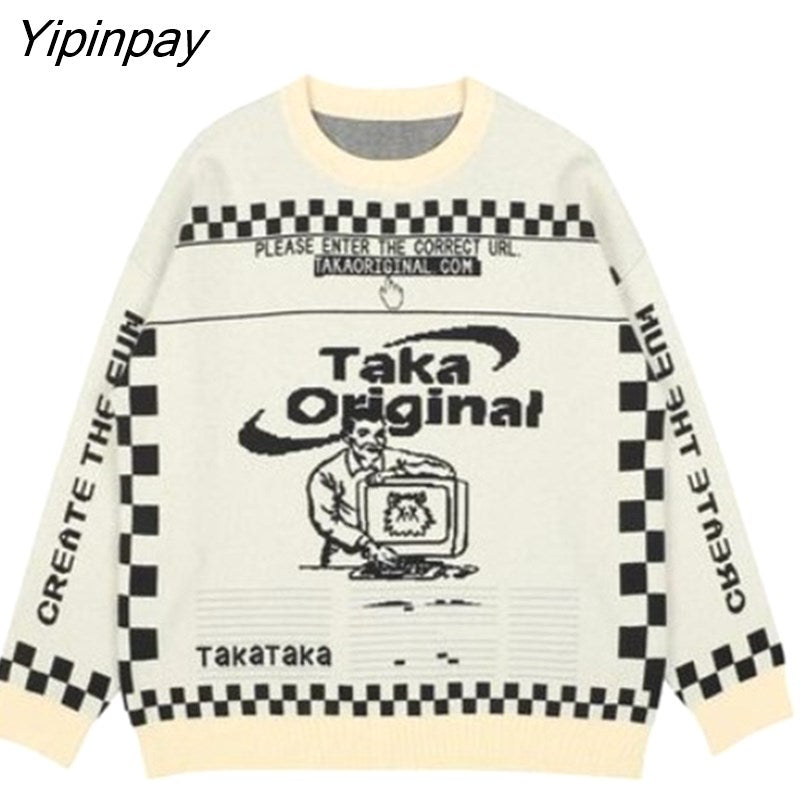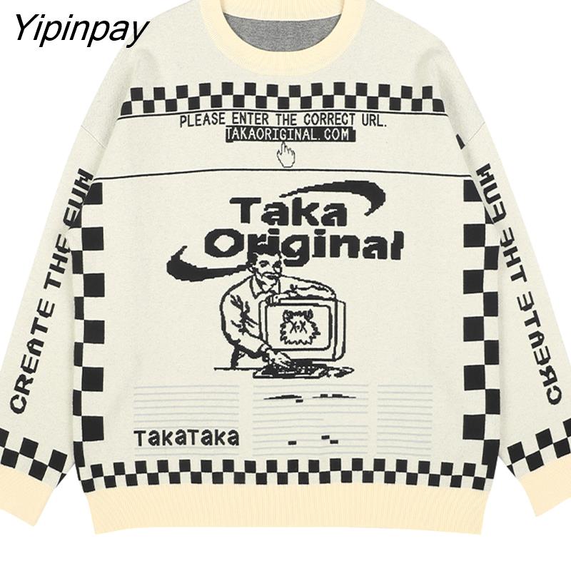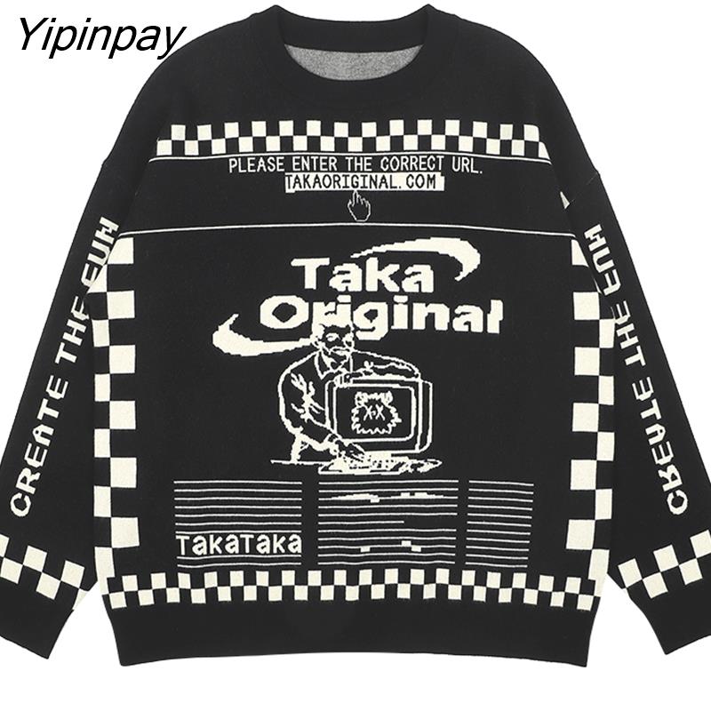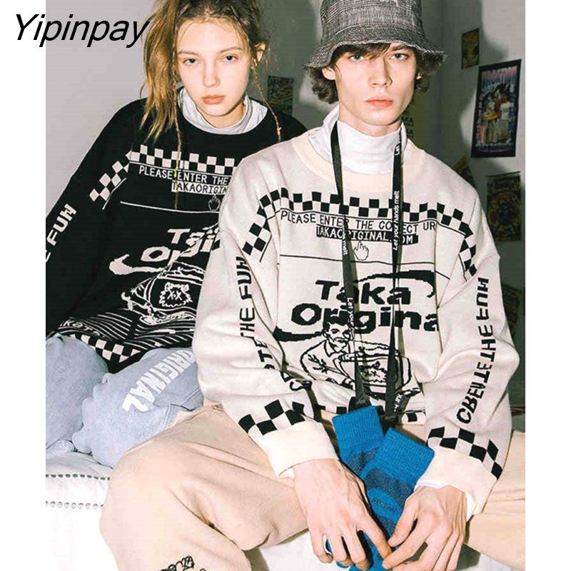 Yipinpay Men's Oversized Pattern Sweater Fashion Loose Trend American Retro Round Neck 2023 Winter Jacquard Knit Sweater Women's Sweater