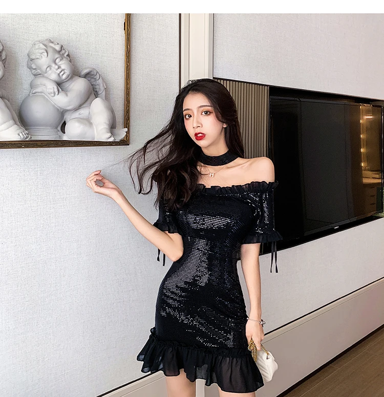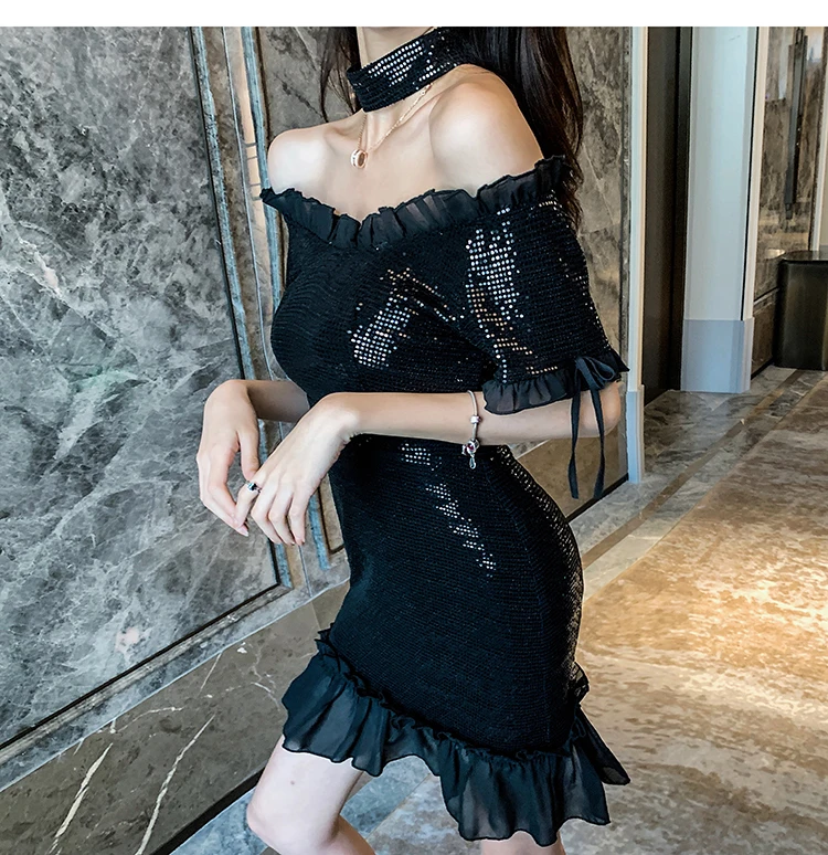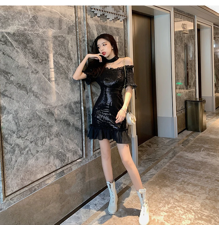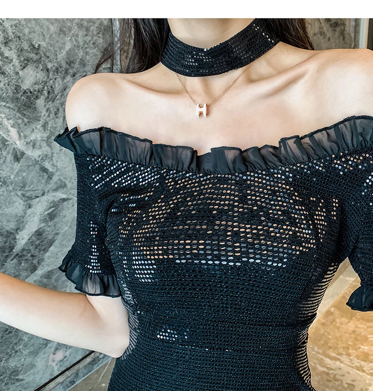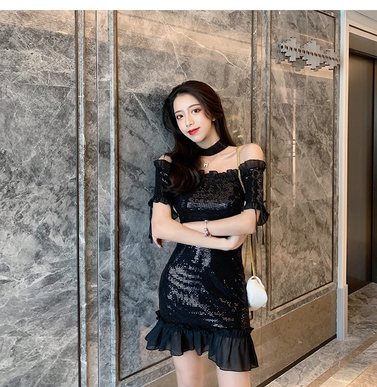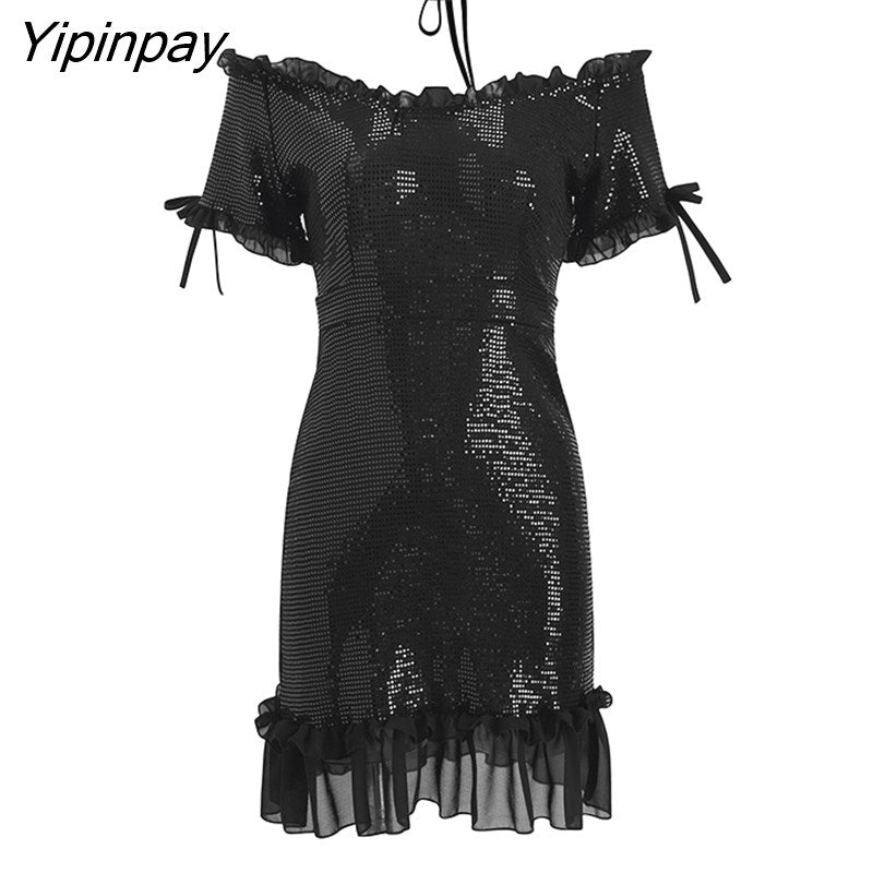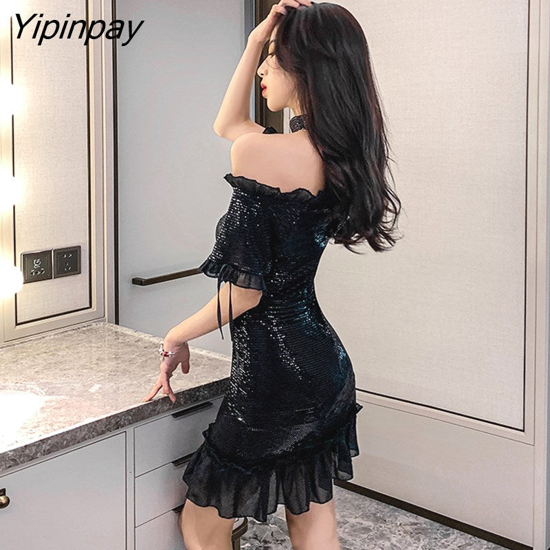 Yipinpay New Spring/Autumn Women Dress Sexy Slim Shiny Black Party Dress Female Bodycon Dress