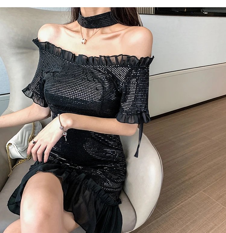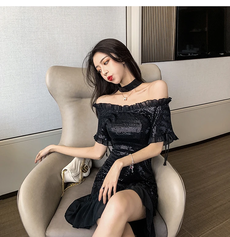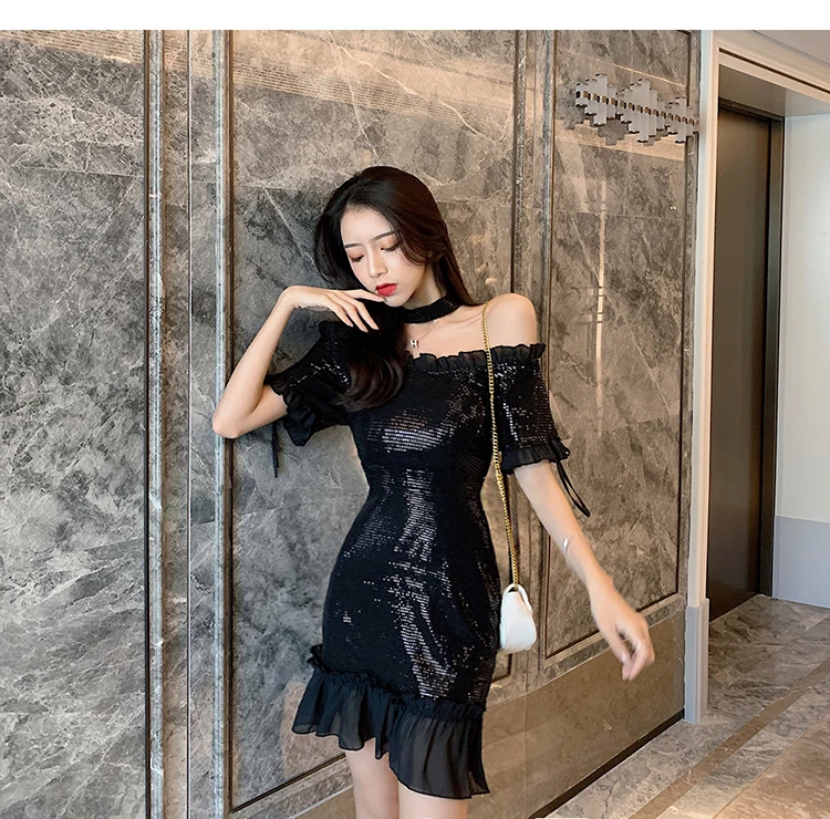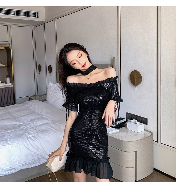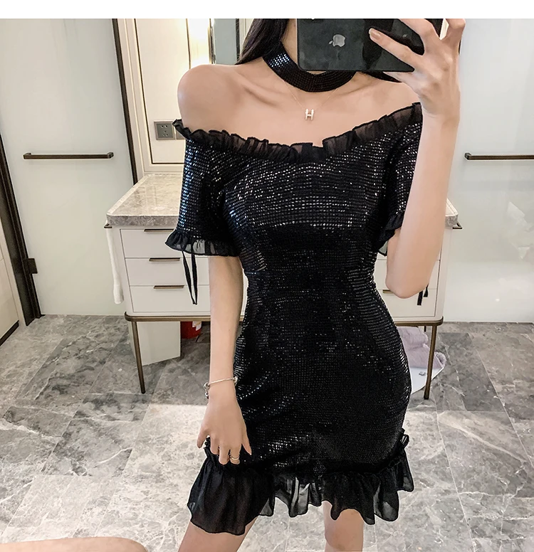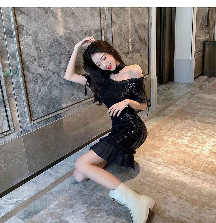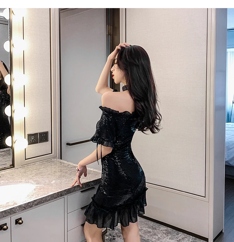 Yipinpay New Spring/Autumn Women Dress Sexy Slim Shiny Black Party Dress Female Bodycon Dress