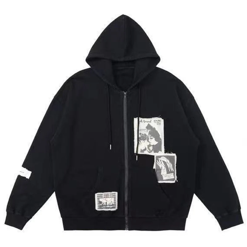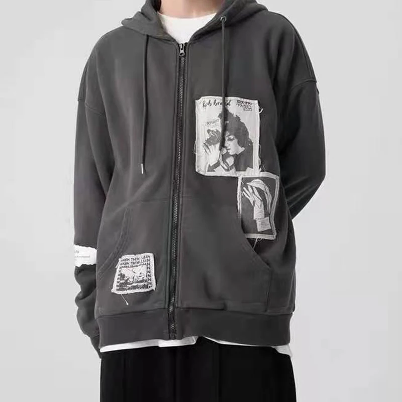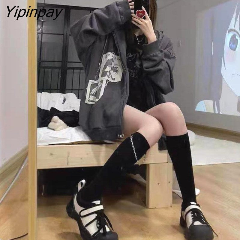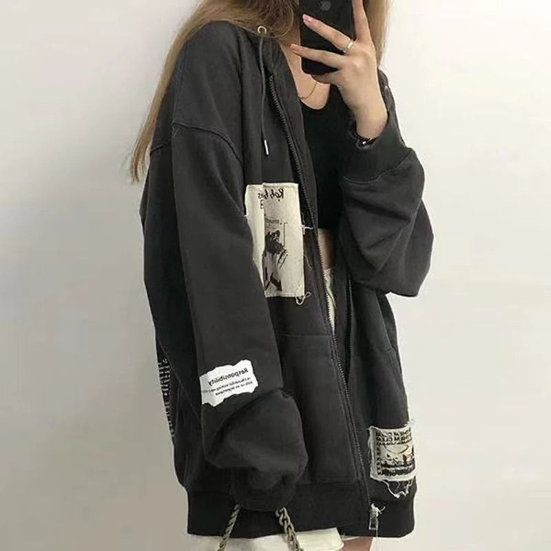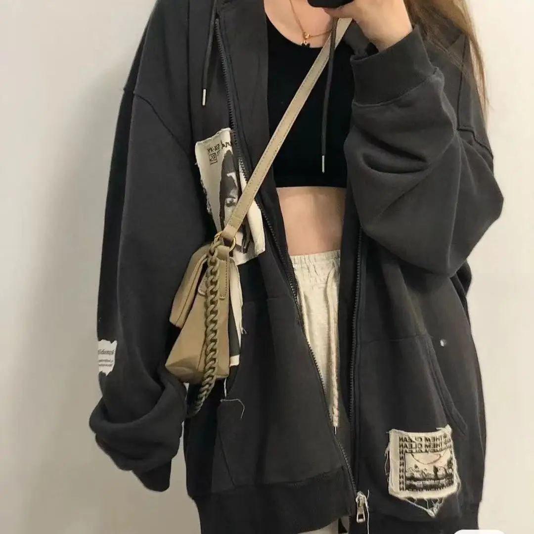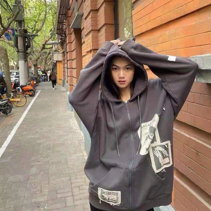 Yipinpay Patch Y2K Zip Up Hooded Jacket Women Long Sleeve Loose Streetwear Hoodies Cotton Outwear Harajuku Sweatshirts Black Gray
