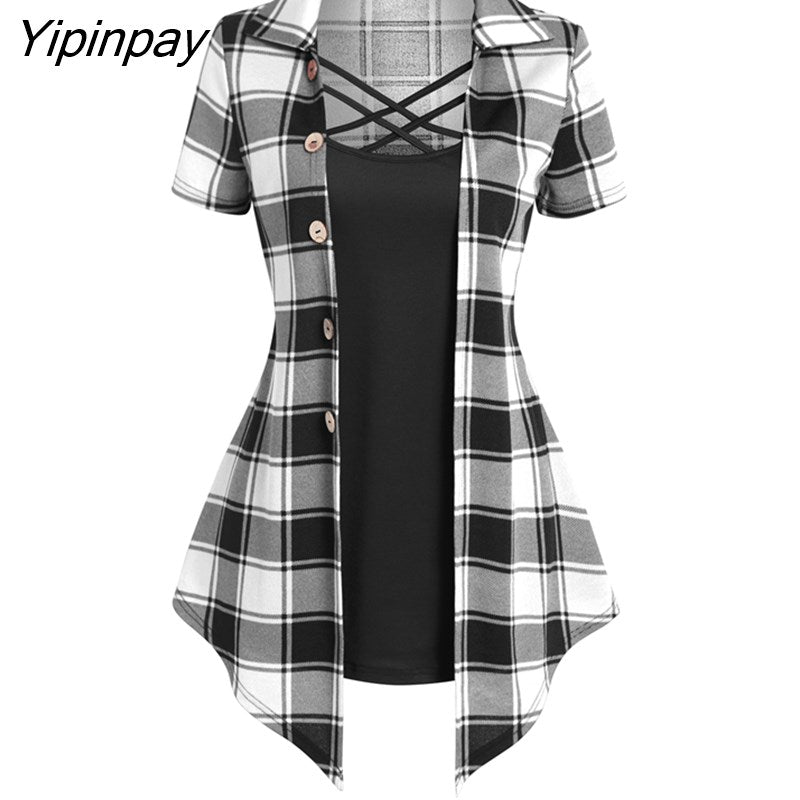 Yipinpay Plaid Print Mock Button Casual Faux Twinset T Shirt Combo Women 2 in 1 Tee Twofer Summer High Waist Fashion T-Shirts
