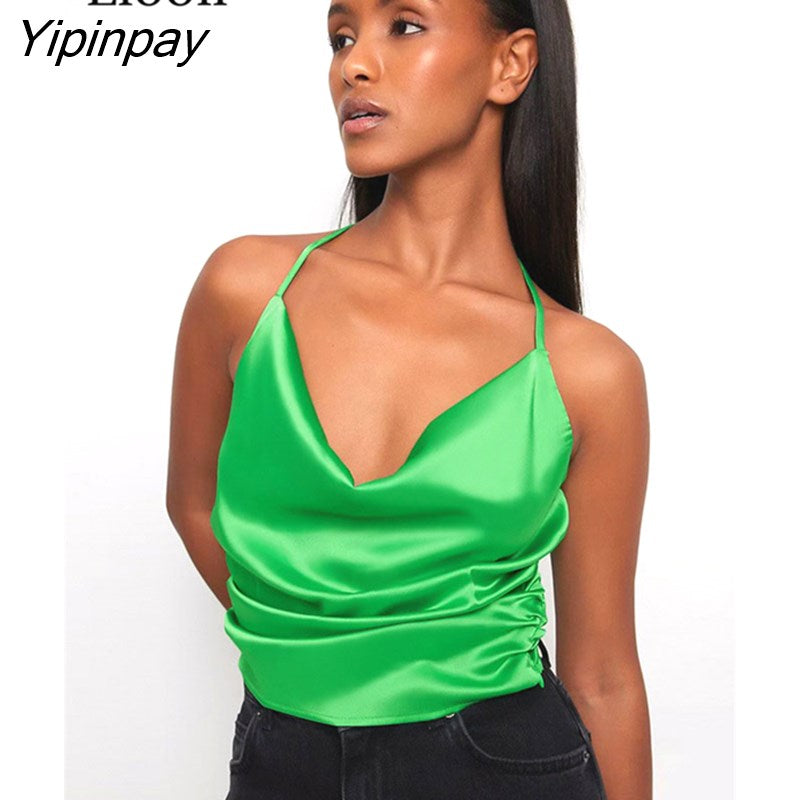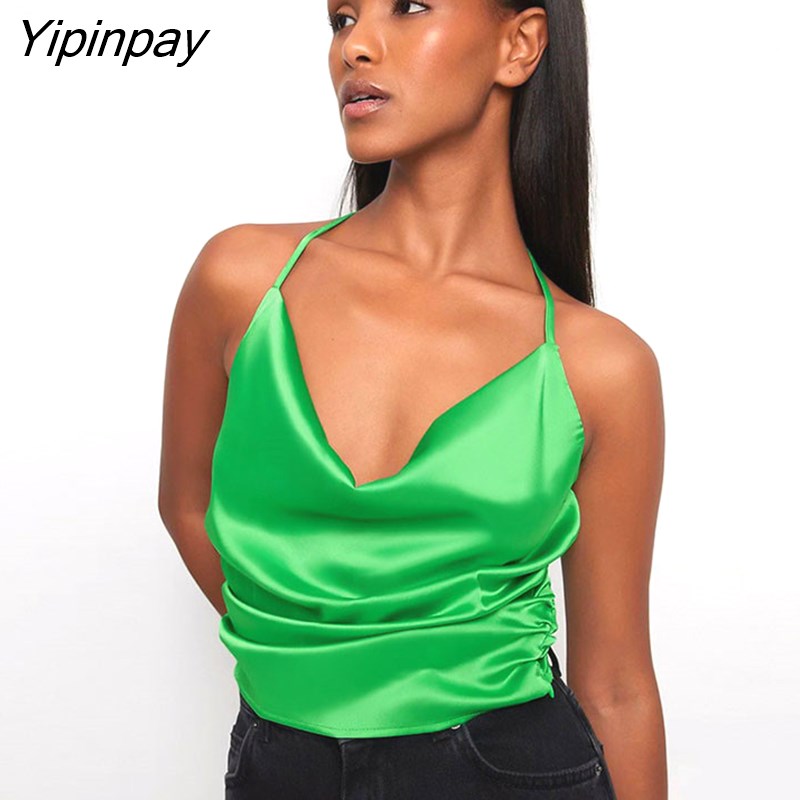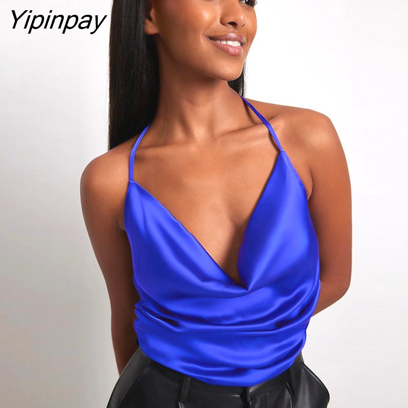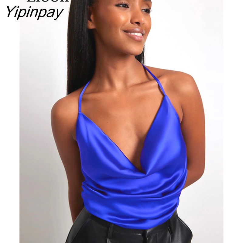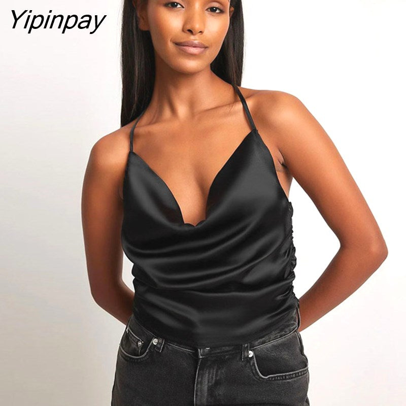 Yipinpay Sexy Ruched Satin Halter Tops Women Short Vest 2023 Summer Backless Camis Streetwear Sleeveless V Neck Black Crop Top