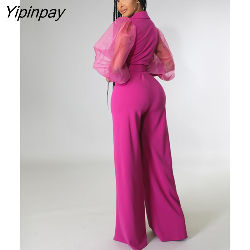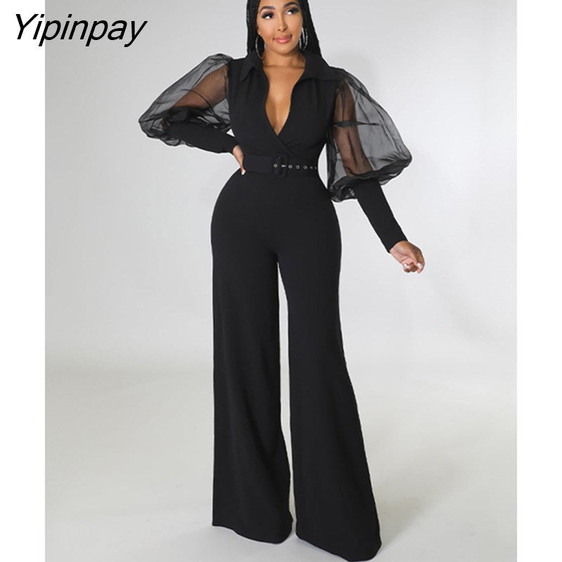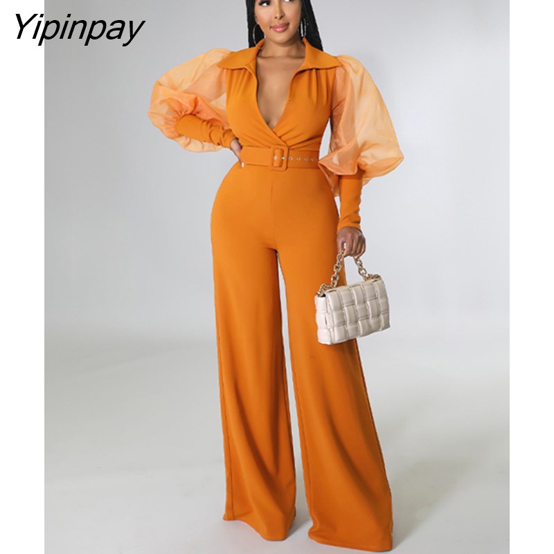 Yipinpay Solid V Neck Mesh Belt One Piece Wide Leg Pants Woman Long Sleeve Elegant Jumpsuit Playsuit Overalls Fall One Piece Outfit