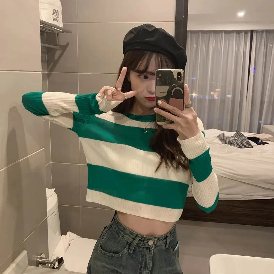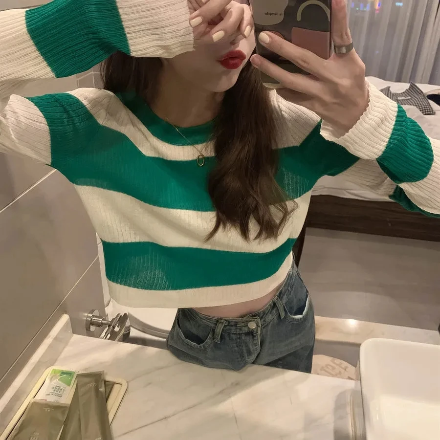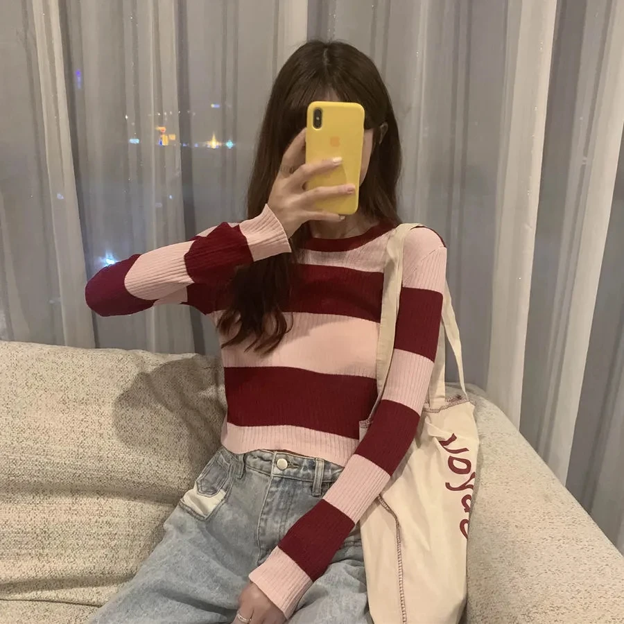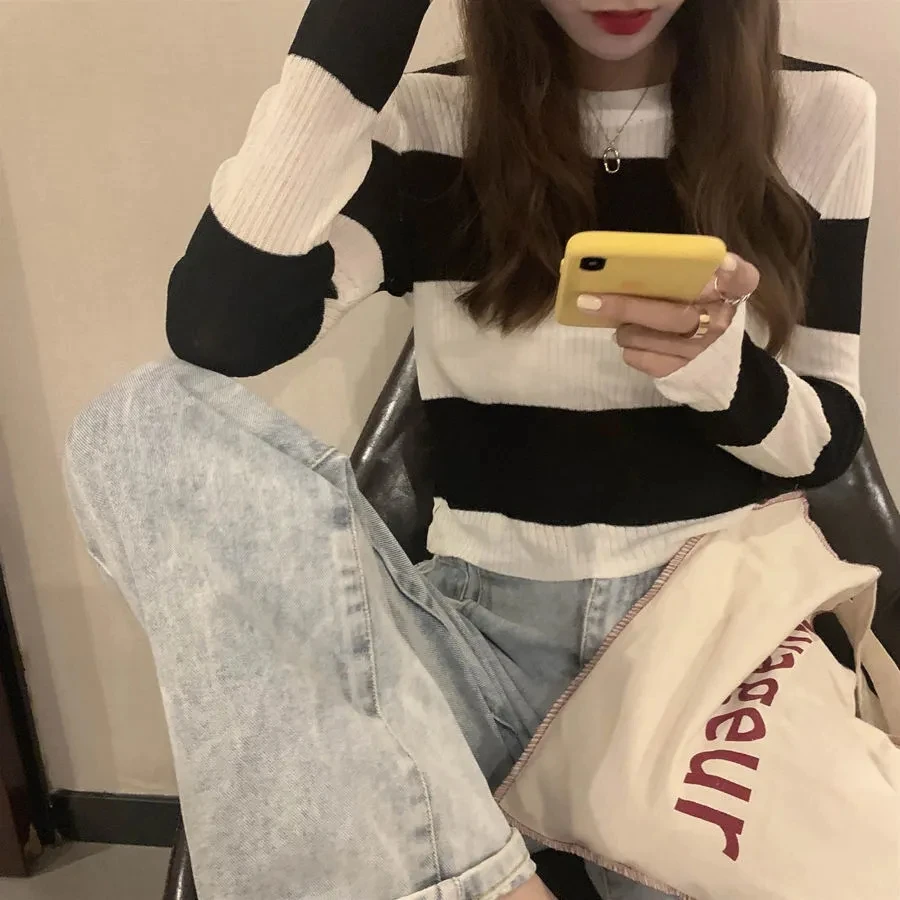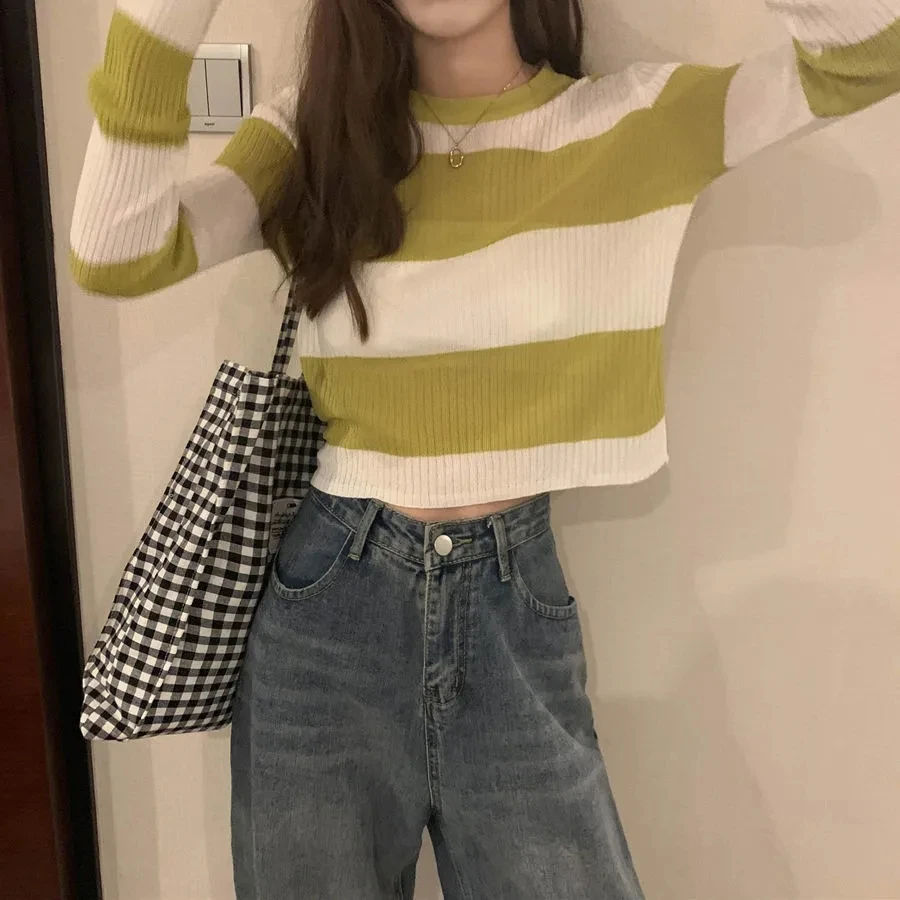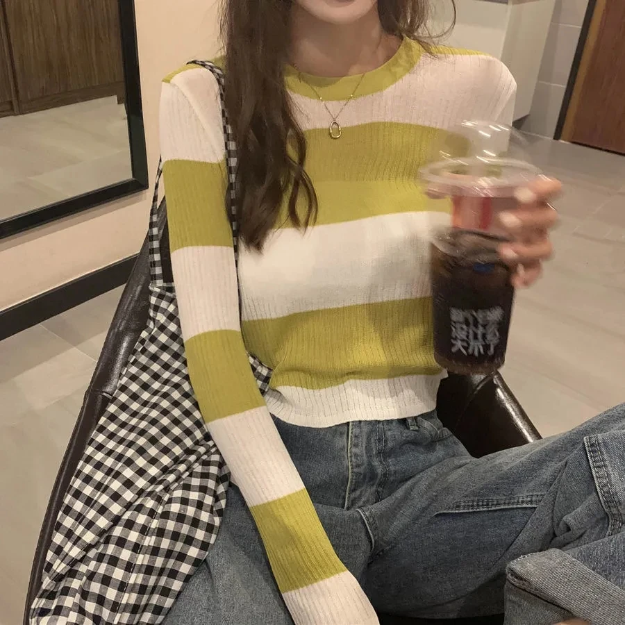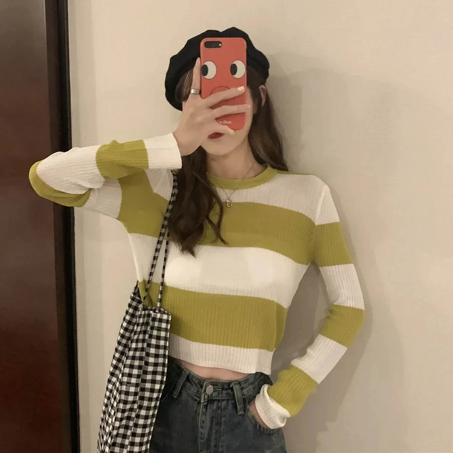 Yipinpay Spring Korean style Striped Women Sweater Long Sleeve Slim Short Womens Knitted Sweaters INS Fashion Female Pullovers