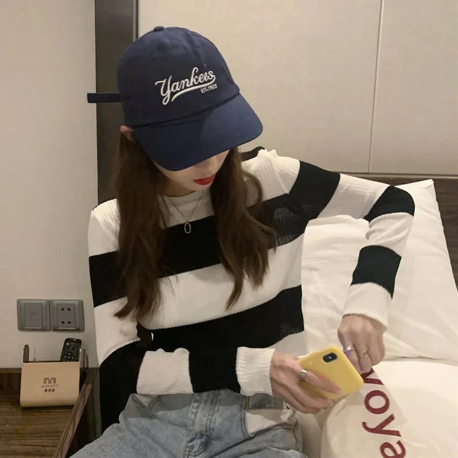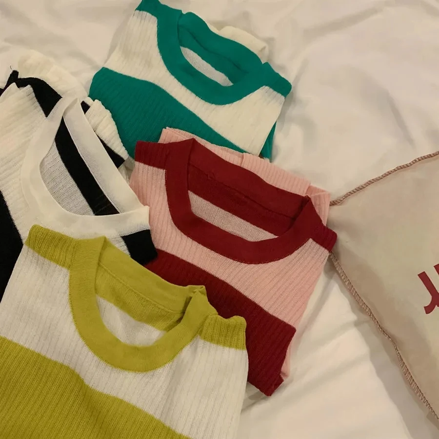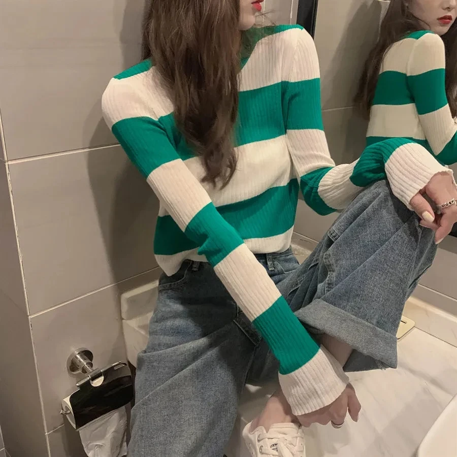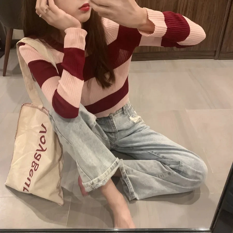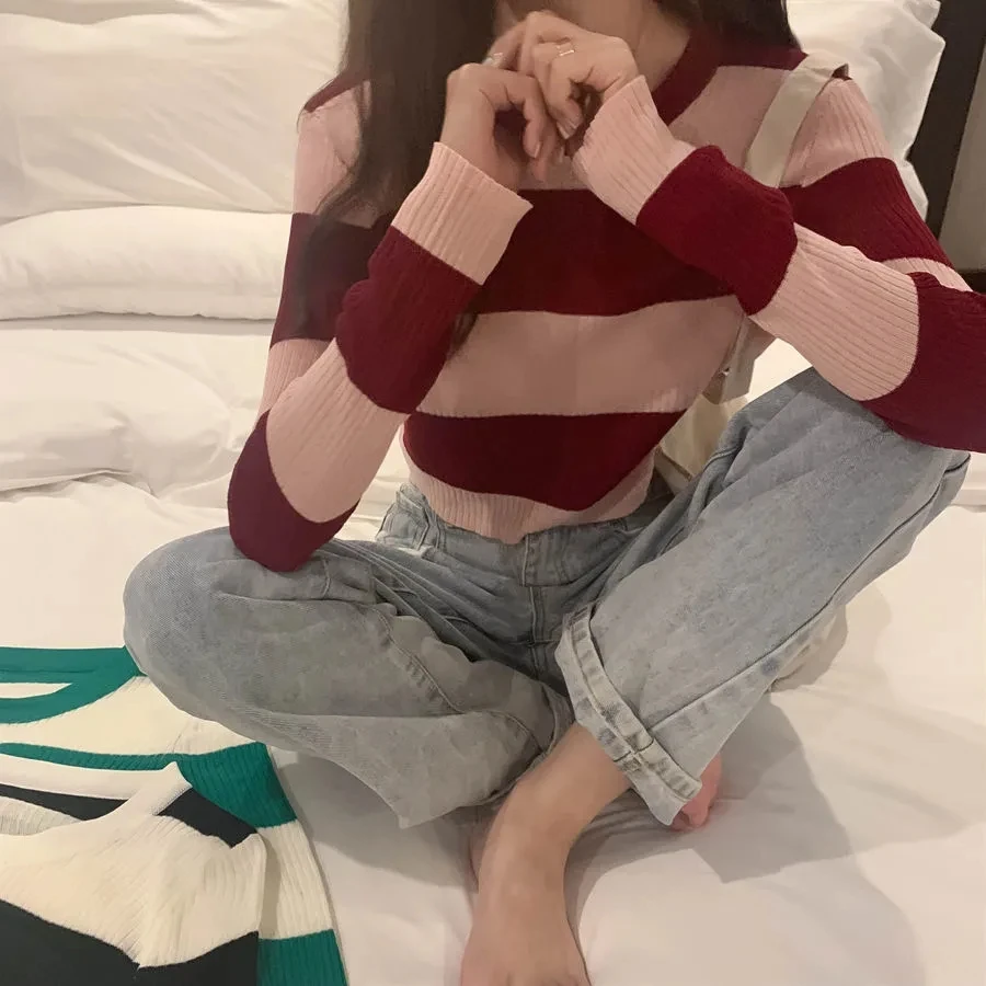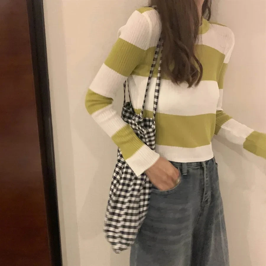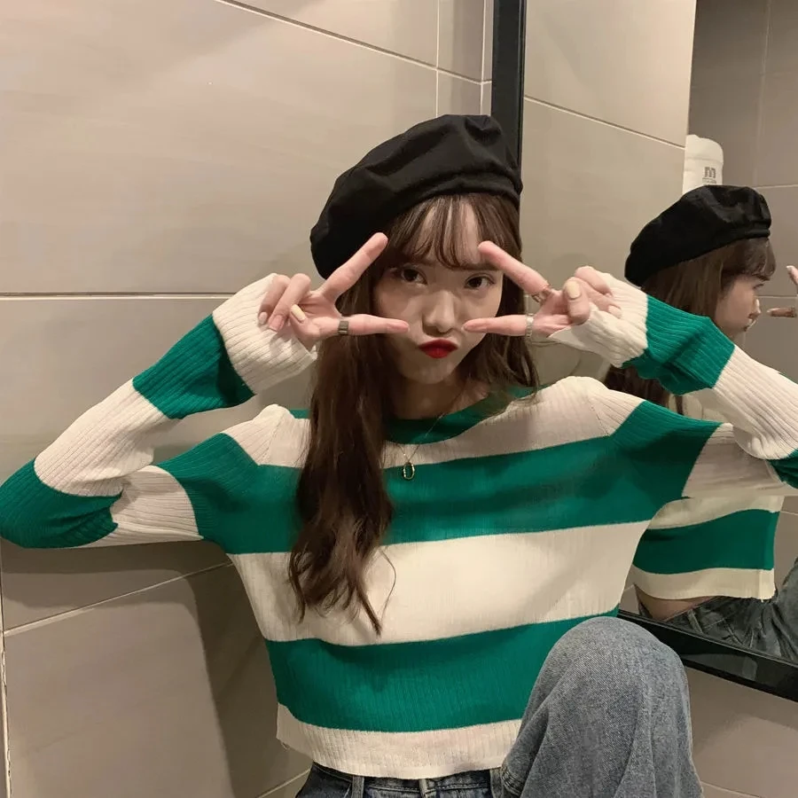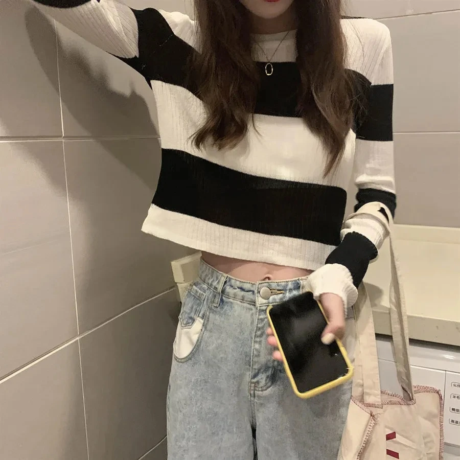 Yipinpay Spring Korean style Striped Women Sweater Long Sleeve Slim Short Womens Knitted Sweaters INS Fashion Female Pullovers