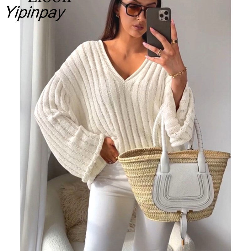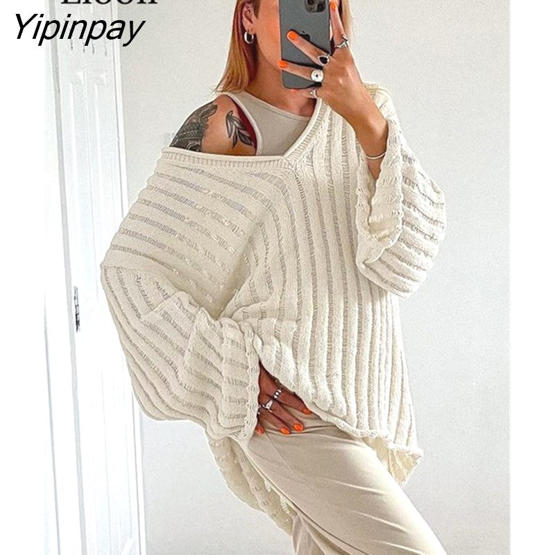 Yipinpay Women Ripped Knit Baggy Sweater Pullovers Long Sleeve Tops Female Jumper V Neck Autumn Winter Streetwear Knitted Sweaters