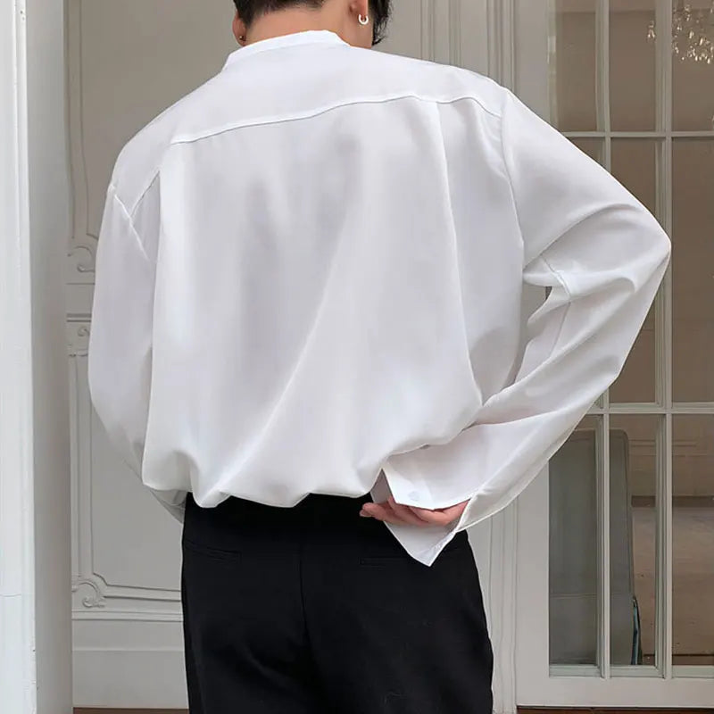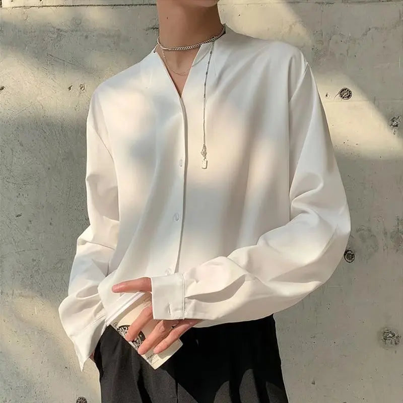 Yipinpay Autumn Men Shirt Casual Loose Long Sleeve V-Neck Shirts Streetwear Vintage Fashion Blouses Office Daily Clothing