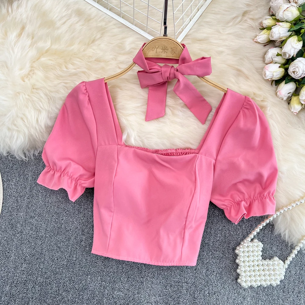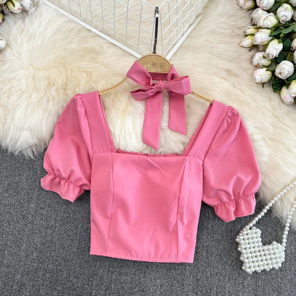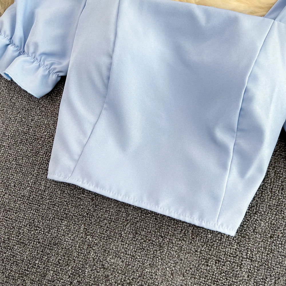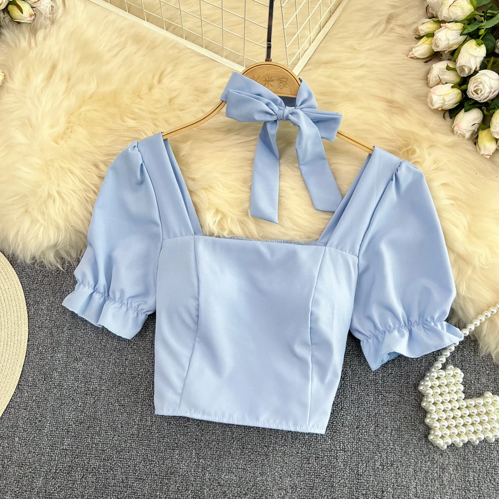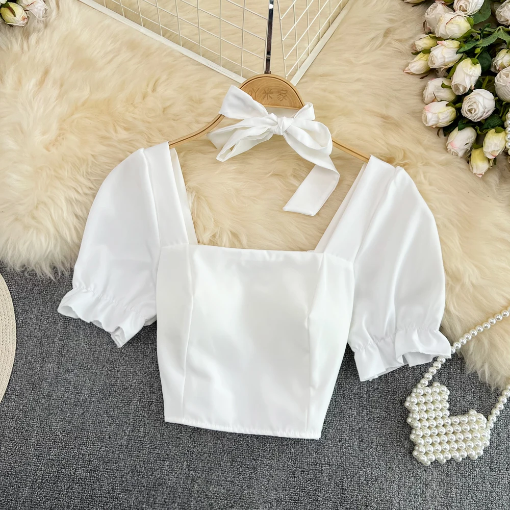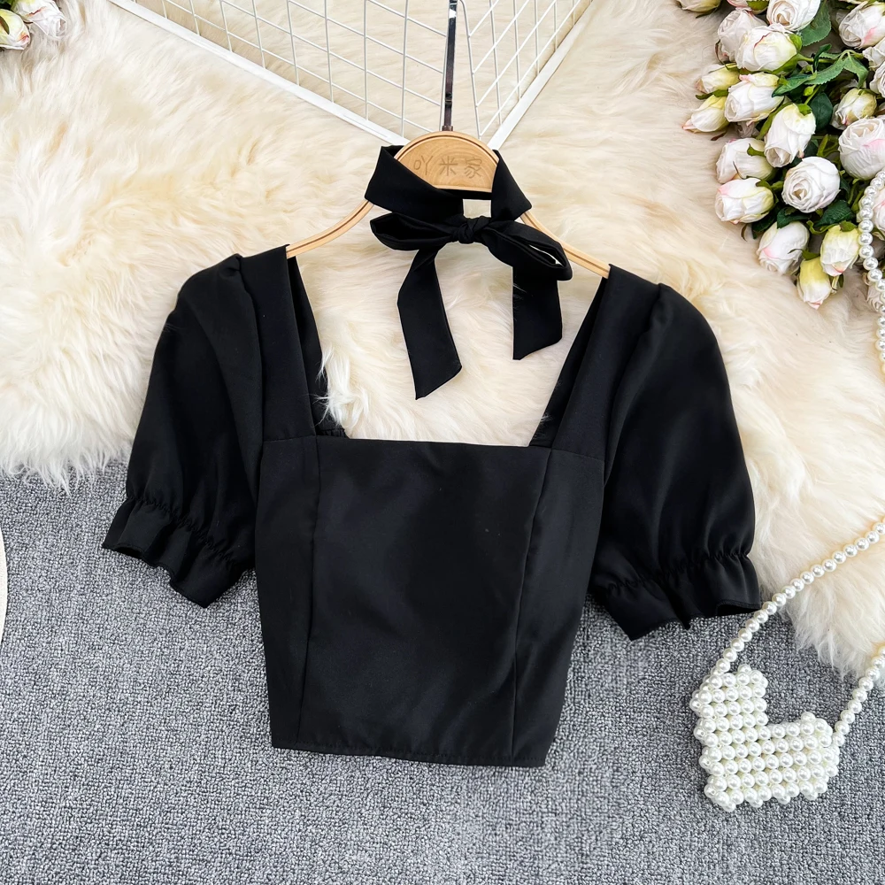 Yipinpay Korean Style Shirt For Women Sweet Square Neck Puff Short Sleeve All-Matched Pullover Shirt Femal Fashion Slim Short Top