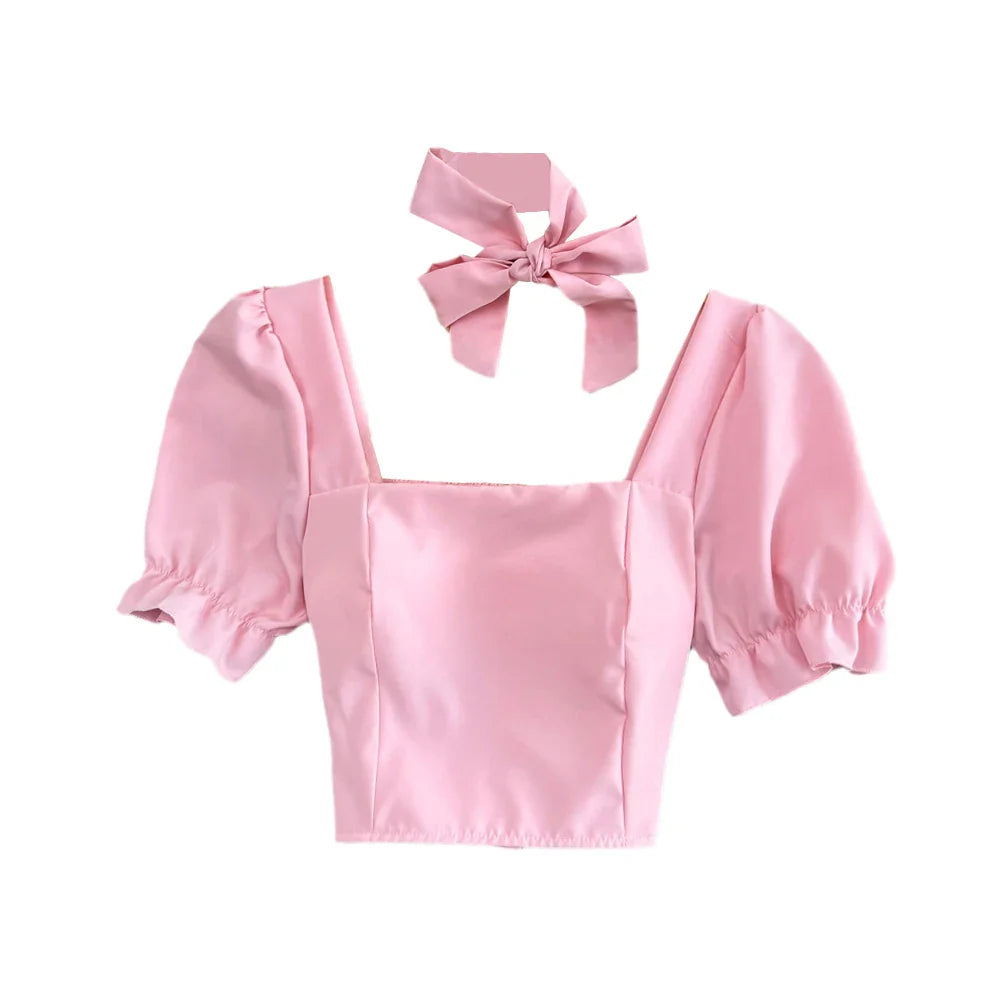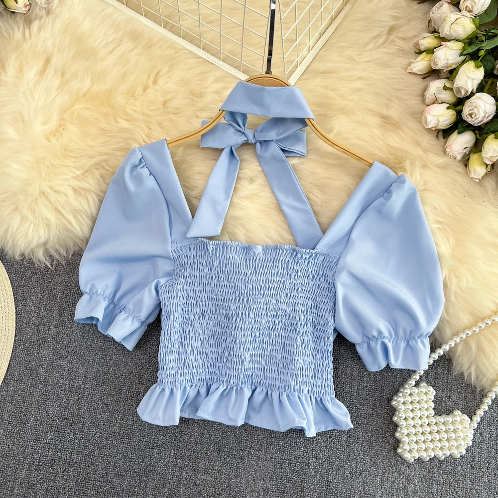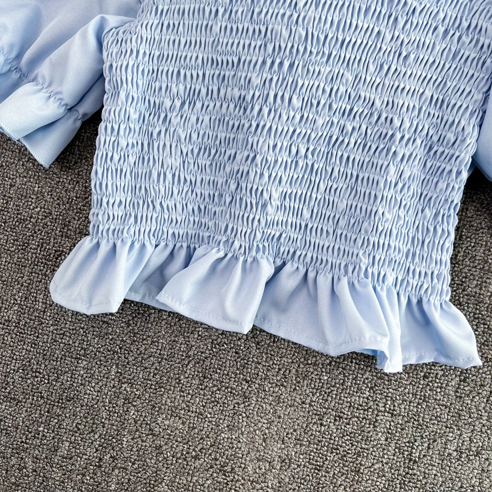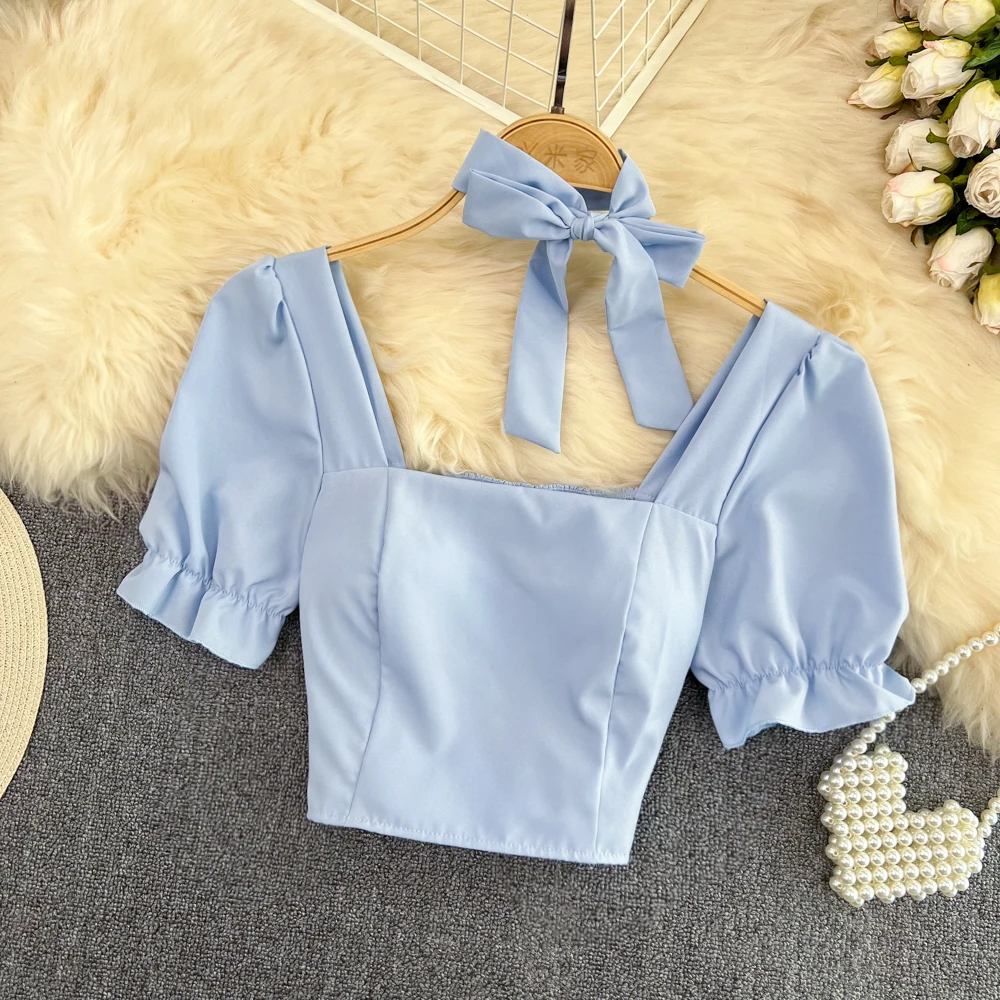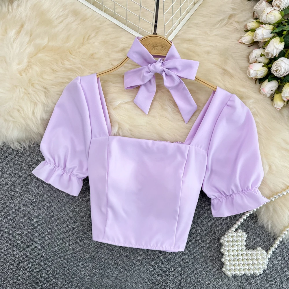 Yipinpay Korean Style Shirt For Women Sweet Square Neck Puff Short Sleeve All-Matched Pullover Shirt Femal Fashion Slim Short Top