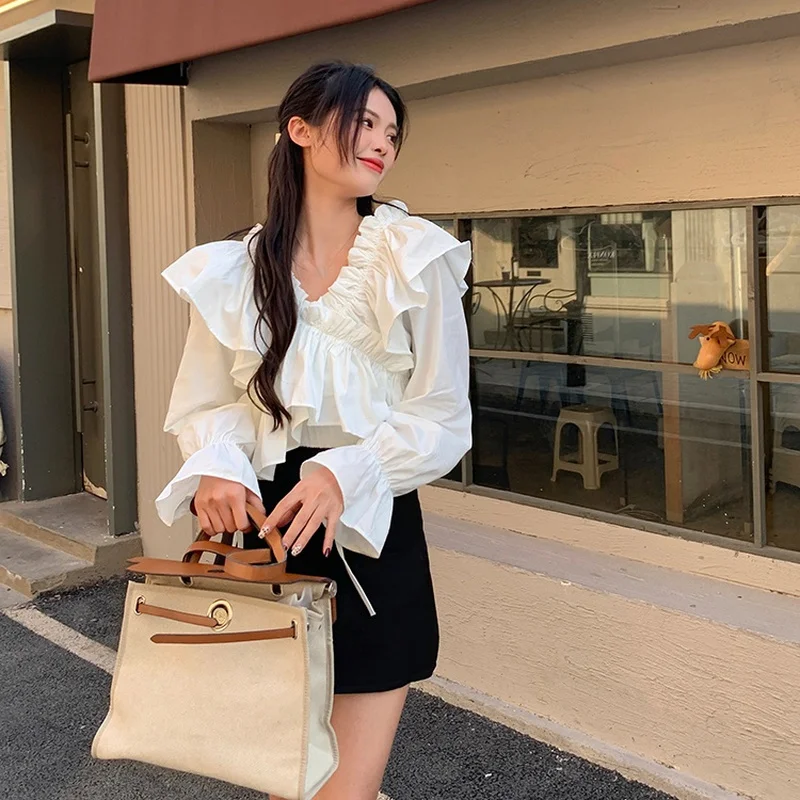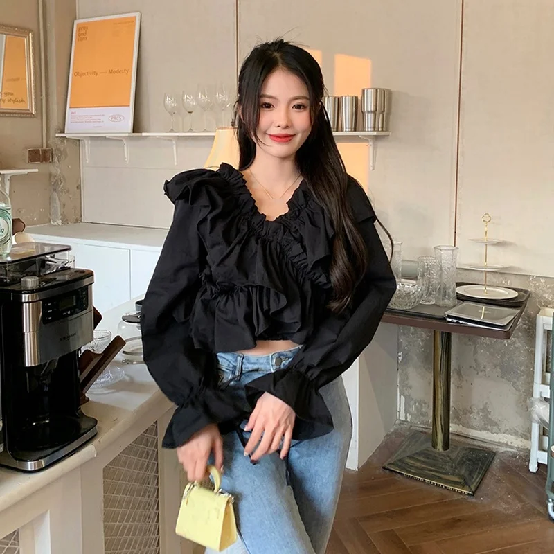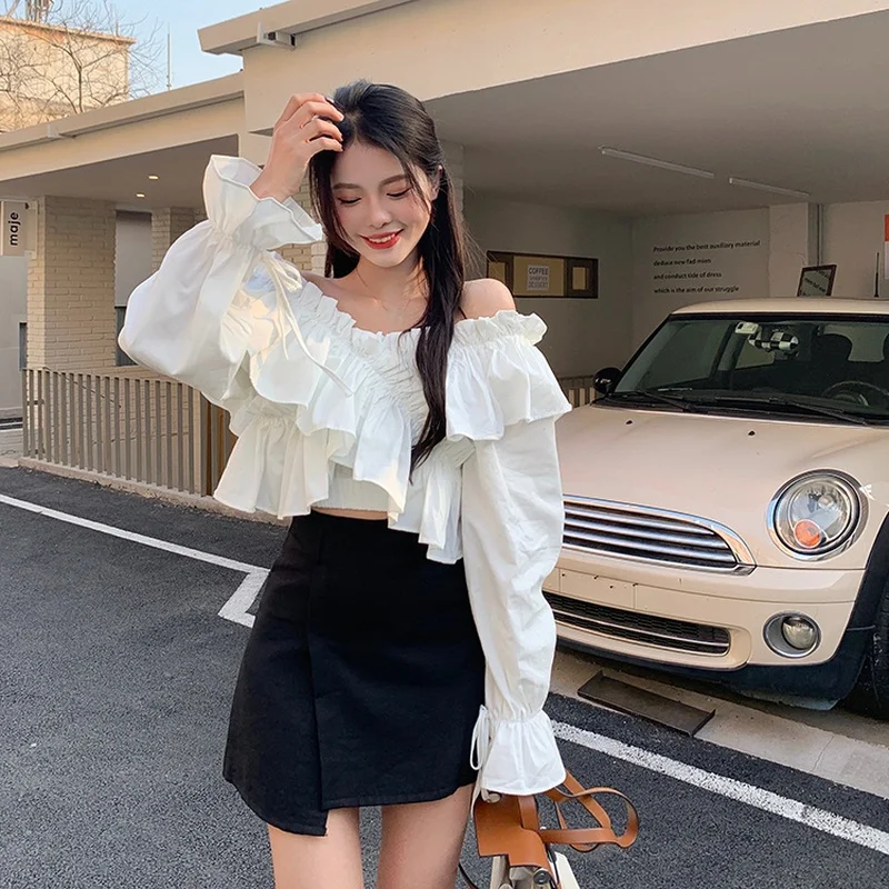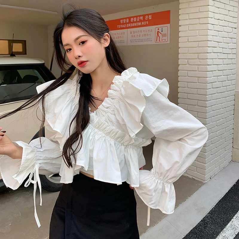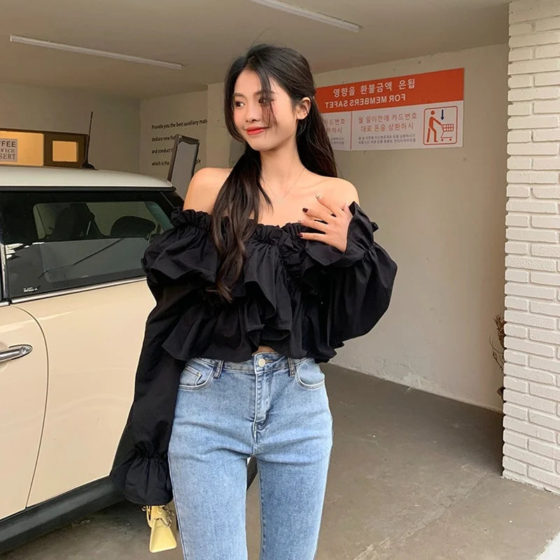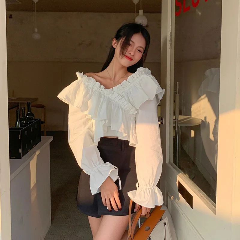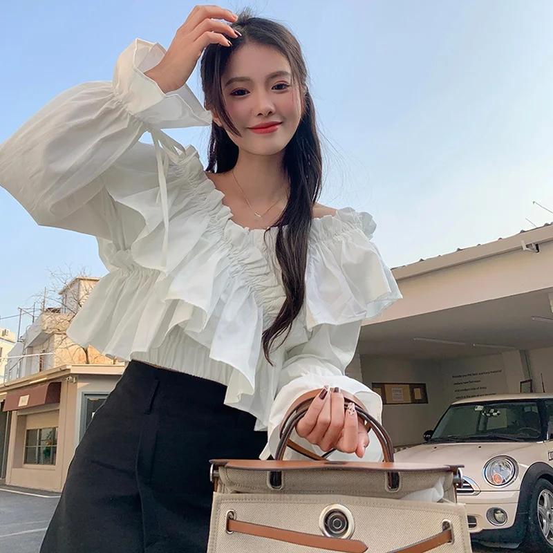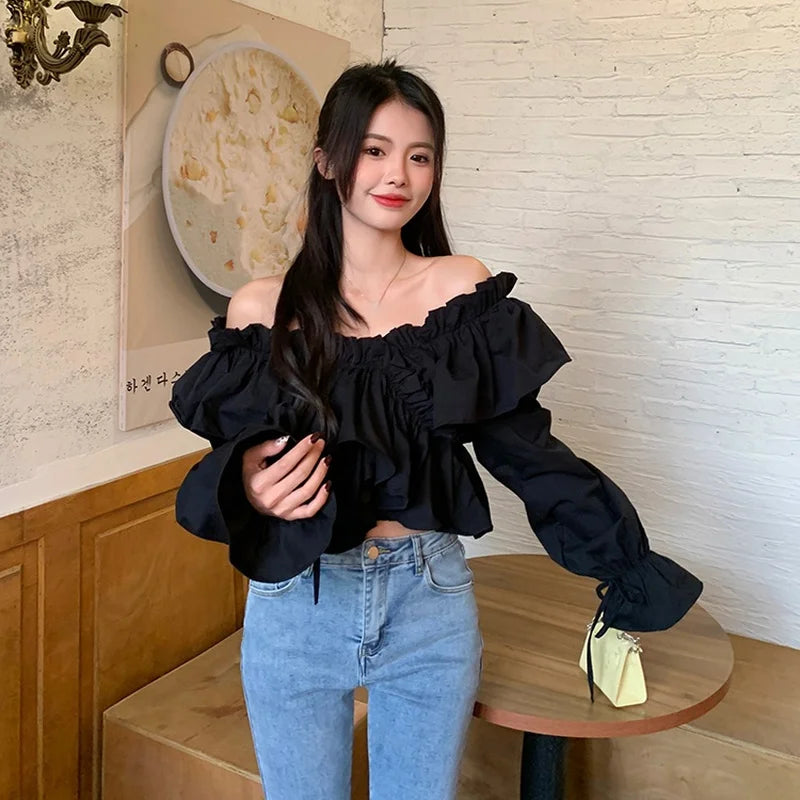 Yipinpay Off Shoulder Blouse Women Slash Neck Ruffles Crop Tops Drawstring Criss Cross V Neck Butterfly Sleeve Chic Ladies Shirts