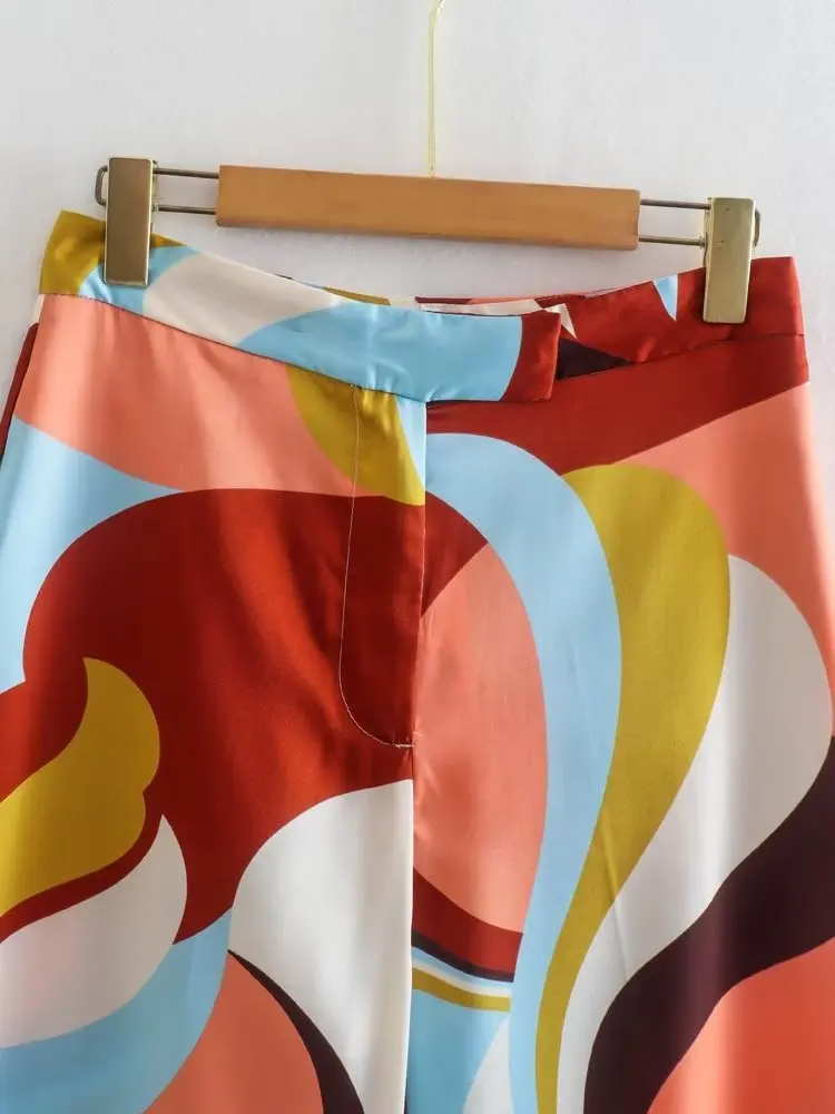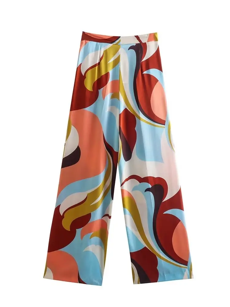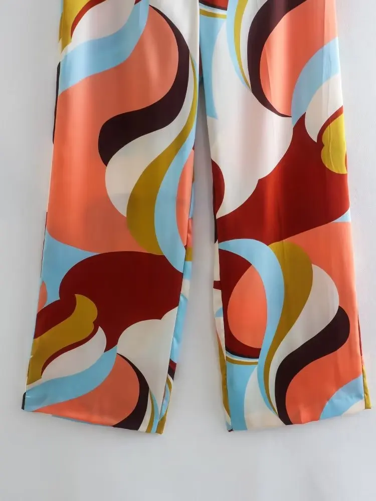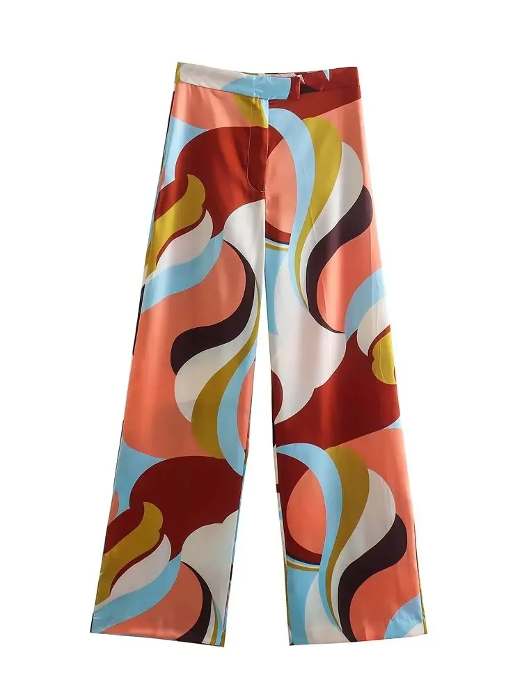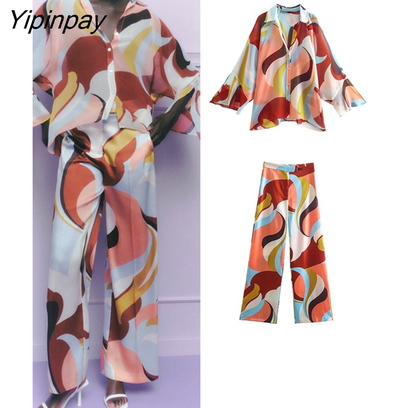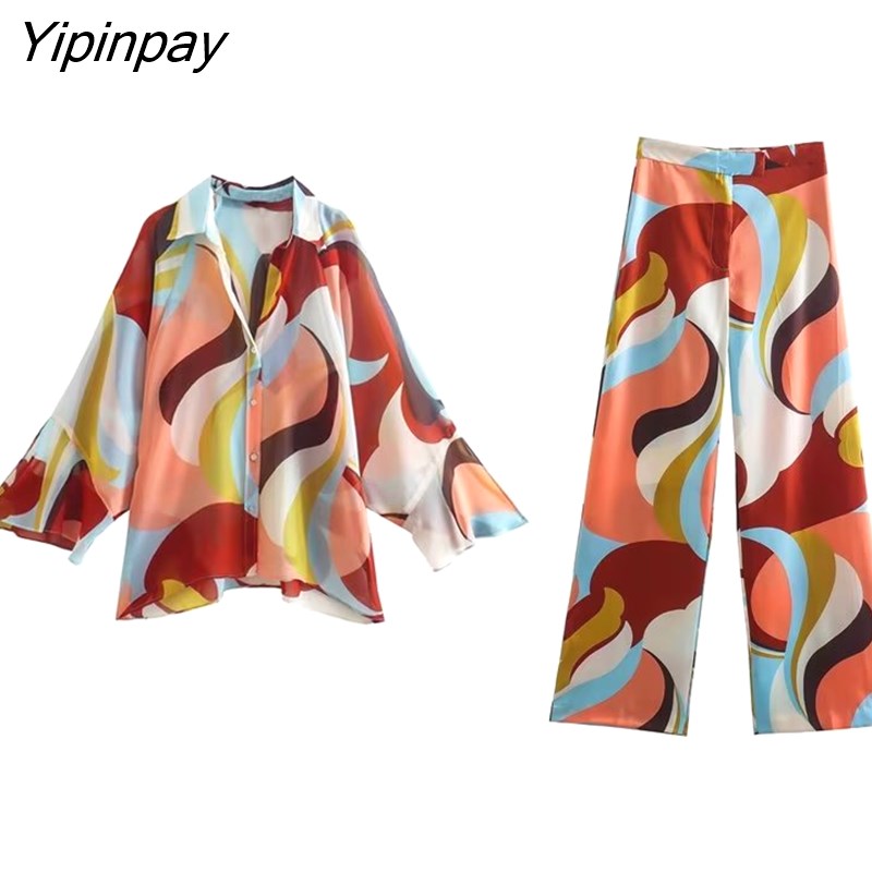 Yipinpay Women Geometric Print Pant Shirt Sets 2023 New Summer Fashion Single Breasted Blouse+Wide Leg Pants Causal Outwear