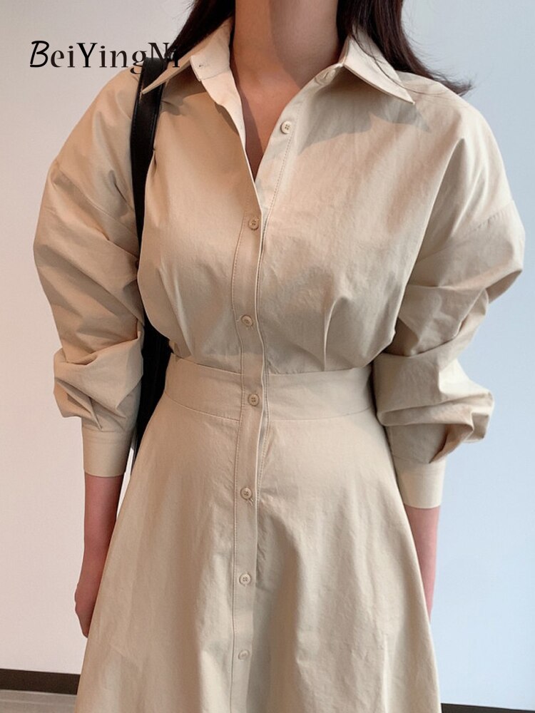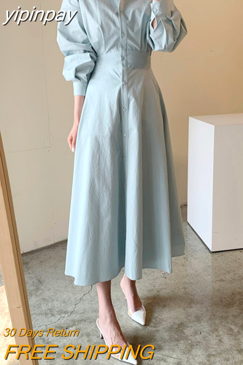 yipinpay Women's Shirts Dresses Slim Korean Chic Fashion Casual Single-breasted Long Midi Dress Office Ladies White OL Vestidos