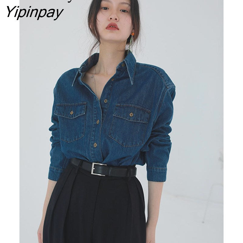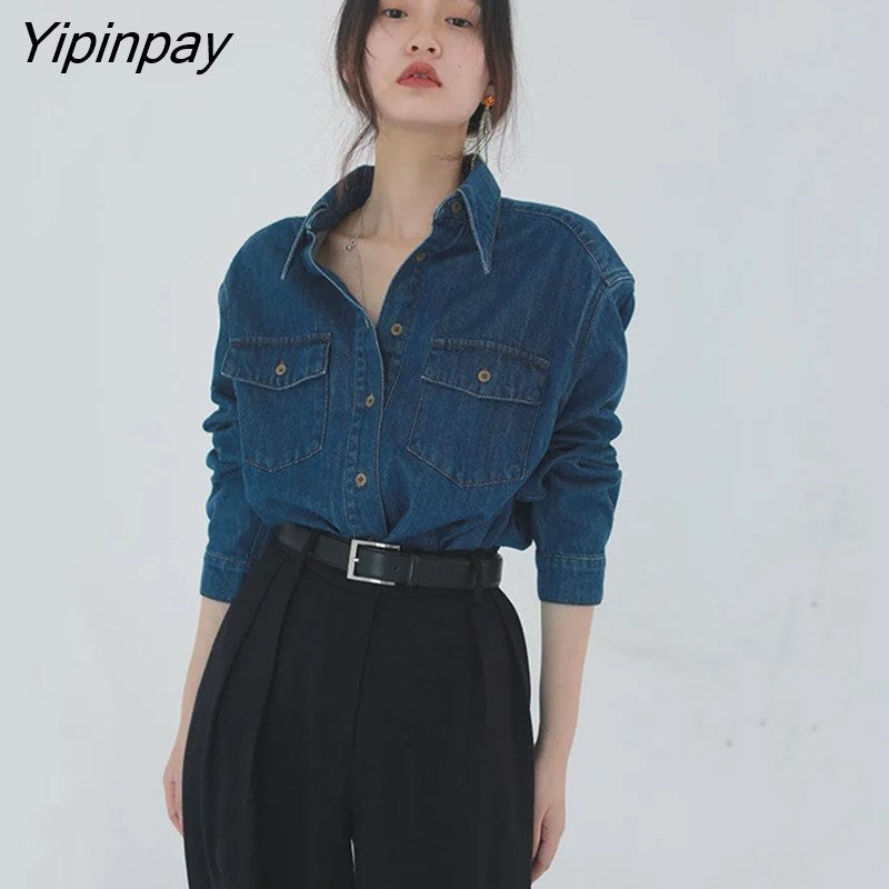 Yipinpay 2023 Autumn Fashion Street Style Long Sleeve Denim Shirt Women Casual Button Up Pocket Blouse Female Clothing Tops