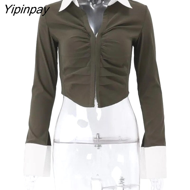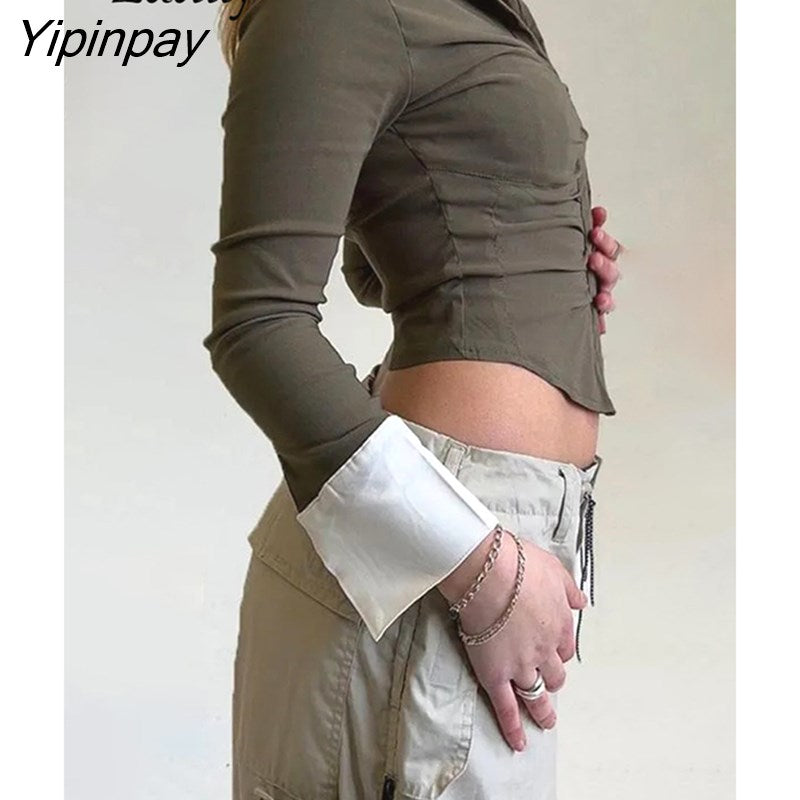 Yipinpay 2023 Autumn Long Sleeve Strecth Shirt Women Sexy Patchwork Slim Ladies Crop Tops Korean Style Female Clothing Blouse