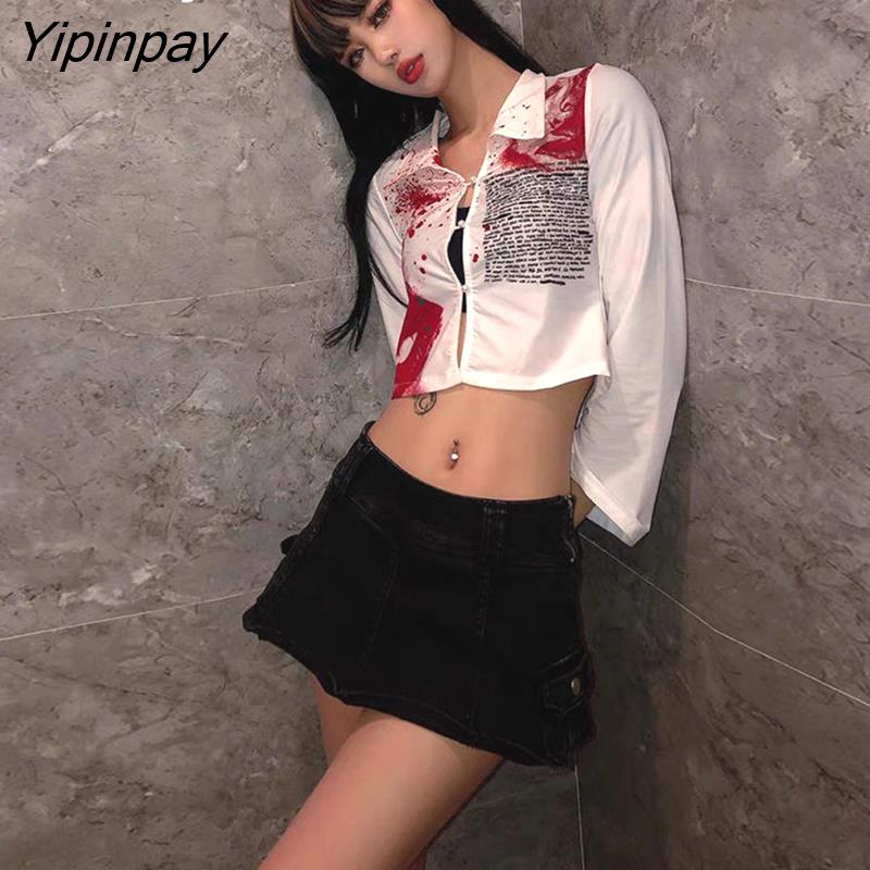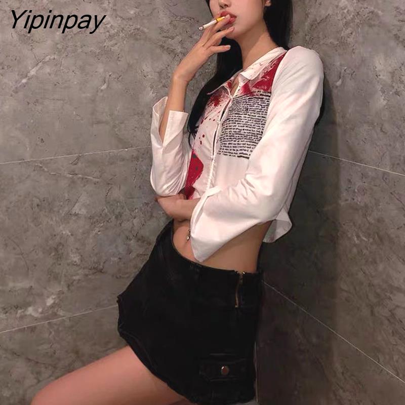 Yipinpay 2023 Autumn Street Style Slim Long Sleeve Print Women Short Shirt Sexy Button Ladies Crop Top Party Blouse New In Clothing