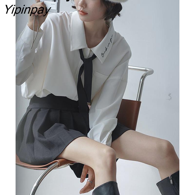 Yipinpay 2023 Spring Minimalist Long Sleeve Embroidery Shirt Women Korean Style Solid Tie Oversize Shirts Blouse Loose JK Tops